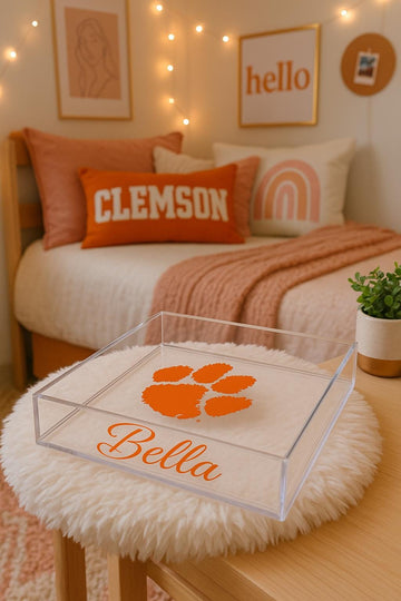 These stylish acrylic trays can be personalized with different colors and design options for college gifts such as high school graduation, college graduation, college acceptance. They can also be monogrammed for the perfect aesthetic. They are also an amazing gift for a roommate or sorority gift as dorm decor and college bed party.Â