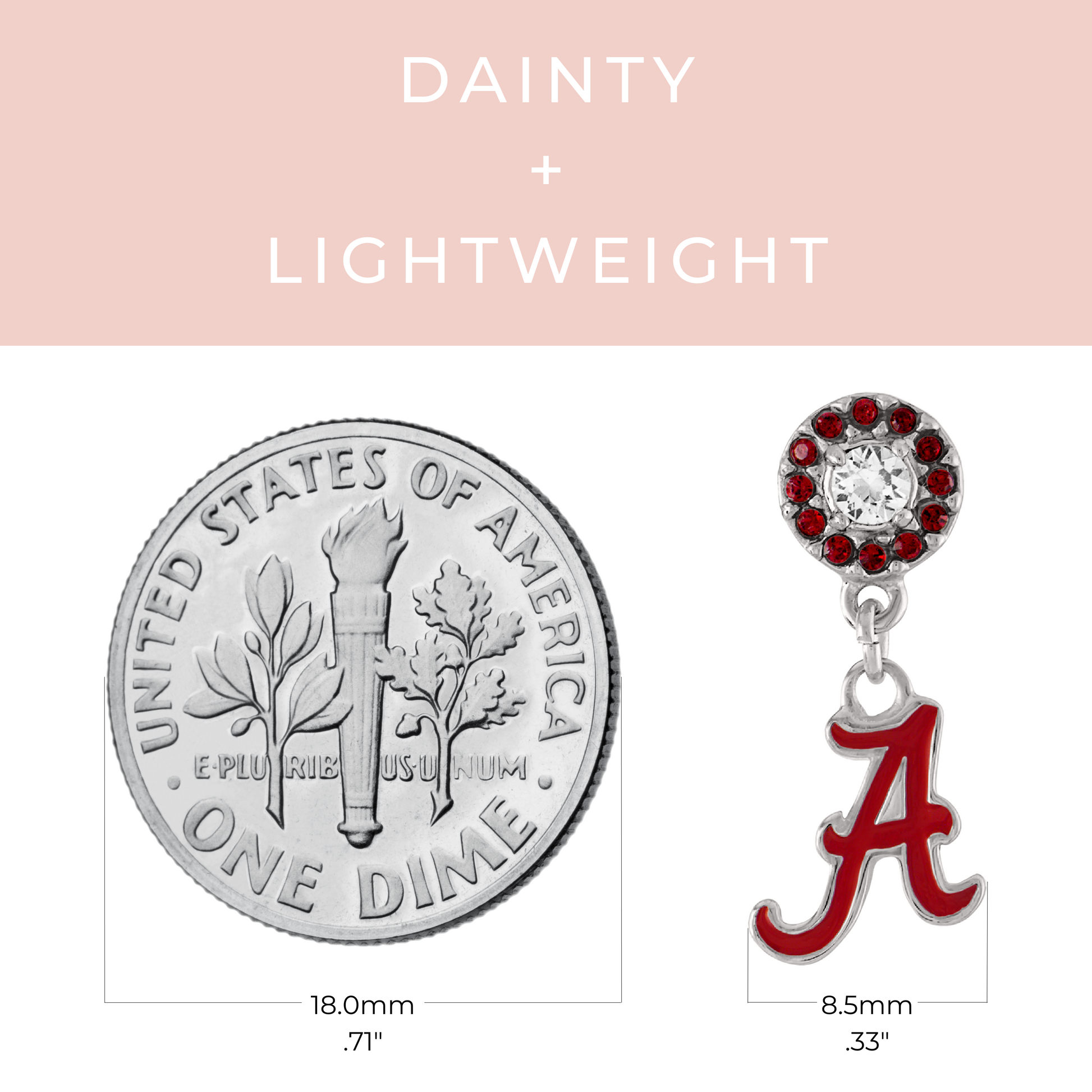 - Your Perfect Fit - These UA crystal earrings are always the perfect fit. Show off your beloved Alabama Crimson Tide football team and school with these statement earrings! Each dainty earring measures 15.05mm wide x 20.48mm long.