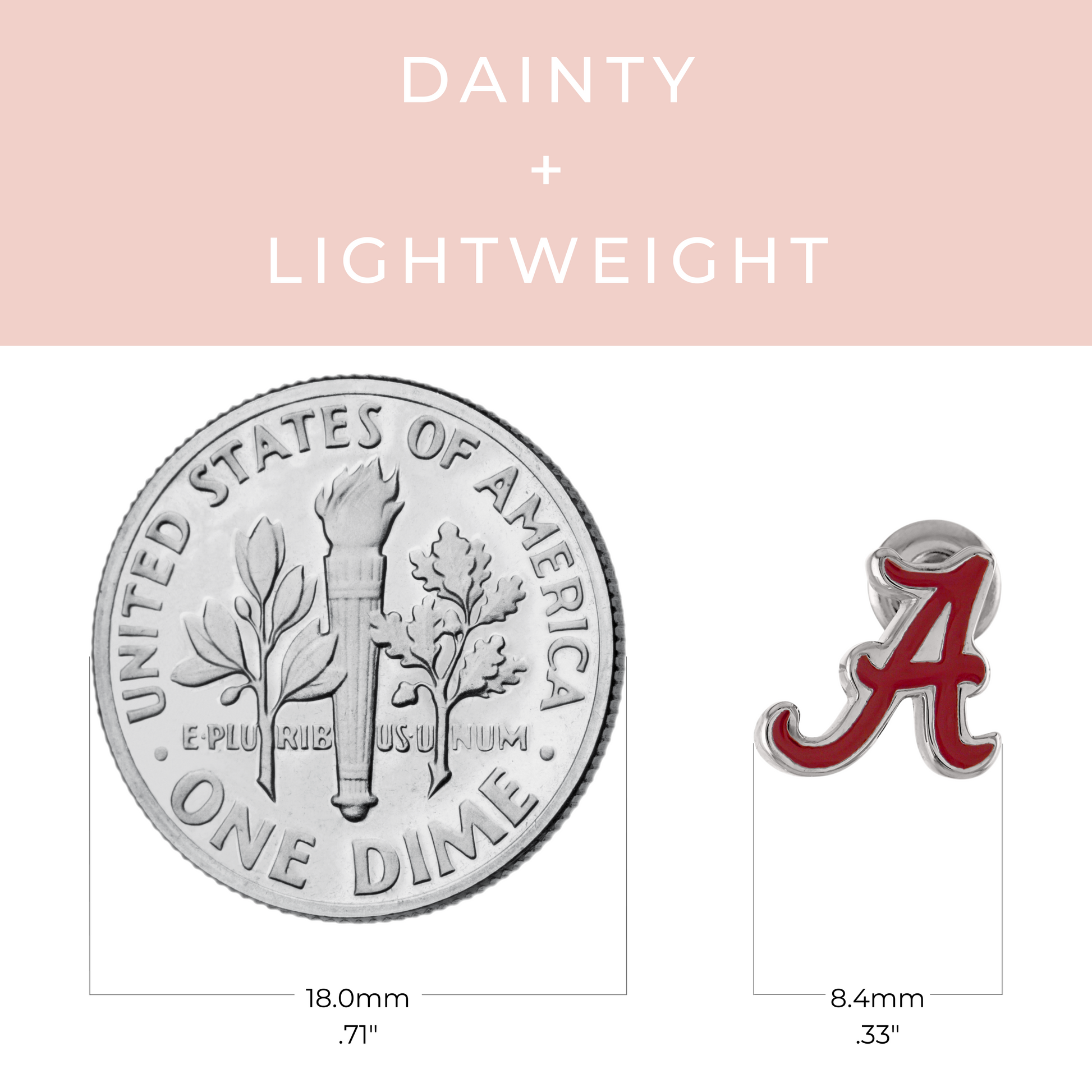 - Your Perfect Fit - These UA earring studs are always the perfect fit. Show off your beloved Alabama Crimson Tide football team and school with these statement earrings! Each dainty earring measures 8.35mm wide x 7.97mm tall.