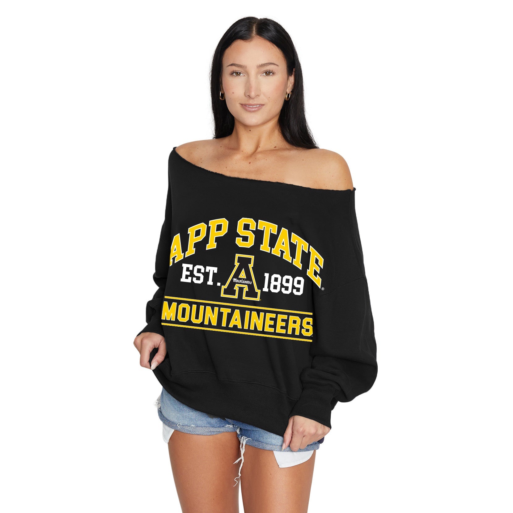 This super flattering App State Off the Shoulder Oversized Sweatshirt is perfect for college game day or class. Our App State Sweatshirts's ultra soft fabric makes it the most comfortable sweatshirt to wear anytime. Go Mountaineers!