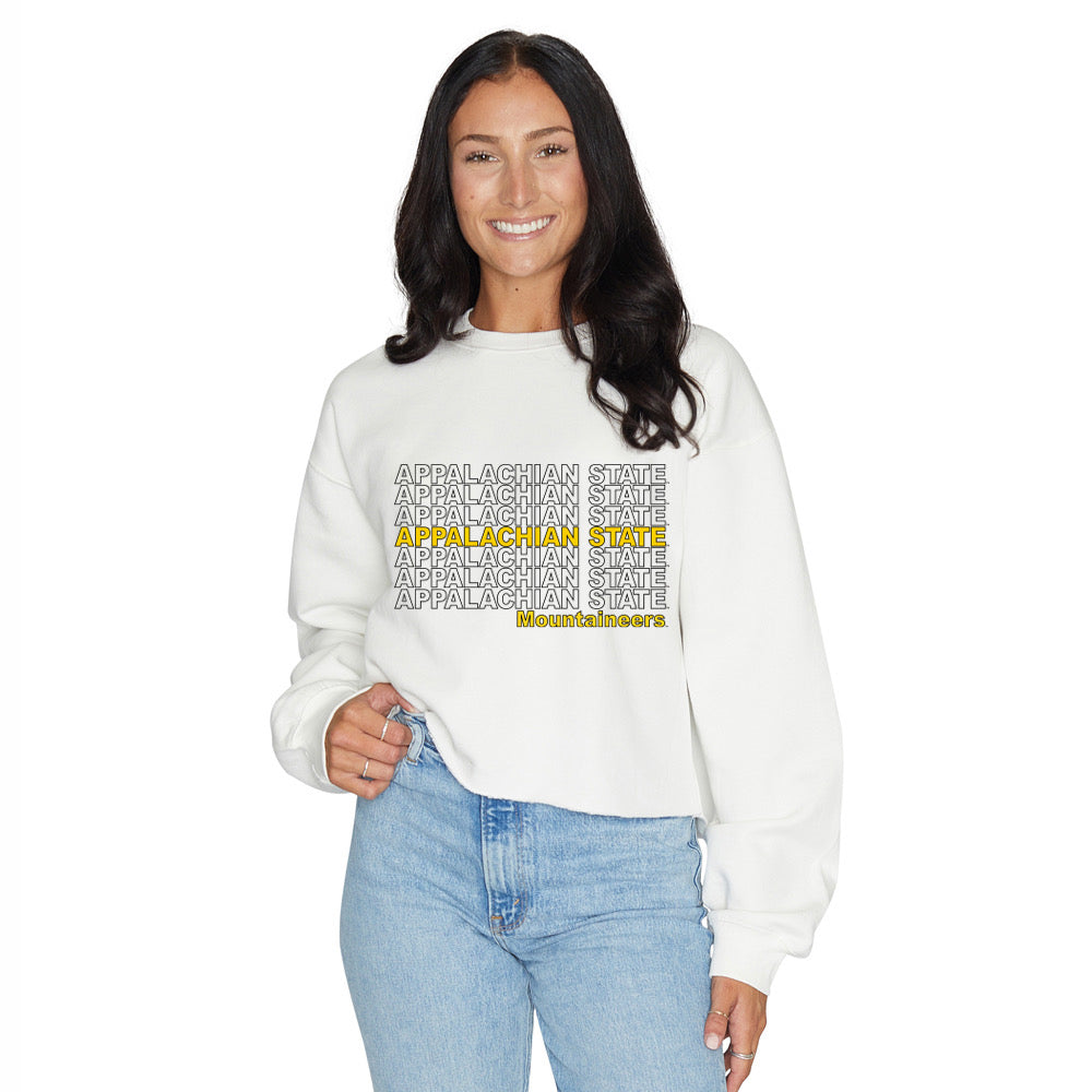 App State Repeat Crewneck - trendy and tailgate ready! So cozy you will want to live in this sweatshirt! Model in App State Sweatshirt is 5'5 and wearing a size Medium. Complete your outfit by pairing with our Black Tailgate Skirt!