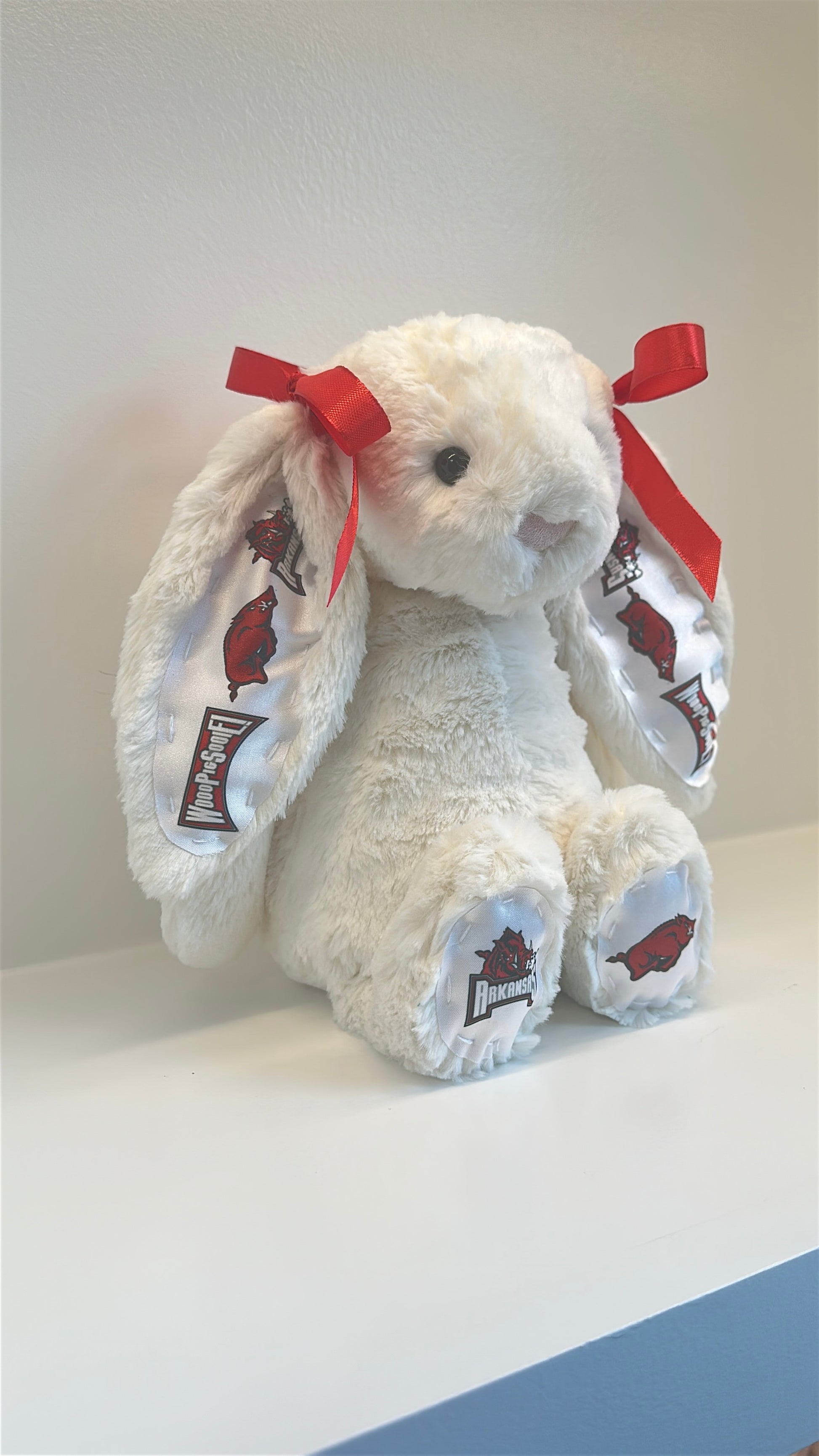 Snuggle up with this Custom College Jellycat Bashful Bunny. Each plush is adorned with custom licensed fabric for your selected school, featuring coordinated ears, feet, and matching bows that bring your university’s colors and spirit to life. This adorable plush makes the perfect gift for newly accepted students, homesick college kids, devoted fans, alumni, and anyone who wants a cozy reminder of campus life.