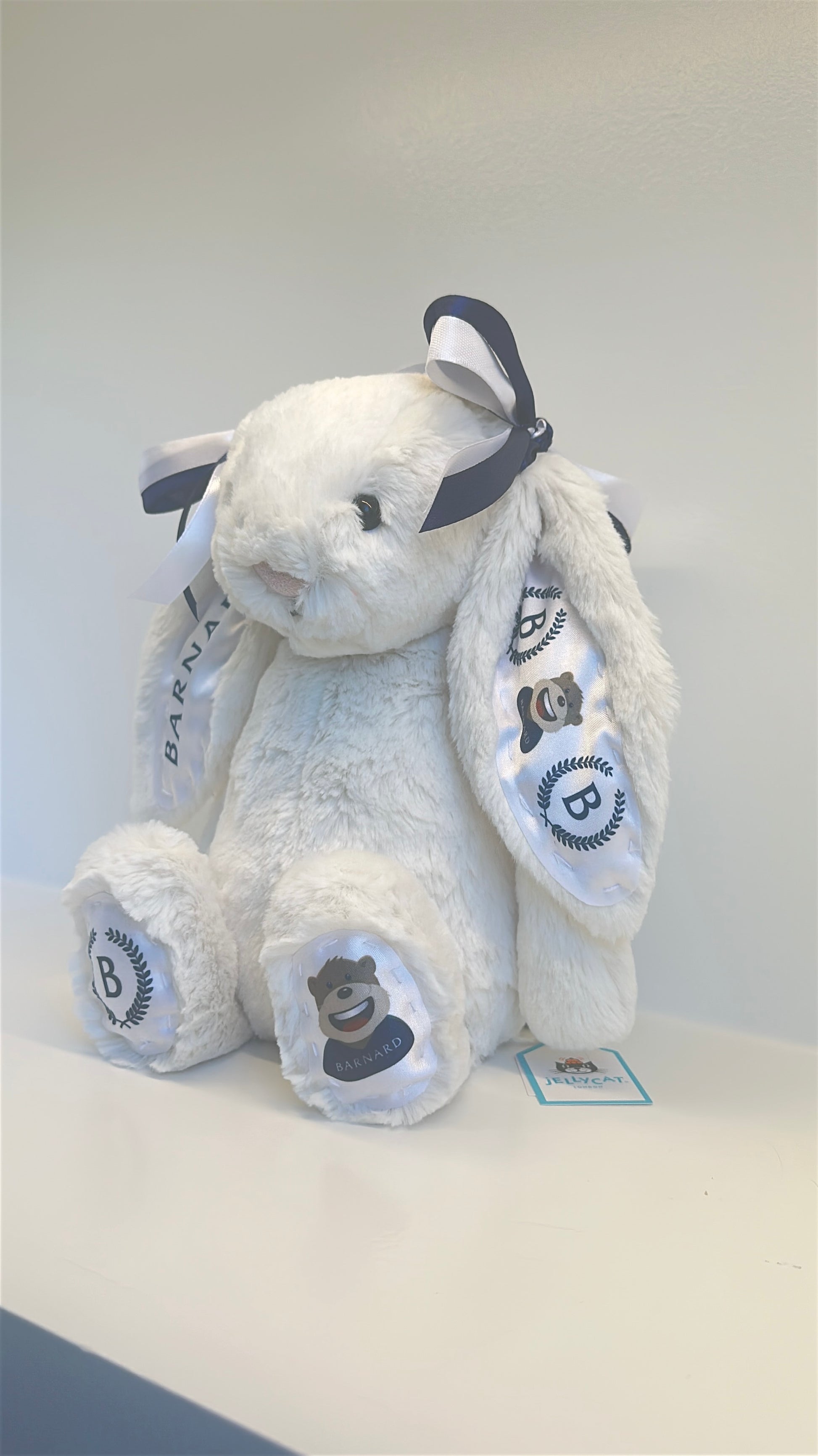 Snuggle up with this Custom College Jellycat Bashful Bunny. Each plush is adorned with a design especially for Barnard, featuring coordinated ears, feet, and matching bows that bring your university’s colors and spirit to life. This adorable plush makes the perfect gift for newly accepted students, homesick college kids, devoted fans, alumni, and anyone who wants a cozy reminder of campus life.