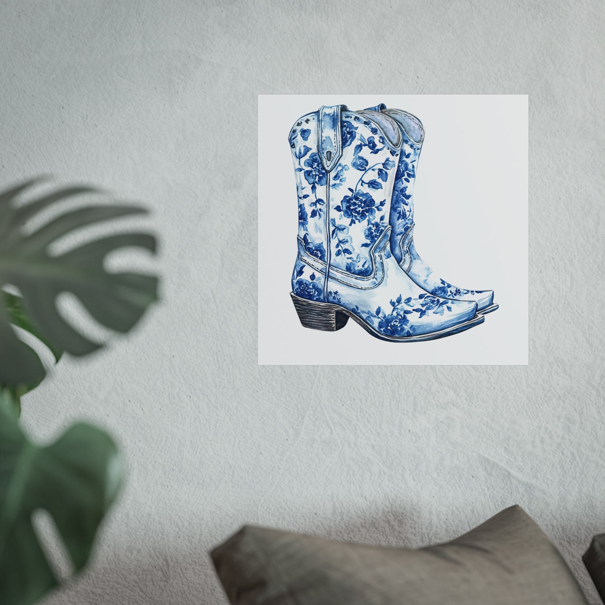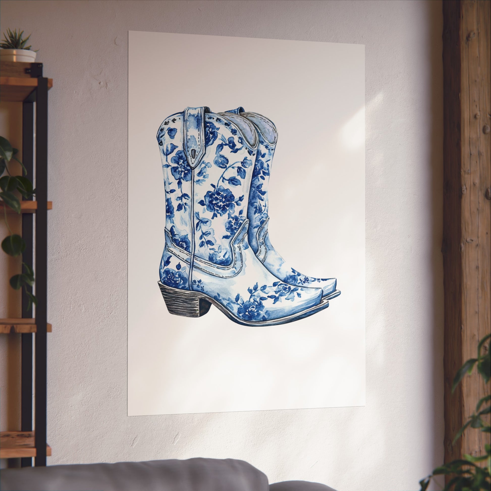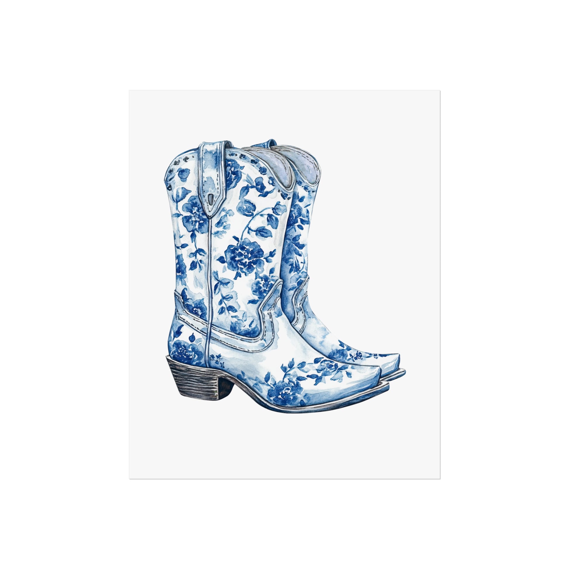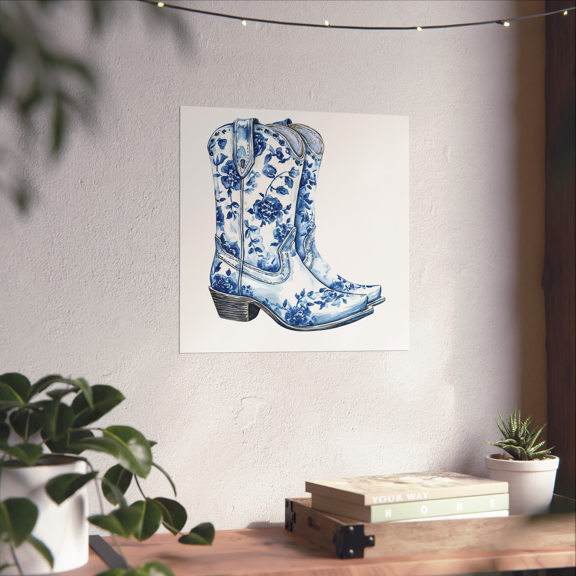 Blue Floral Cowboy Boots Art Print, Dorm Room Decor Rustic Home Art, Gift for Cowgirl, Country Decor, Bohemian Style