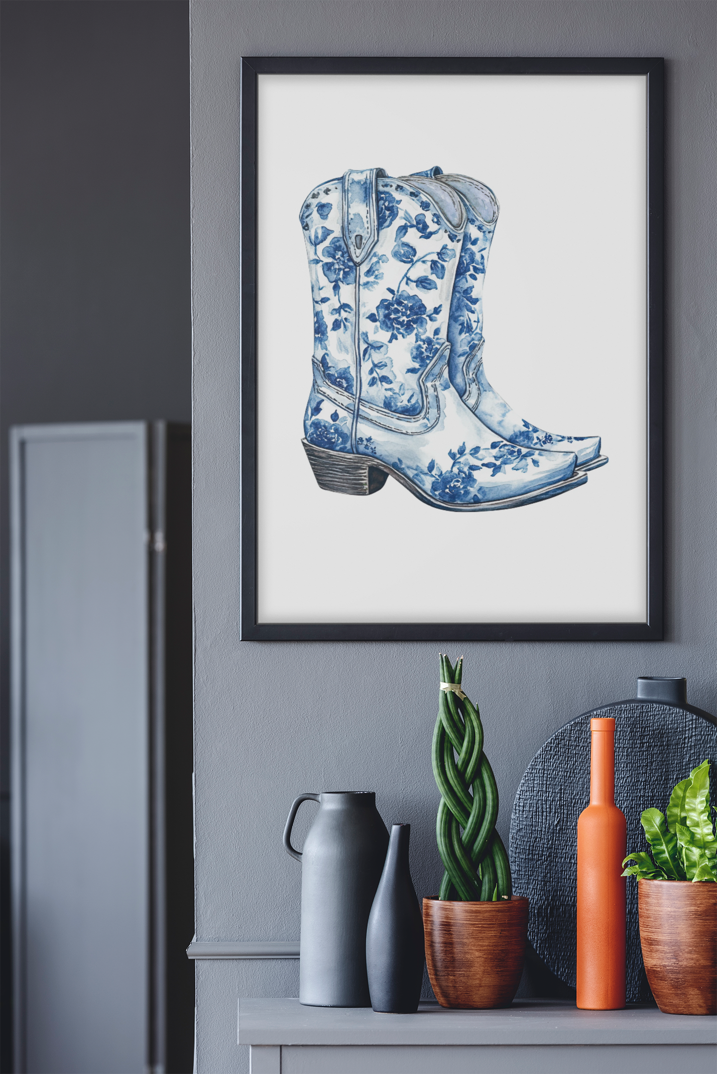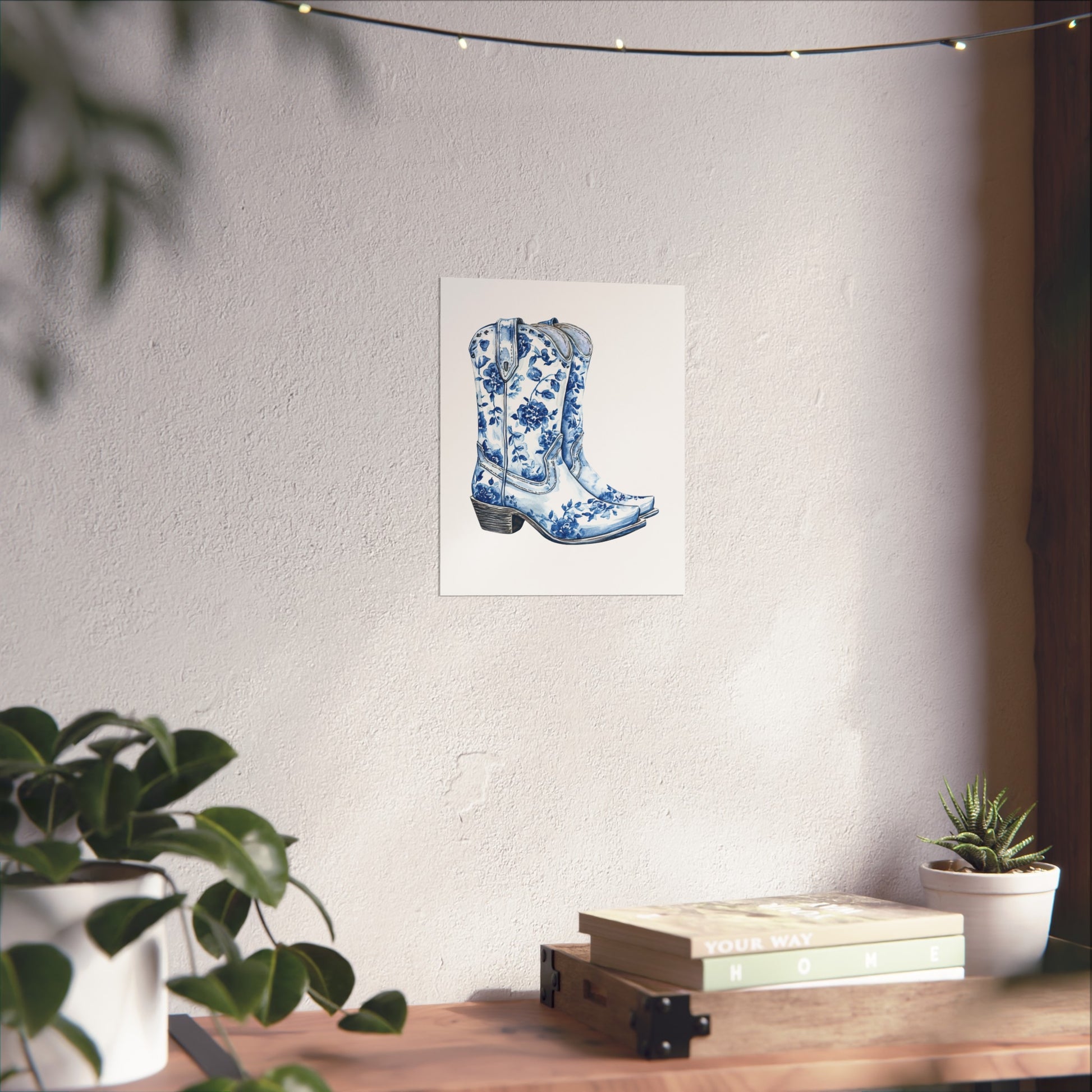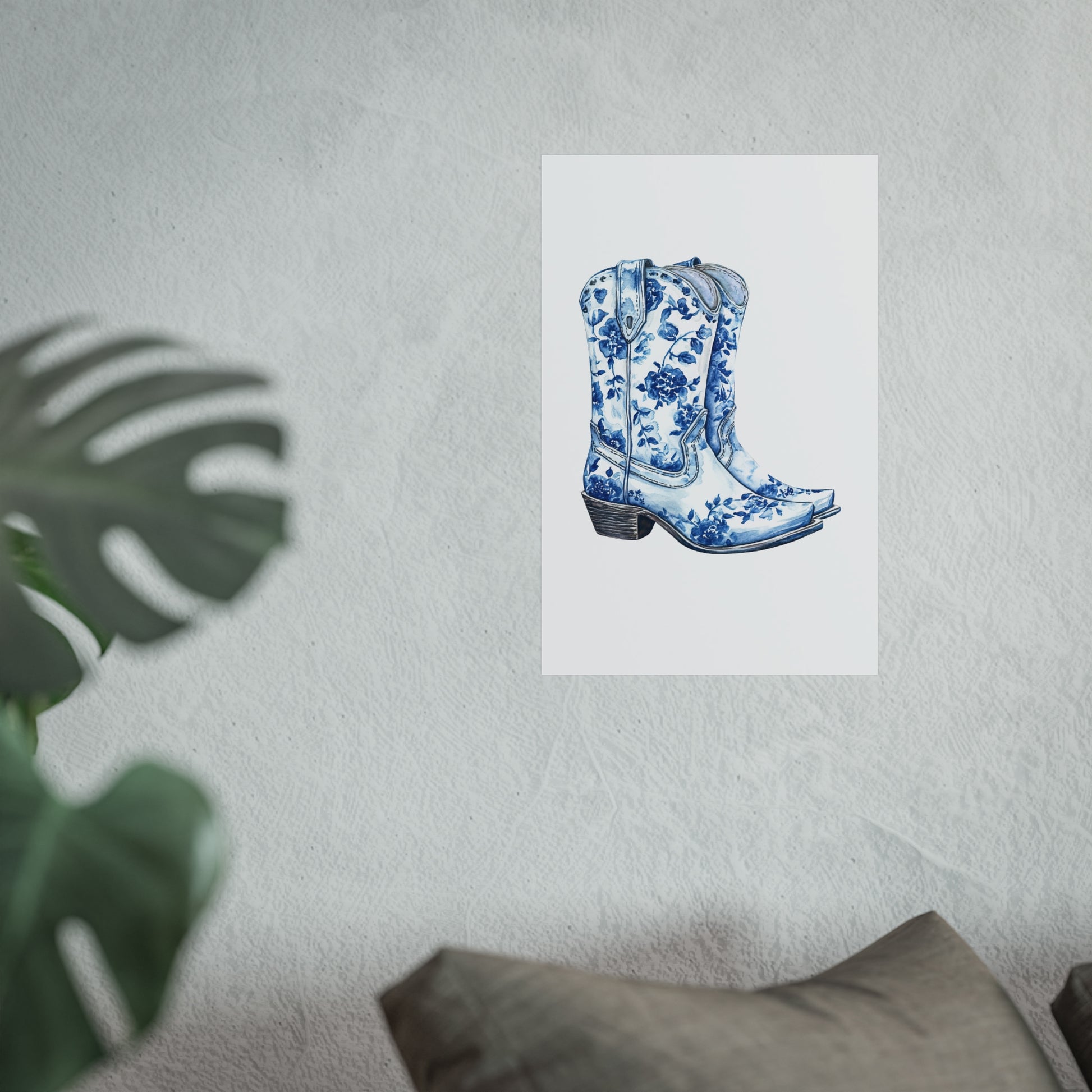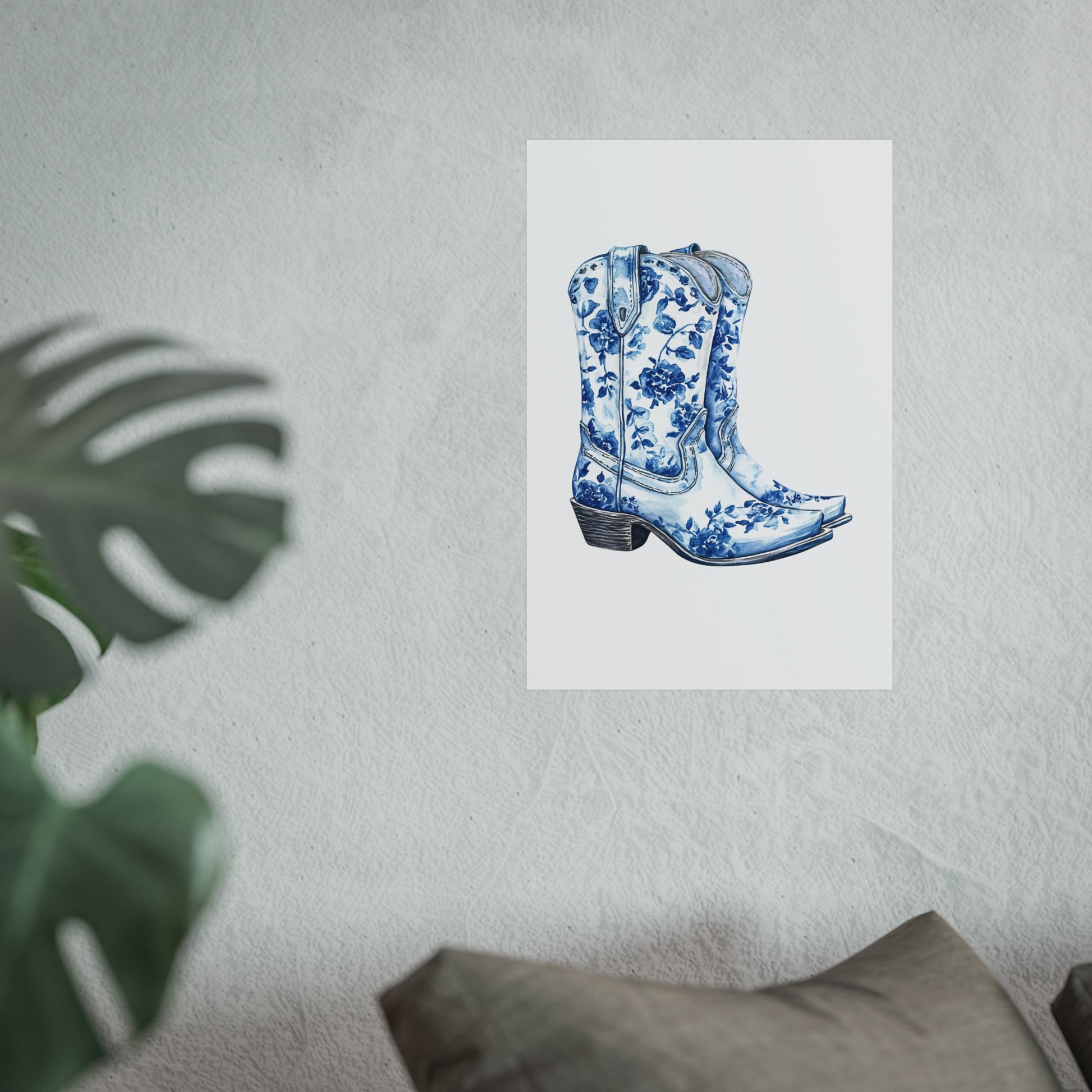 Blue Floral Cowboy Boots Art Print, Dorm Room Decor Rustic Home Art, Gift for Cowgirl, Country Decor, Bohemian Style
