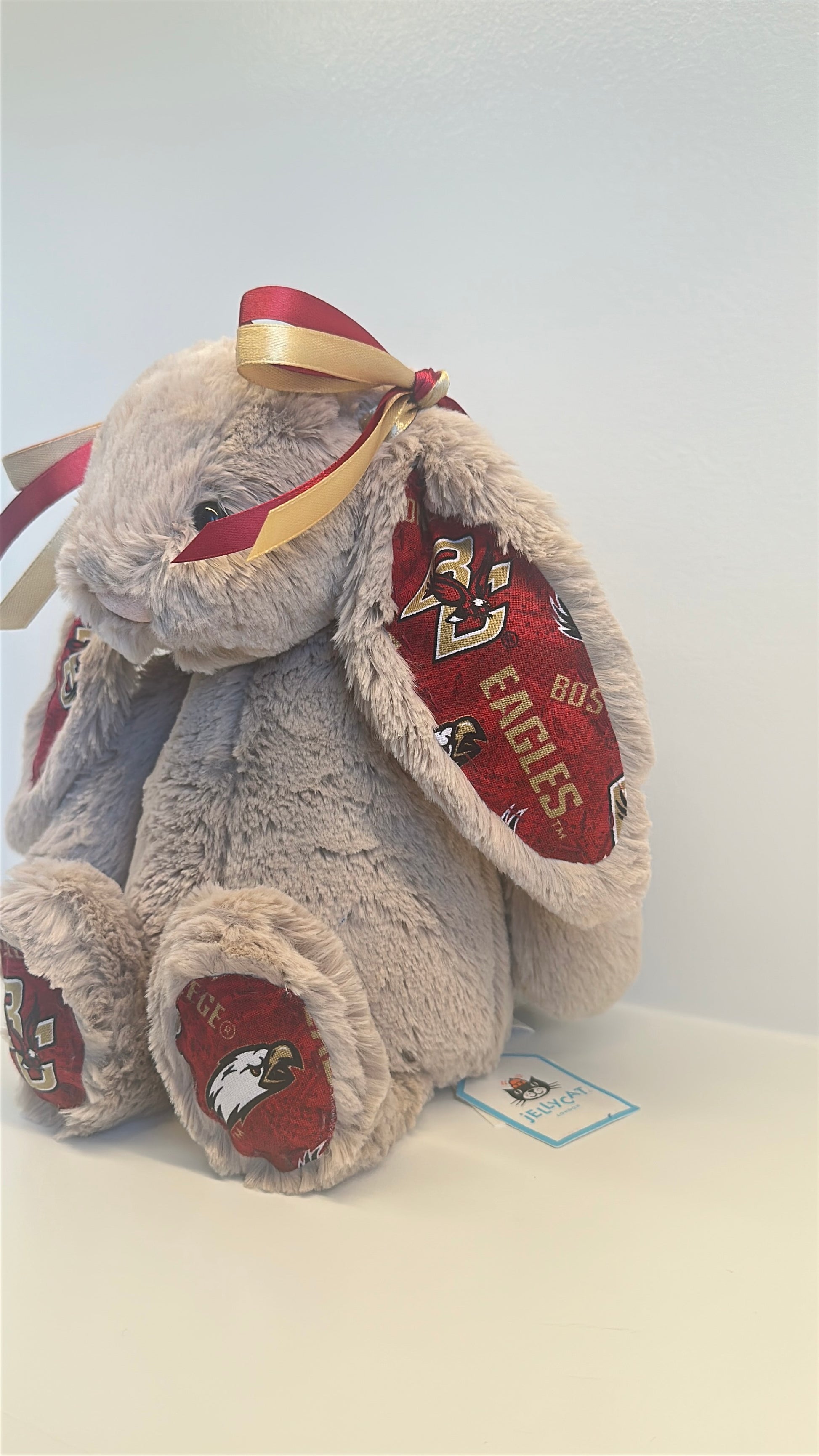 Snuggle up with this Custom College Jellycat Bashful Bunny. Each plush is adorned with custom licensed fabric for Boston College, featuring coordinated ears, feet, and matching bows that bring your university’s colors and spirit to life. This adorable plush makes the perfect gift for newly accepted students, homesick college kids, devoted fans, alumni, and anyone who wants a cozy reminder of campus life.