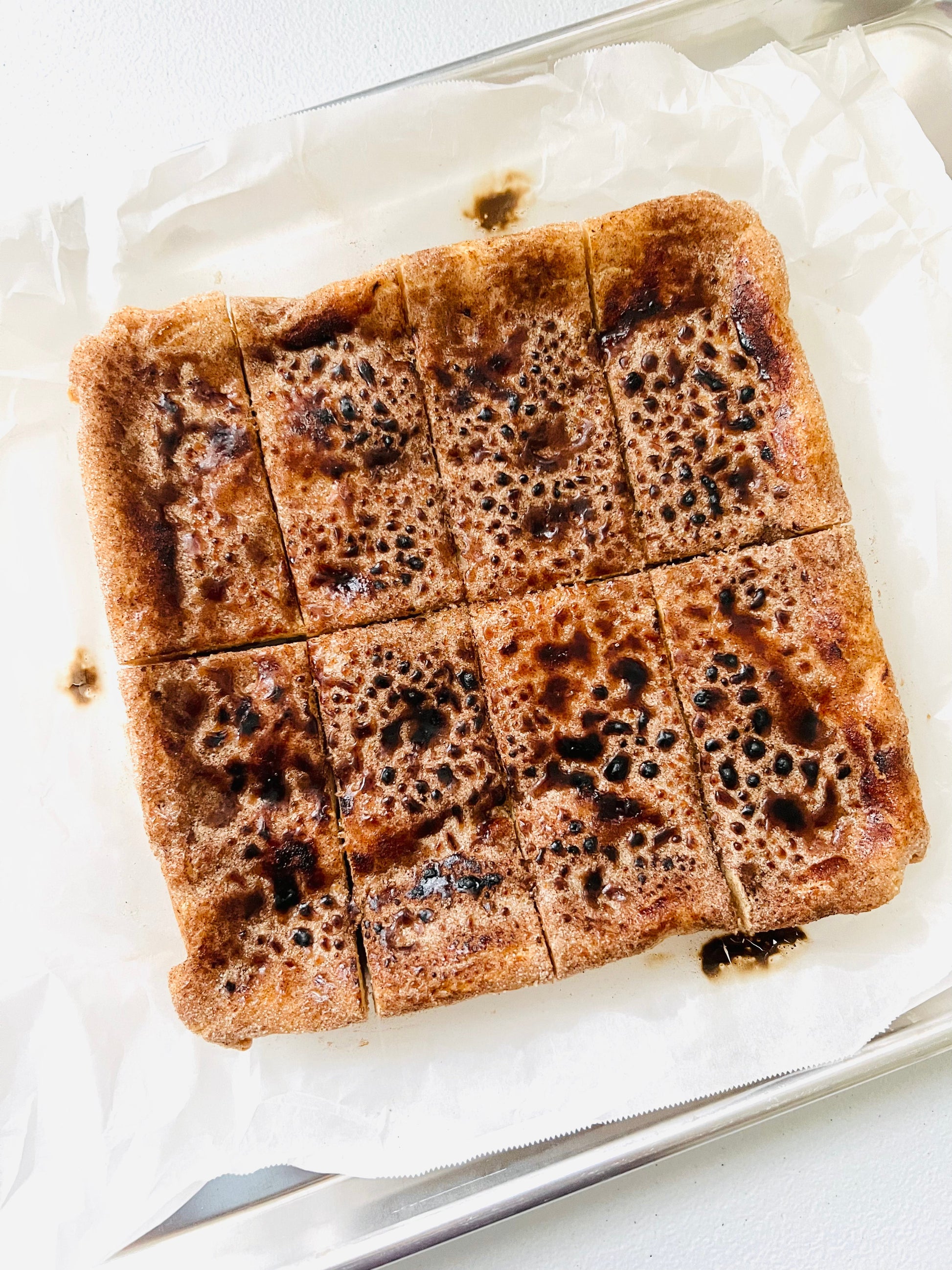 Do you love our white chocolate snickerdoodle blondies? If so, JUST WAIT! We’re kicking it up a notch with a heavy splash of top shelf bourbon & handfuls of hand torched caramelized cinnamon sugar 🤤. Each order contains 8 bars!