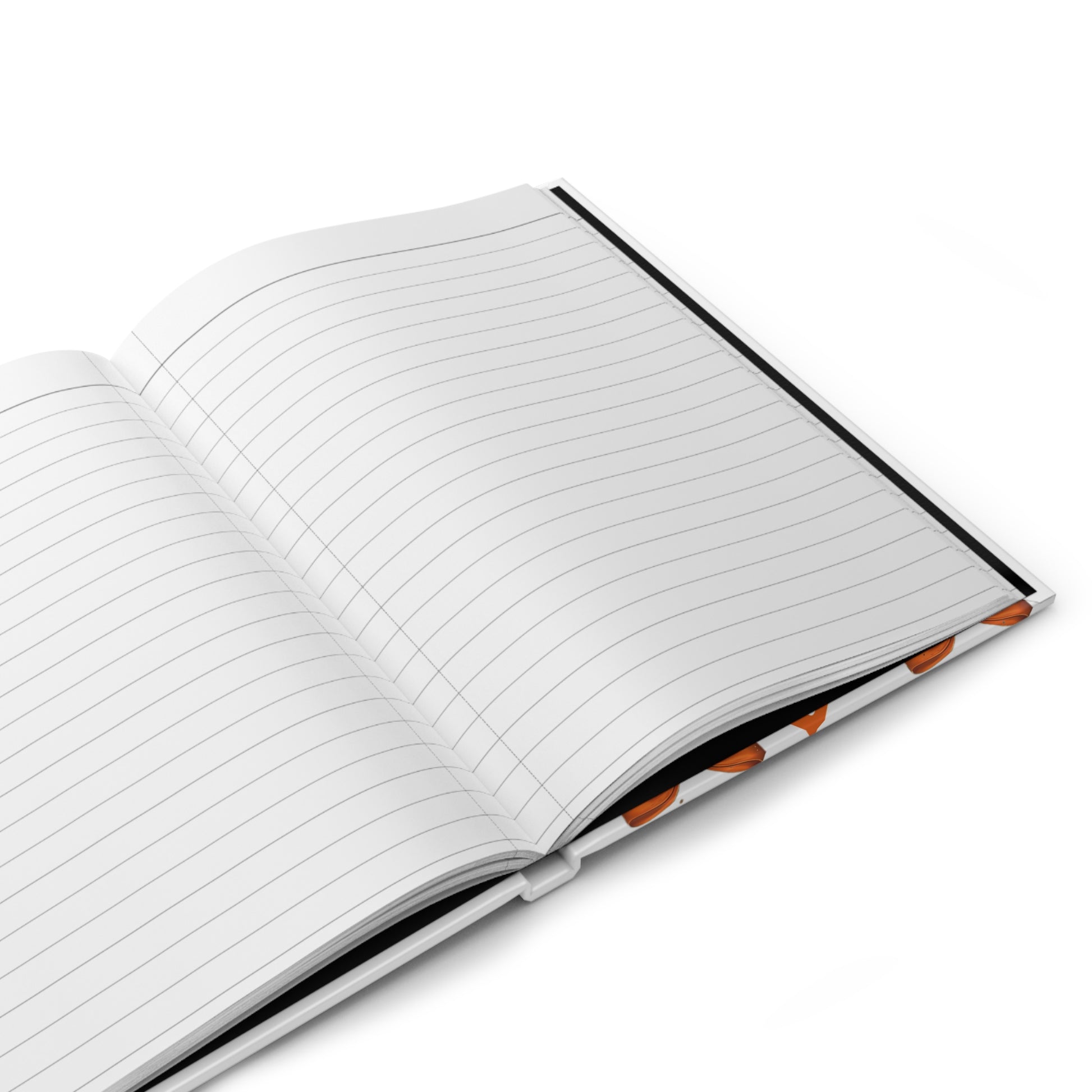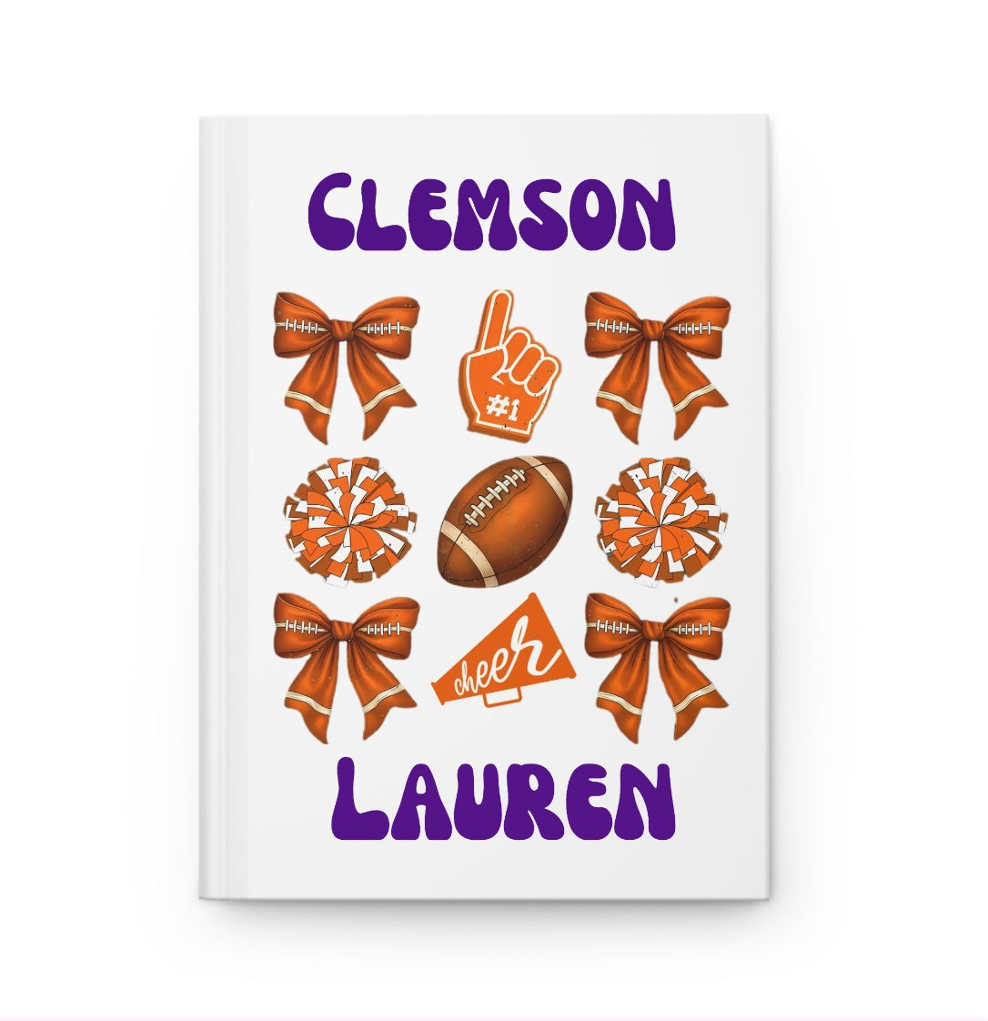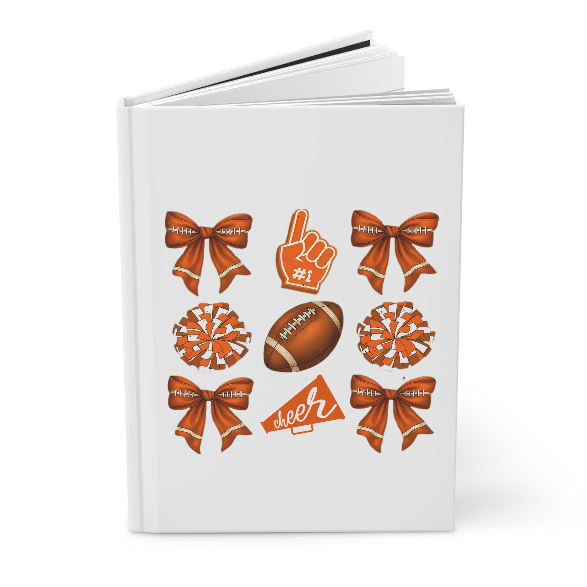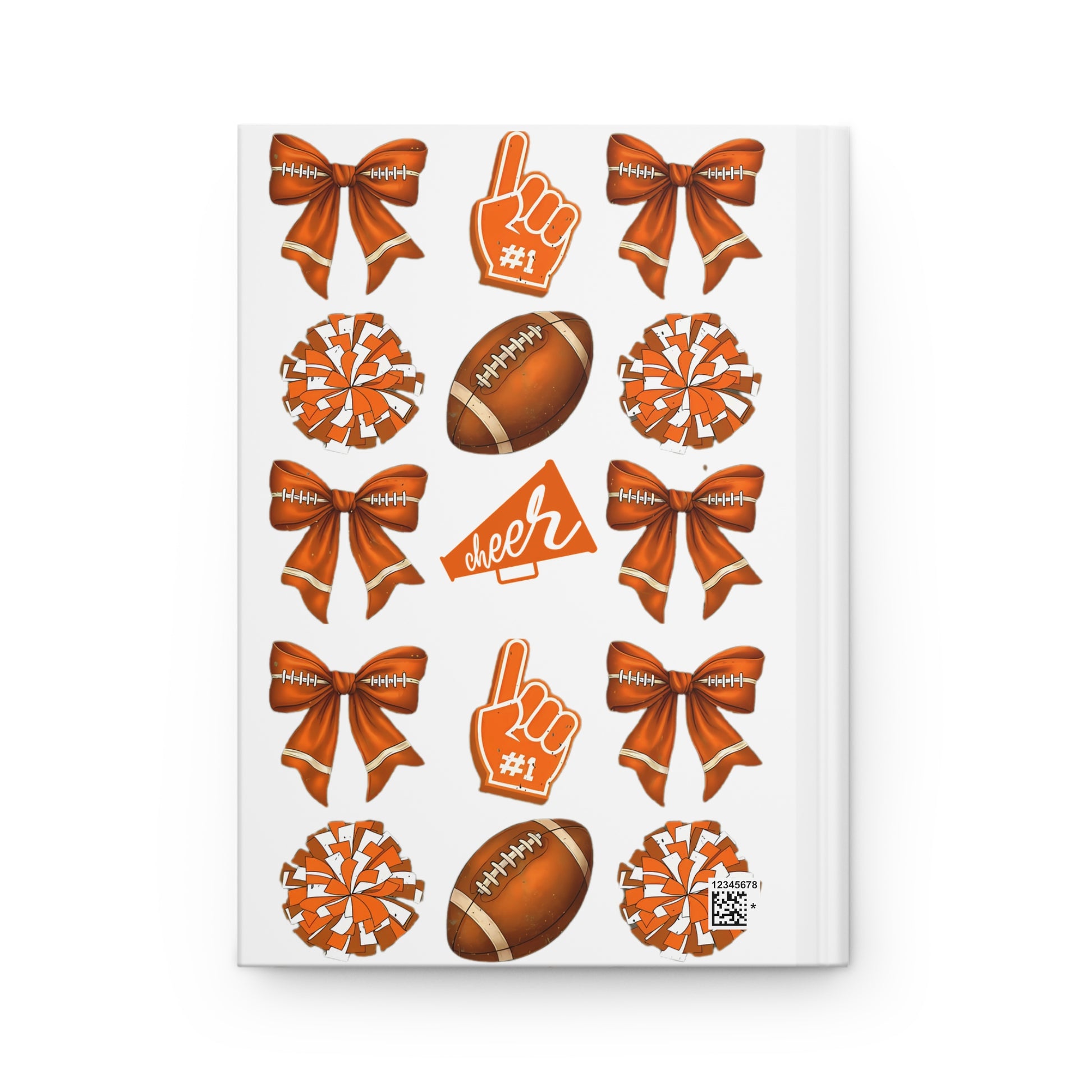 Customizable cheer, football, bow orange-themed journal perfect for high school grad gifts, cheerleaders, college care packages, football fans. Gives off a vibrant and energetic vibe, fitting perfectly into the lives of students, cheerleaders, and football enthusiasts. Relevant for back-to-school, graduation, college send-off, football season.