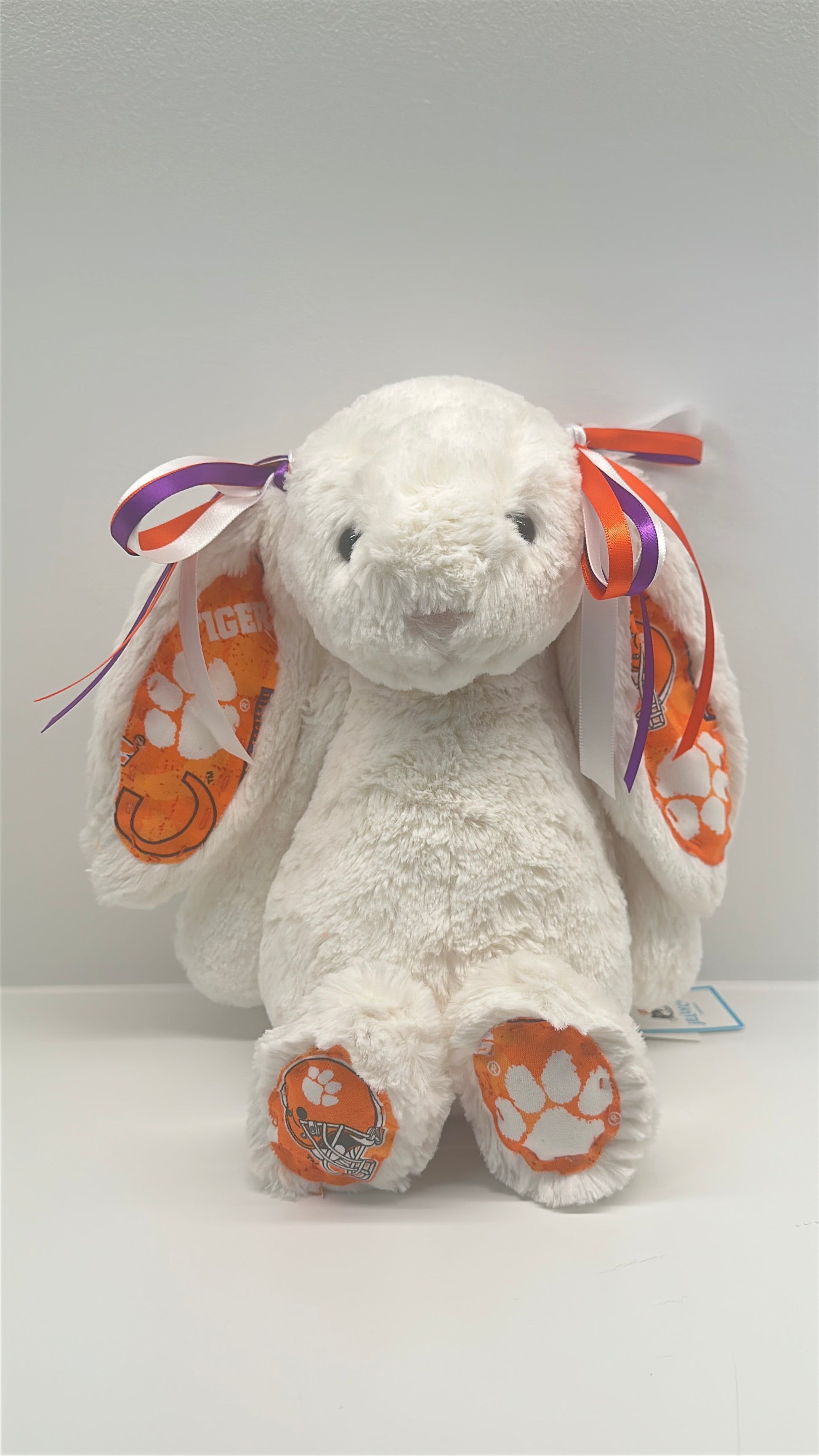 Snuggle up with this Custom College Jellycat Bashful Bunny. Each plush is adorned with custom licensed fabric for your selected school, featuring coordinated ears, feet, and matching bows that bring your university’s colors and spirit to life. This adorable plush makes the perfect gift for newly accepted students, homesick college kids, devoted fans, alumni, and anyone who wants a cozy reminder of campus life.