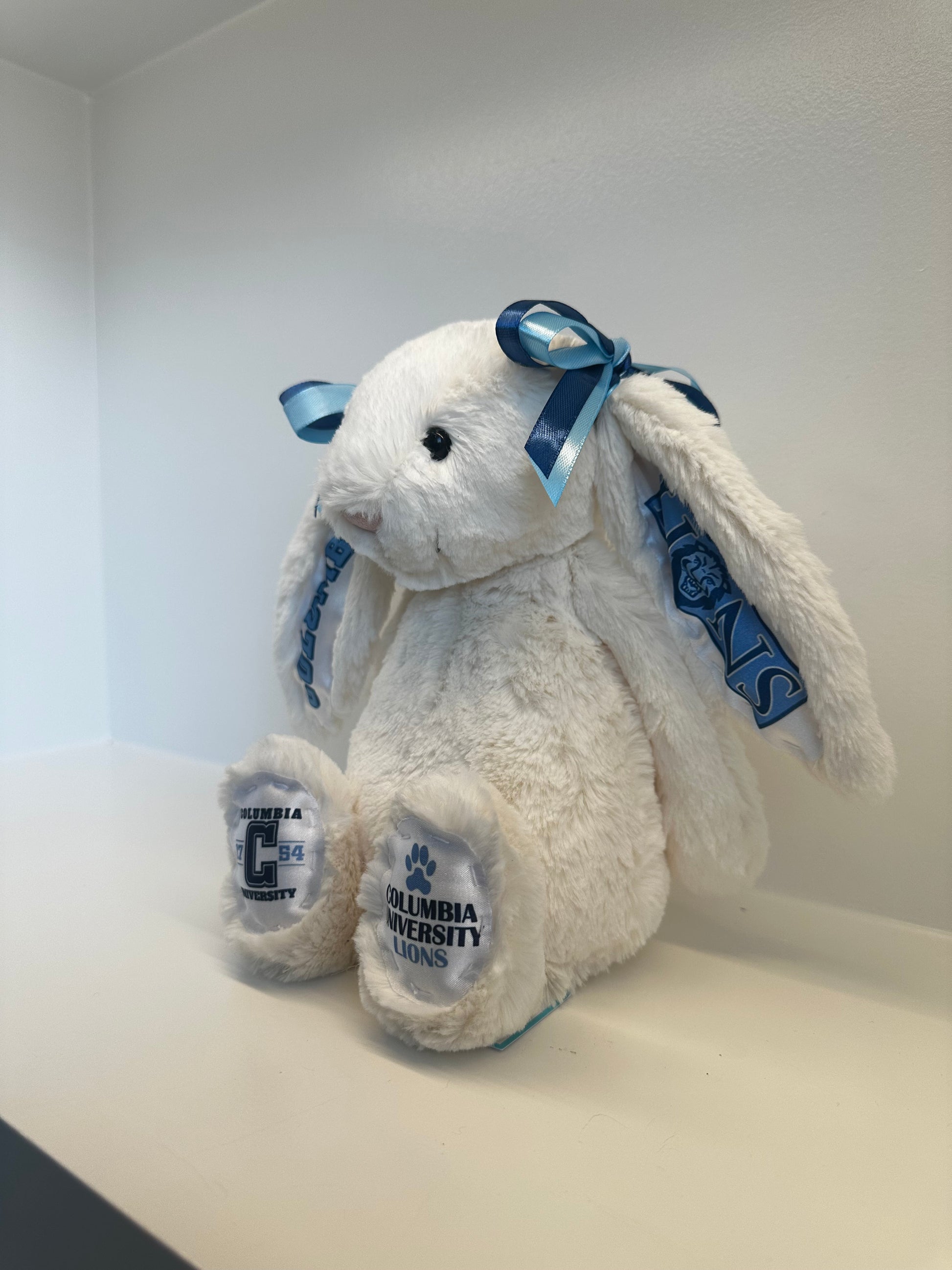 Snuggle up with this Custom College Jellycat Bashful Bunny. Each plush is adorned with a design especially for Columbia University featuring coordinated ears, feet, and matching bows that bring your university’s colors and spirit to life. This adorable plush makes the perfect gift for newly accepted students, homesick college kids, devoted fans, alumni, and anyone who wants a cozy reminder of campus life.