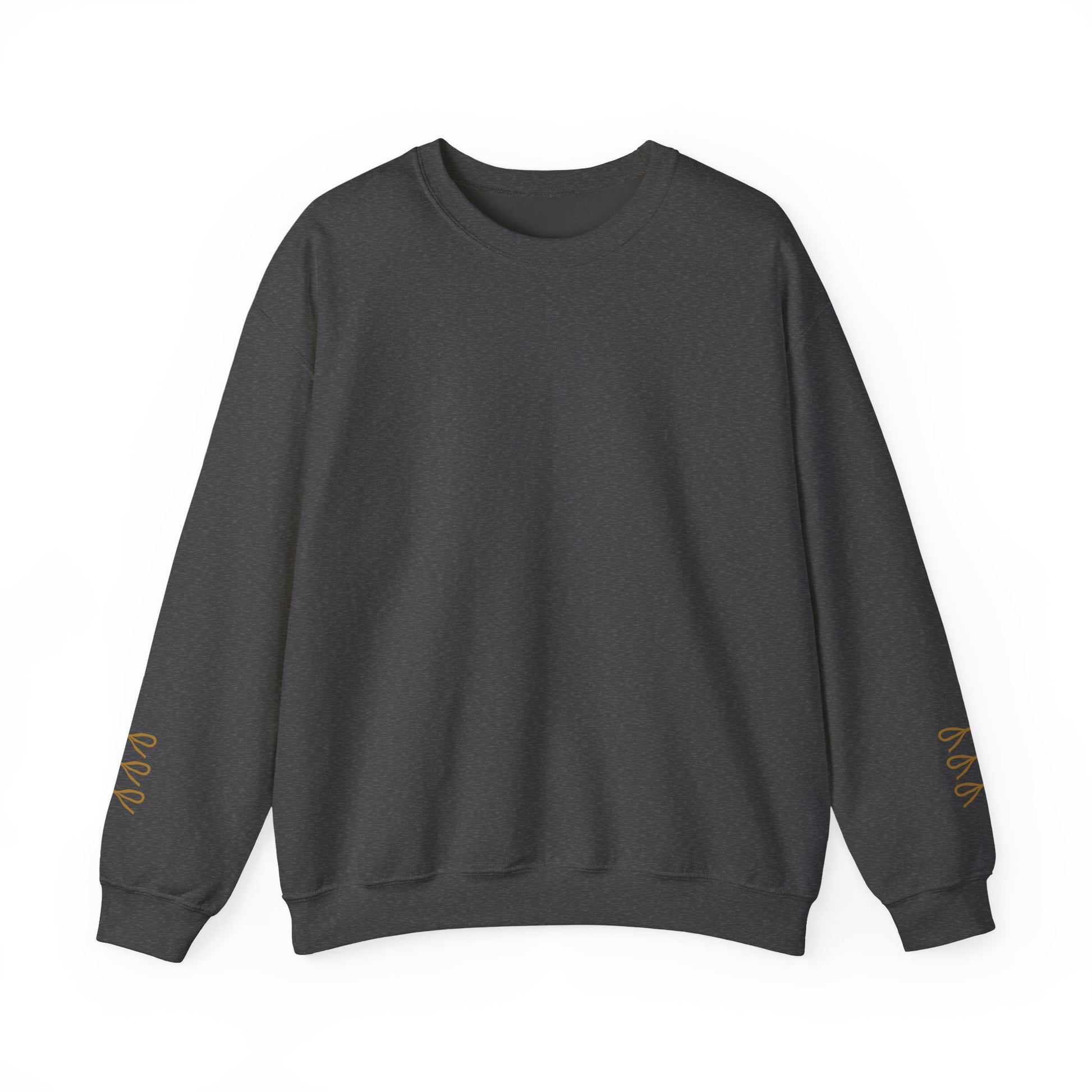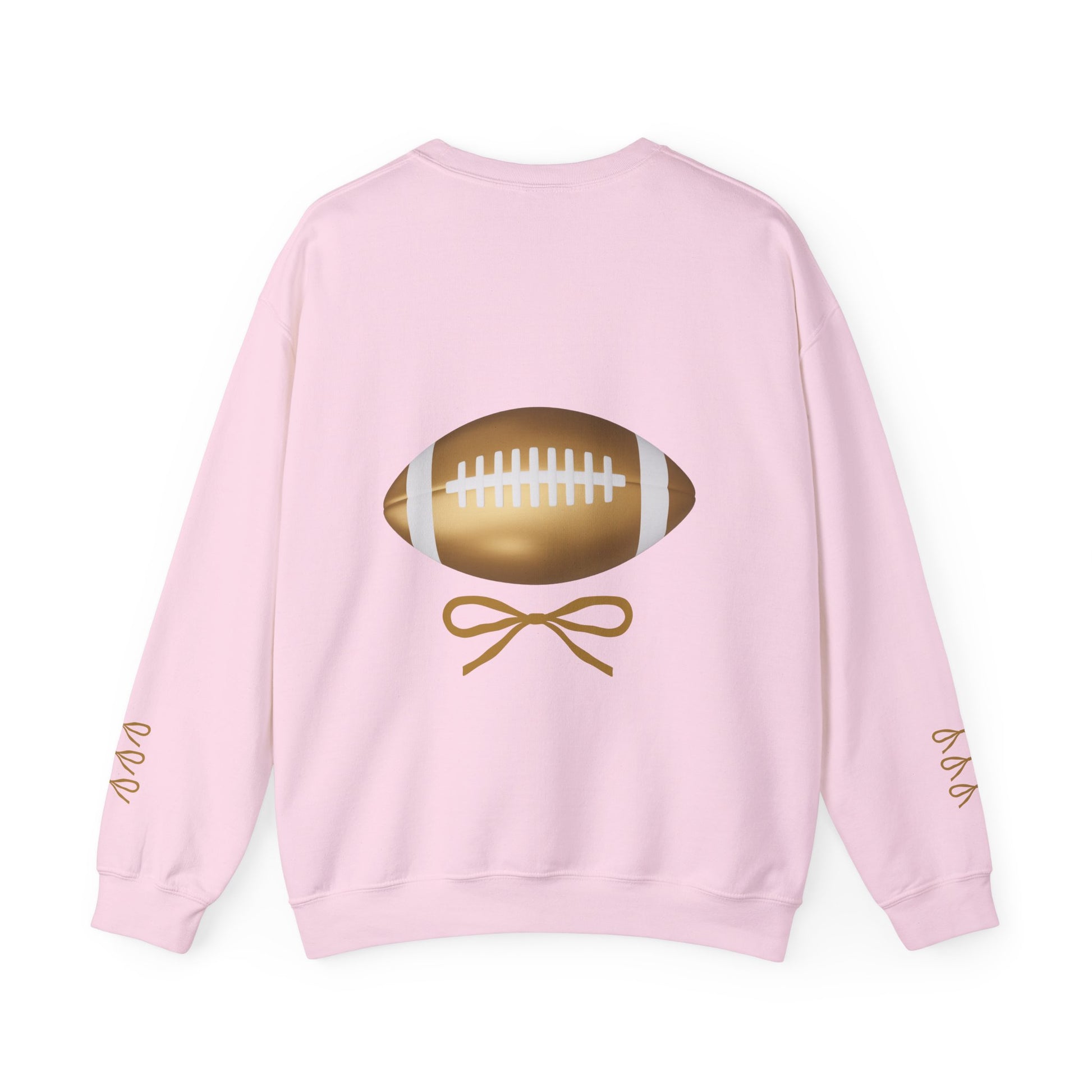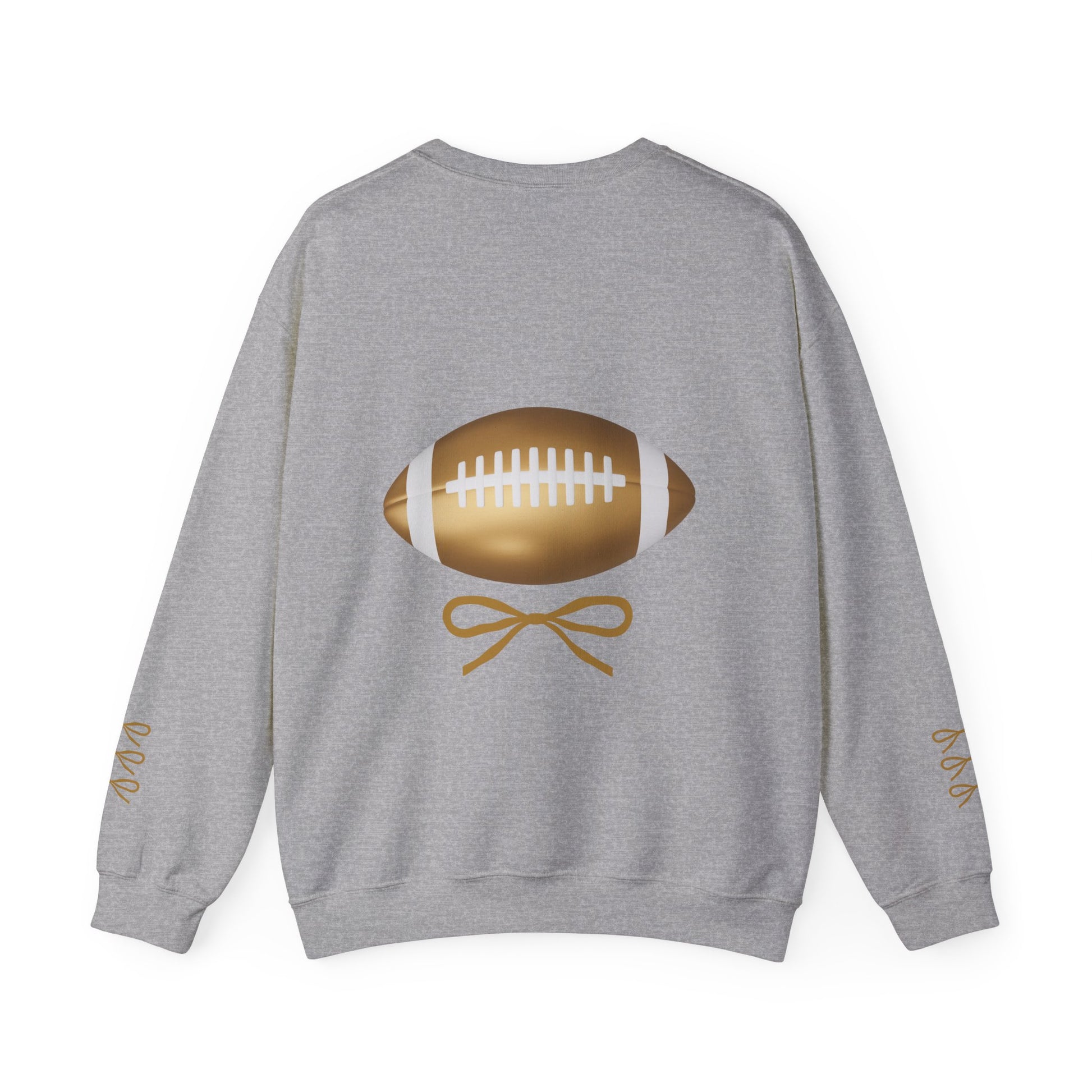 A customizable gold themed football and bows crewneck sweatshirt, perfect for showing college pride on gameday or in a cozy dorm room. Ideal for adults who want to stay warm and stylish during the colder months.