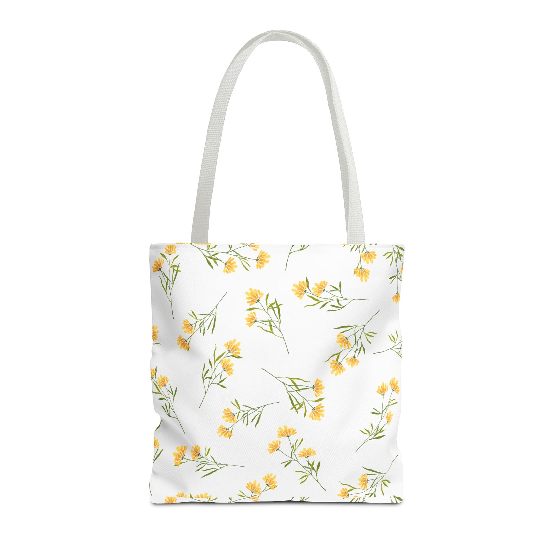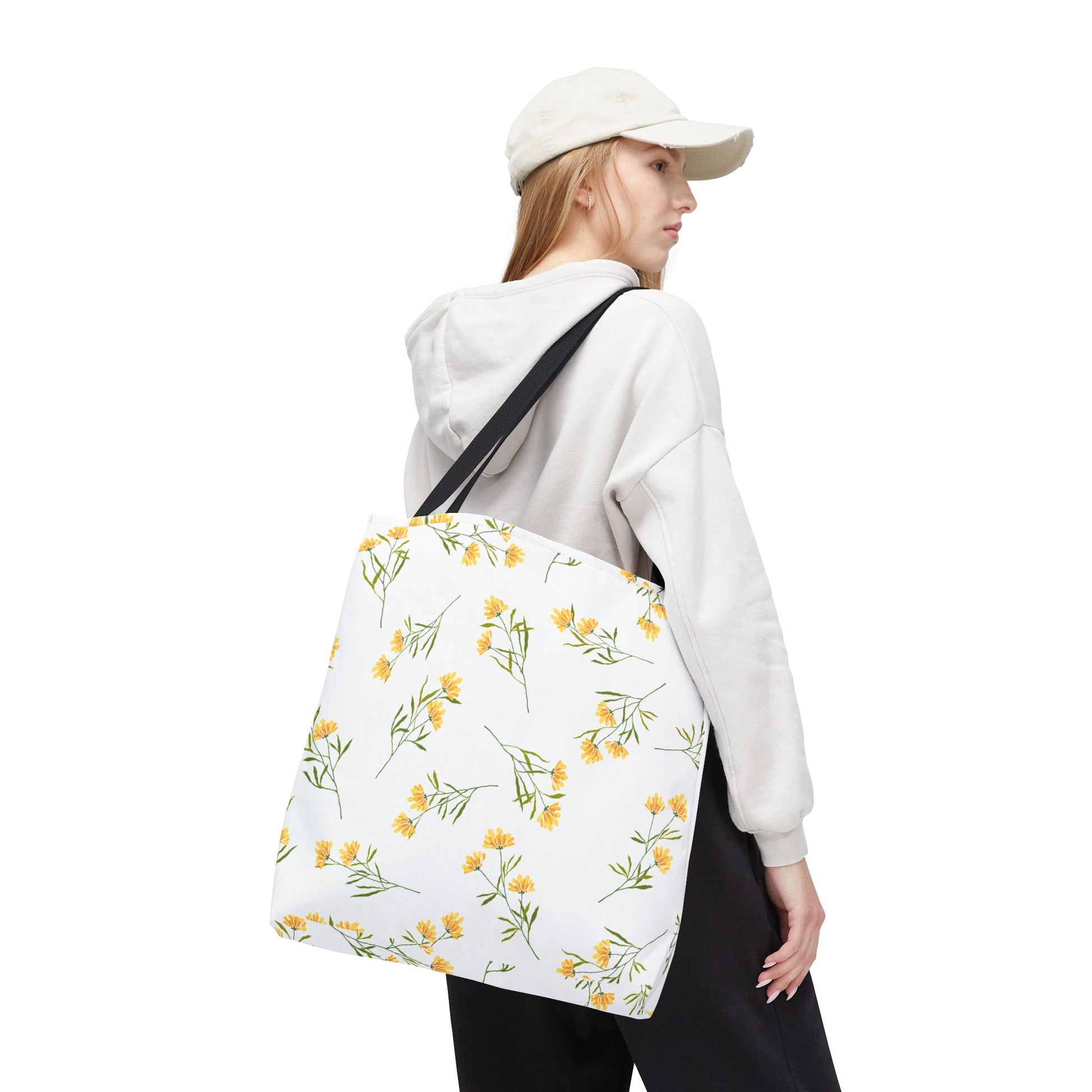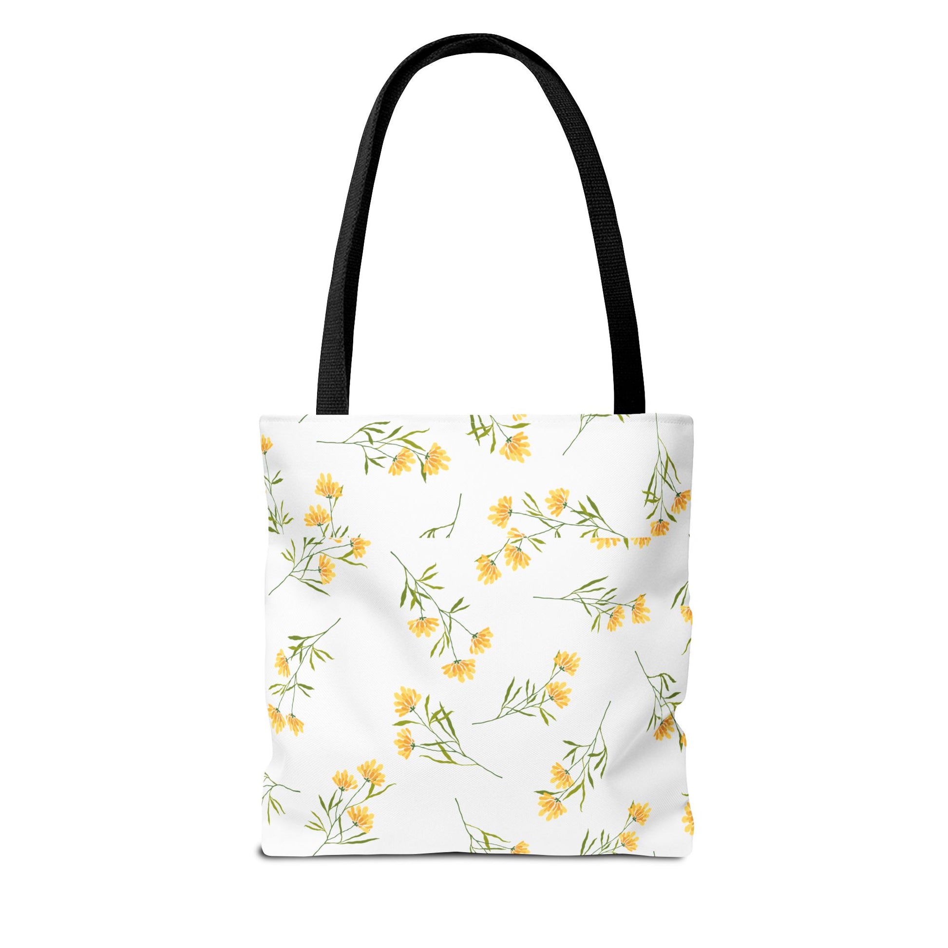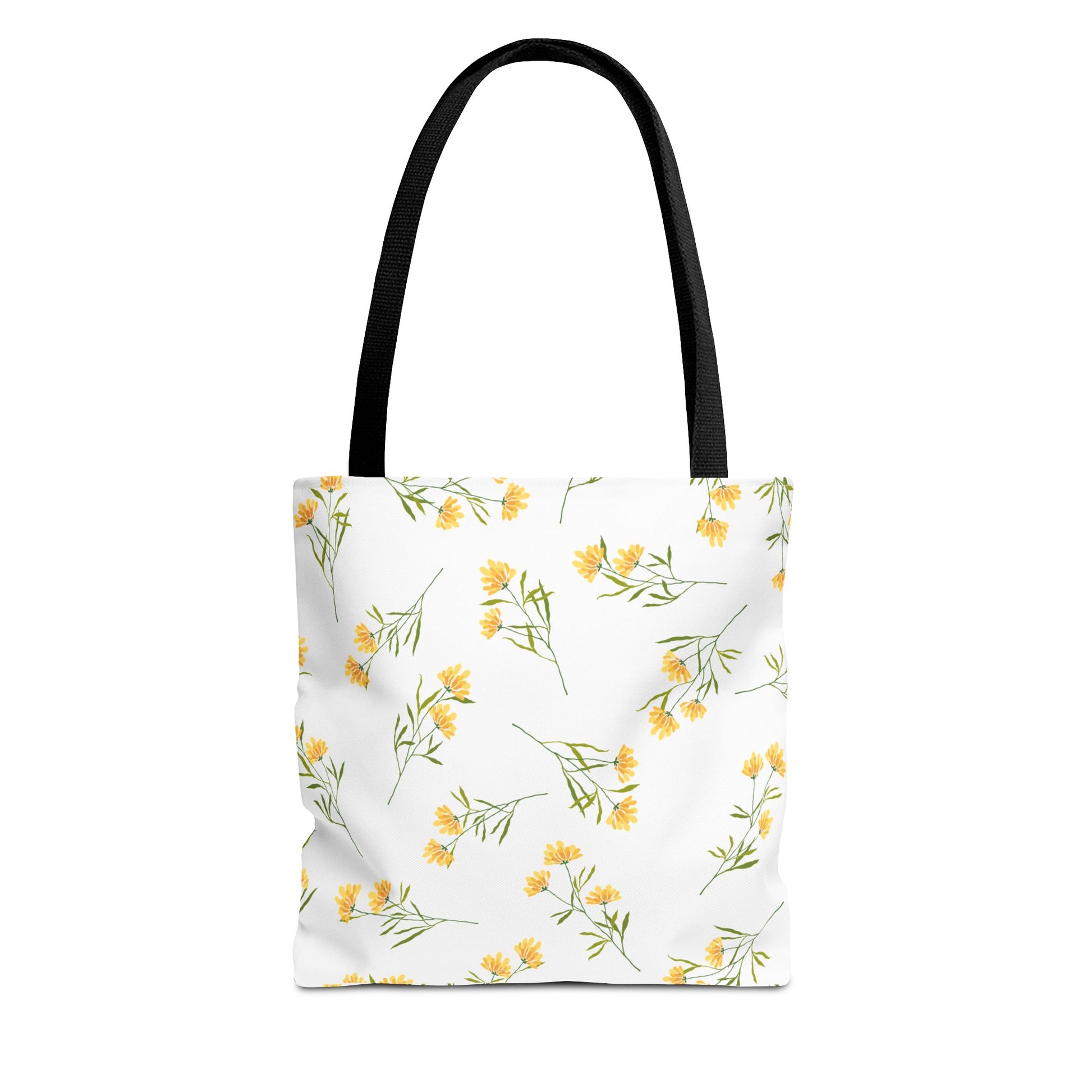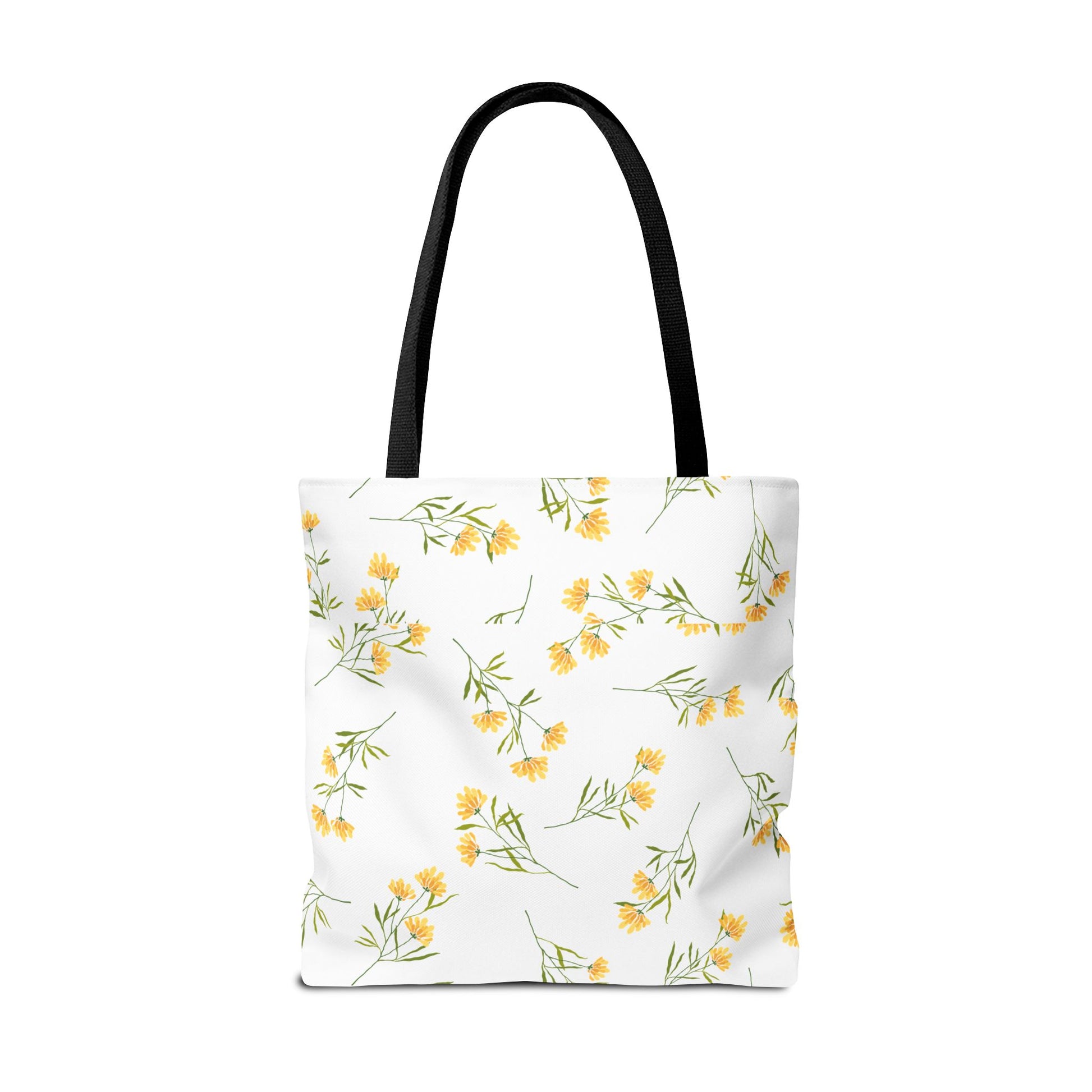 Customizable Yellow floral tote bag, perfect for quick trips out and carrying college books. Gives off a youthful and fun vibe, ideal for students and those who love floral designs. Relevant for back-to-school season, birthdays, and casual outings.