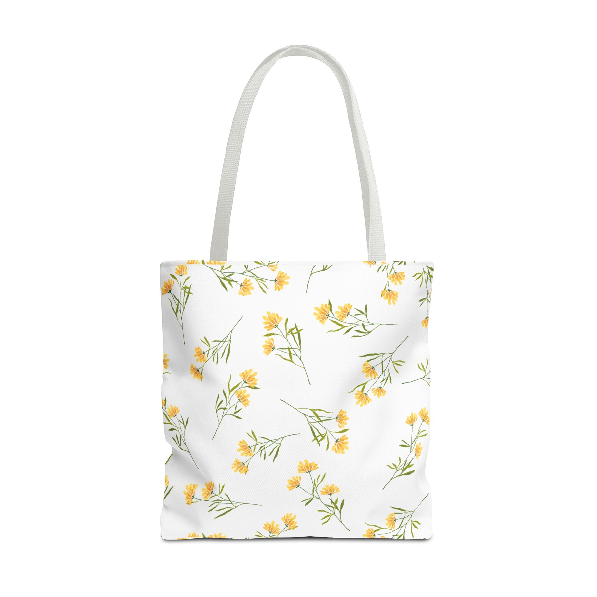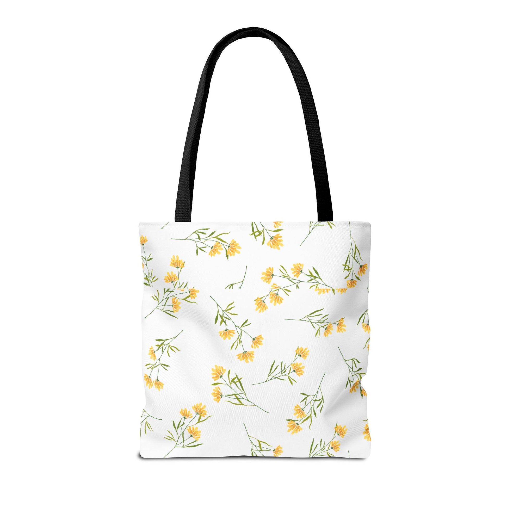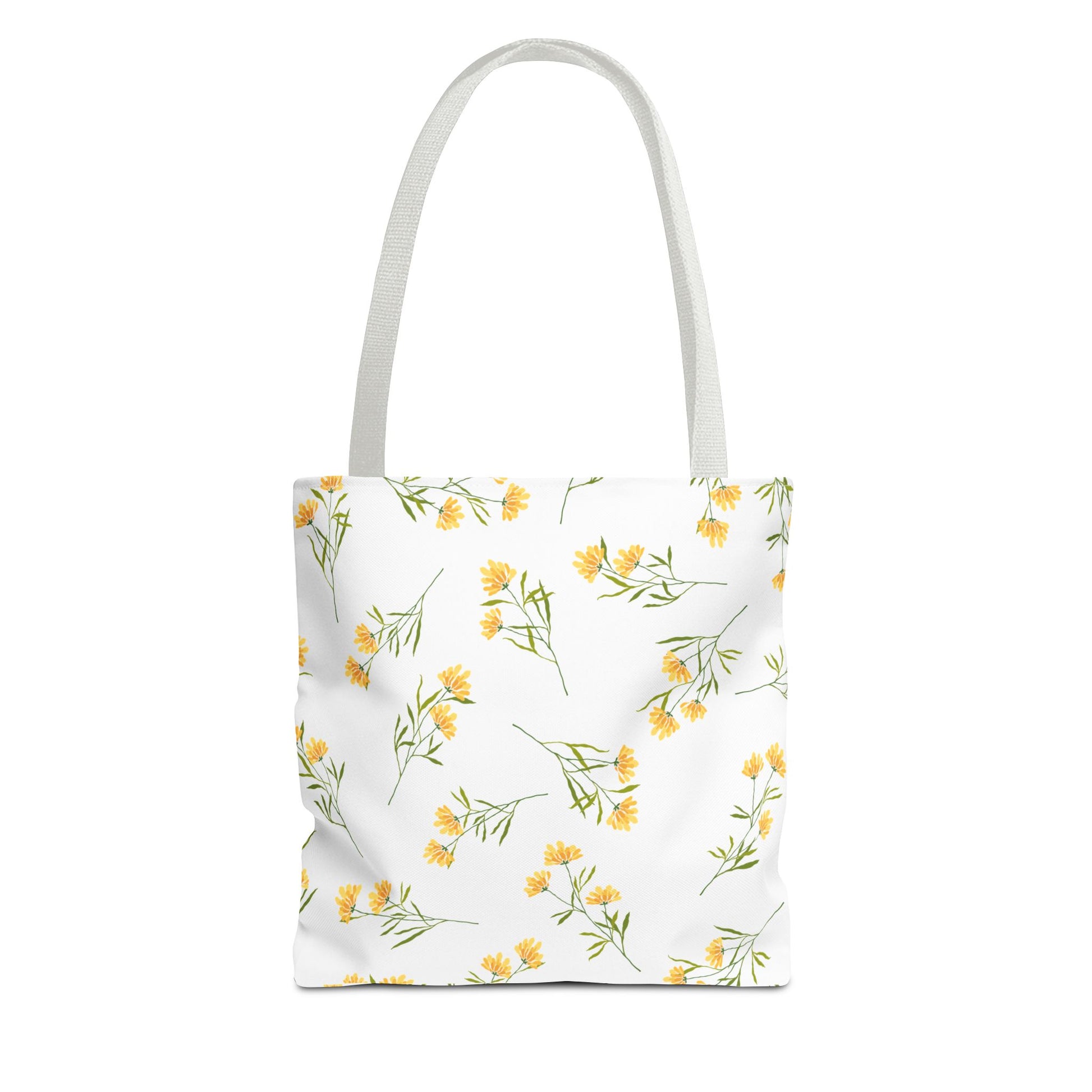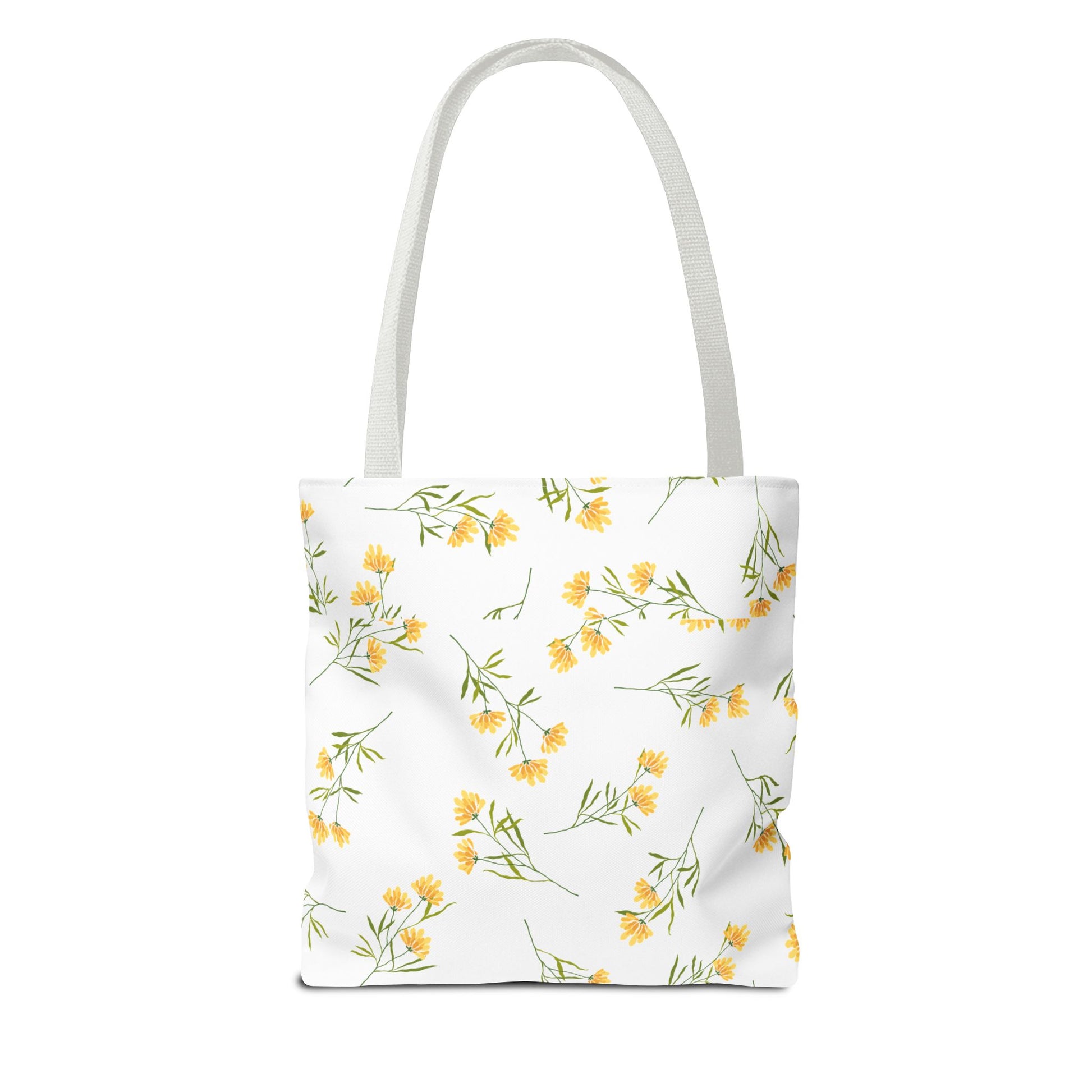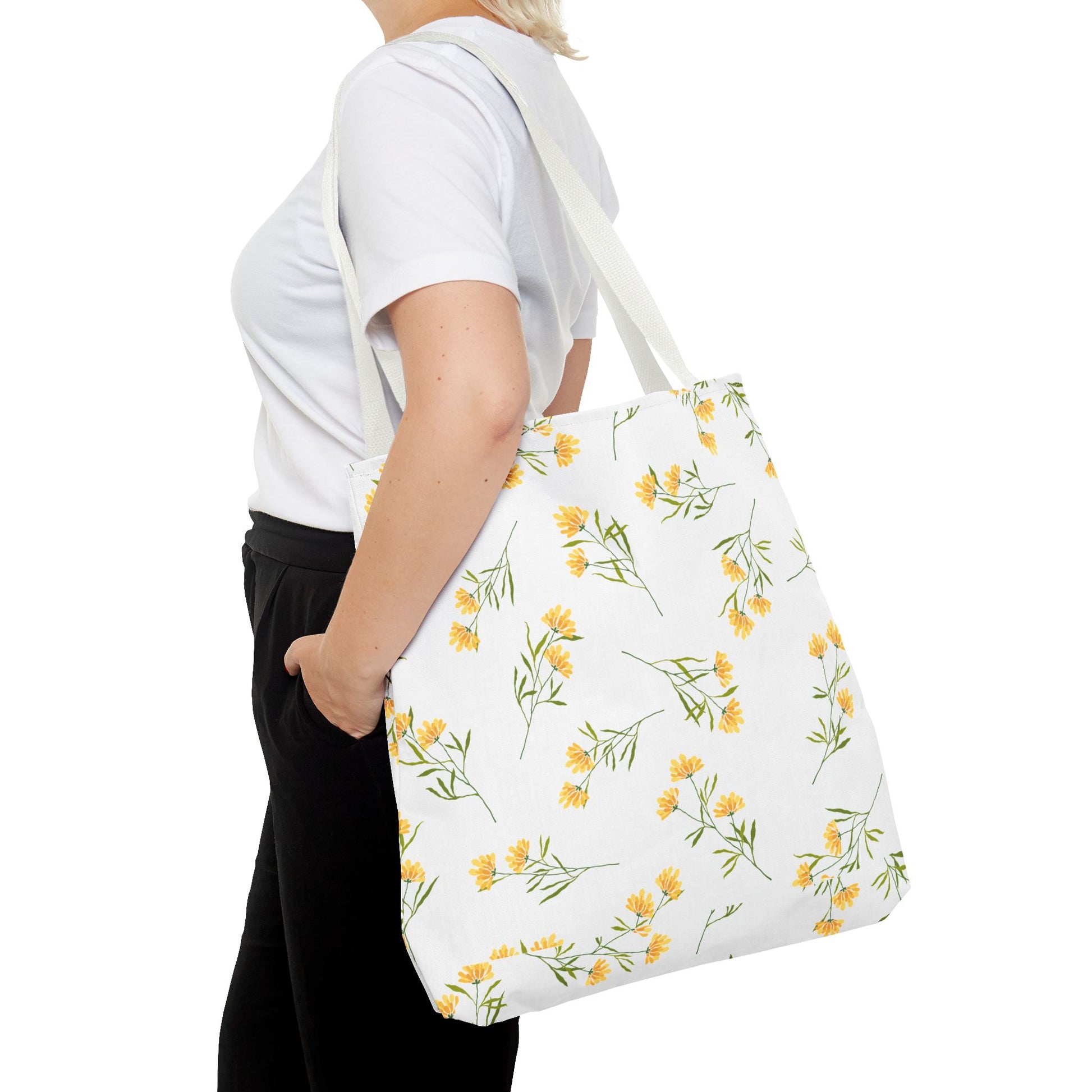 Customizable Yellow floral tote bag, perfect for quick trips out and carrying college books. Gives off a youthful and fun vibe, ideal for students and those who love floral designs. Relevant for back-to-school season, birthdays, and casual outings.