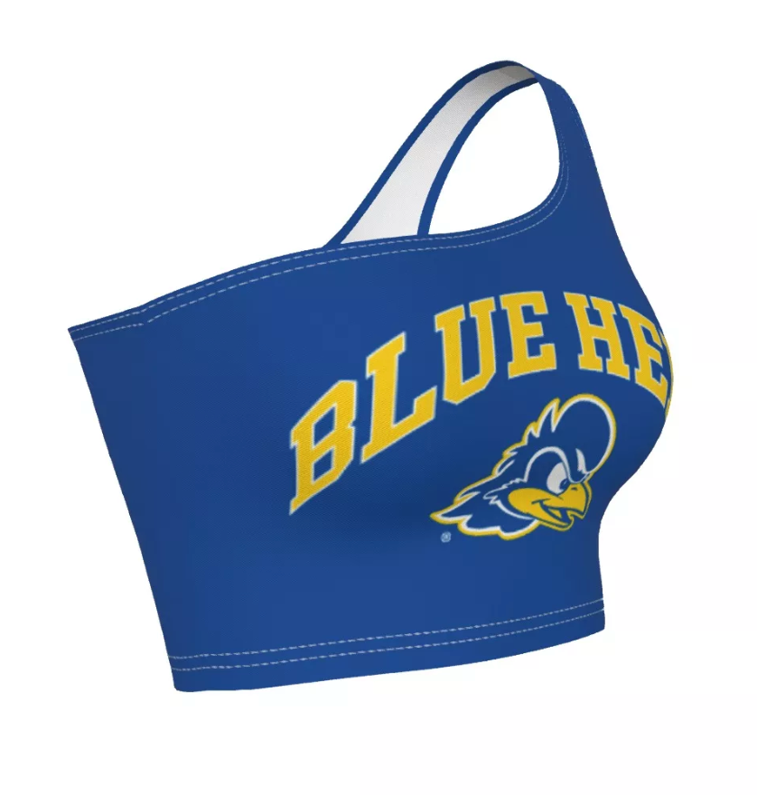This super flattering University of Delaware Blue One Shoulder Top is perfect for college game day paired with our Delaware Game Day Skirt for the cutest matching set! Our Delaware One Shoulder Top's stretchy fabric makes it the perfect option for all body types. You'll never want to take this adorable one shoulder top off!