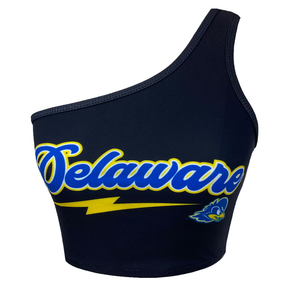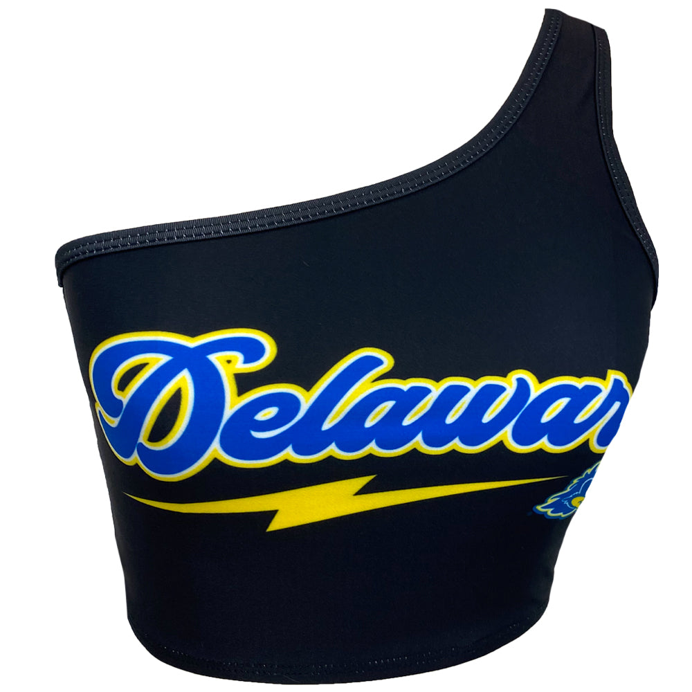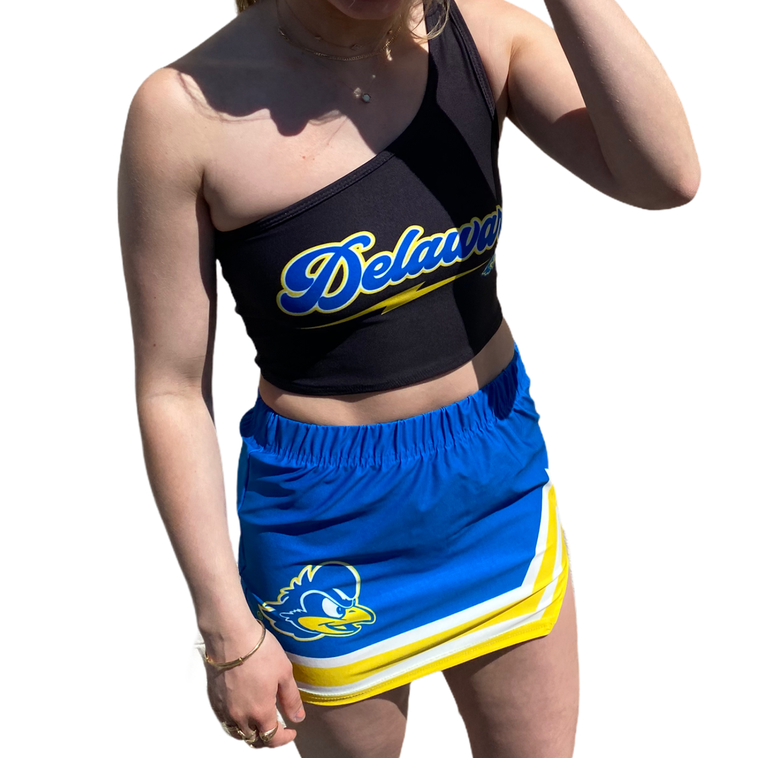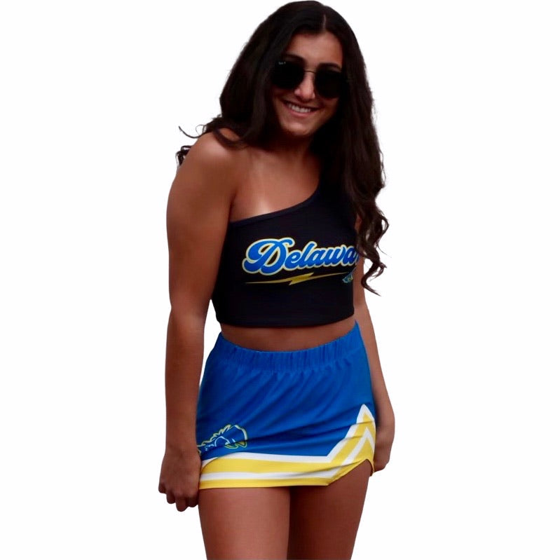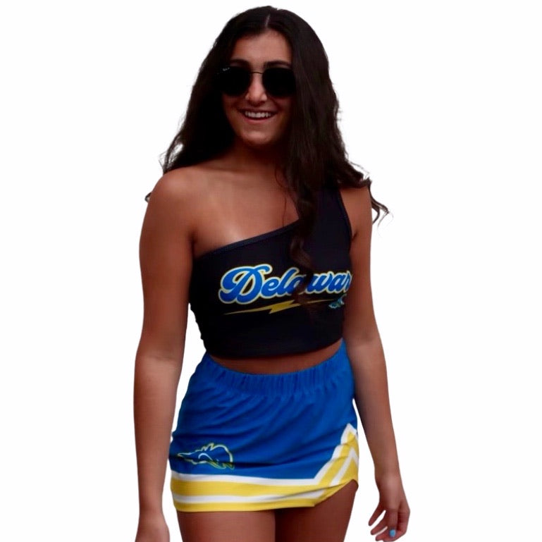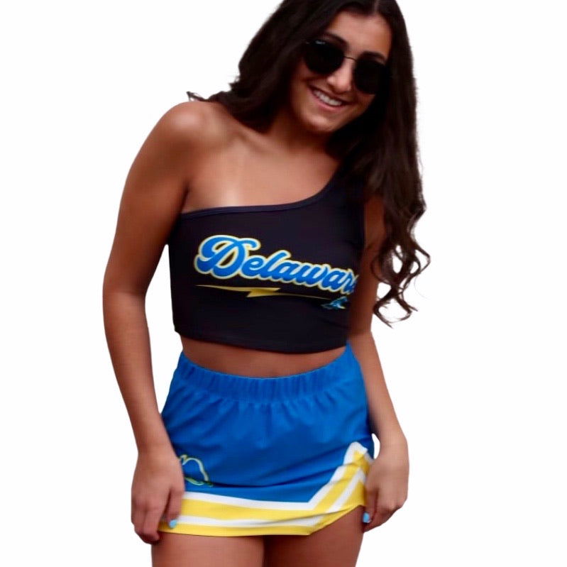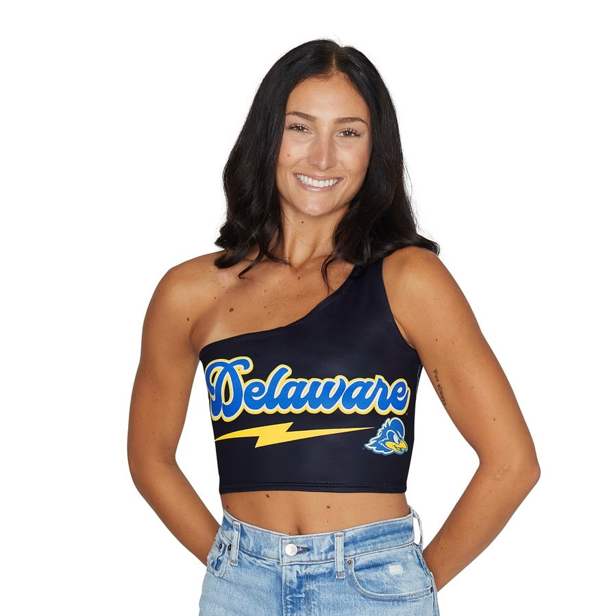 This super flattering University of Delaware Lightning One Shoulder Top is perfect for college game day paired with our Delaware Game Day Skirt for the cutest matching set! Our Delaware One Shoulder Top's stretchy fabric makes it the perfect option for all body types. You'll never want to take this adorable one shoulder top off! In stock & ready to ship in 1-2 business days.