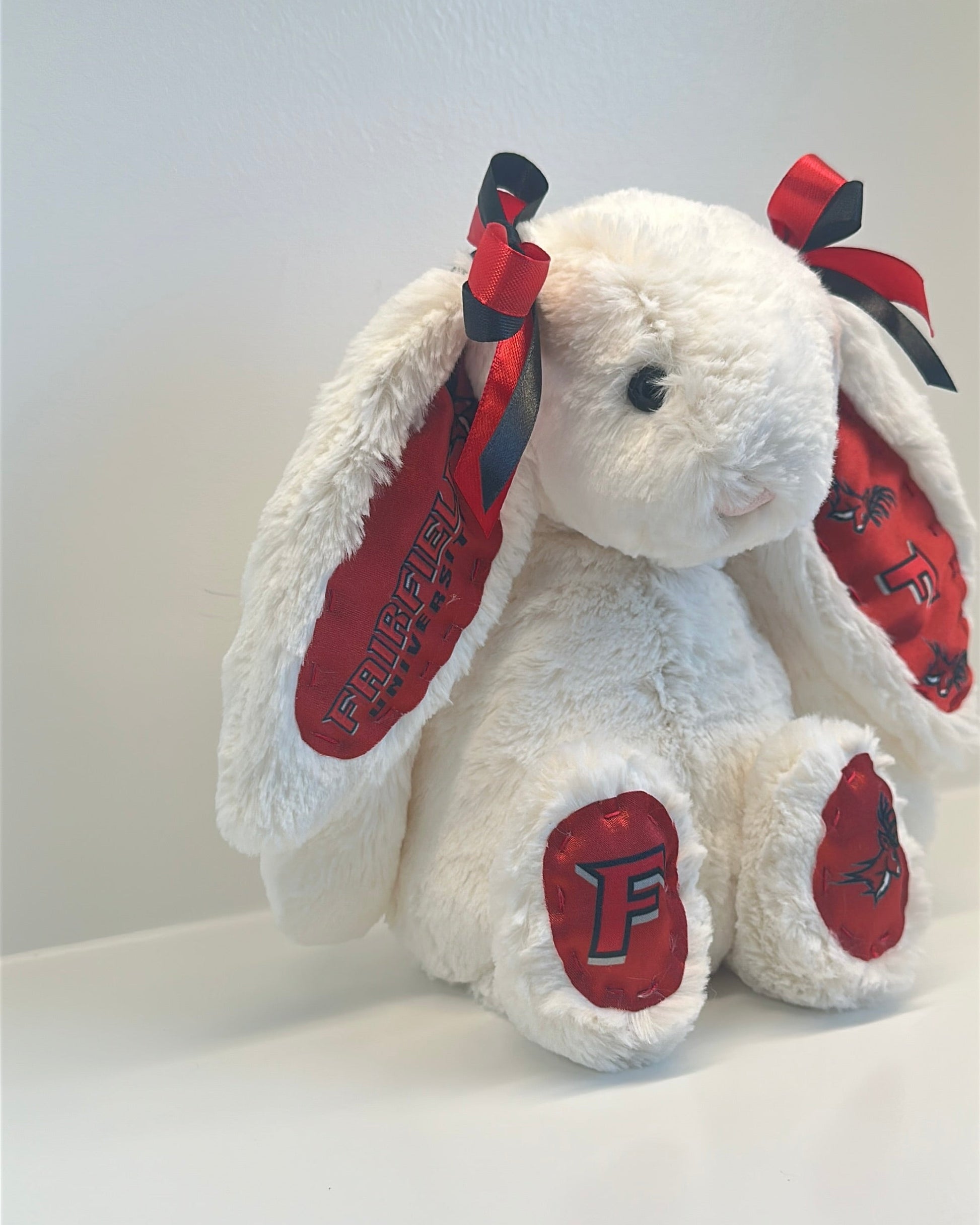 Snuggle up with this Custom College Jellycat Bashful Bunny. Each plush is adorned with custom fabric for Fairfield University featuring coordinated ears, feet, and matching bows that bring your university’s colors and spirit to life. This adorable plush makes the perfect gift for newly accepted students, homesick college kids, devoted fans, alumni, and anyone who wants a cozy reminder of campus life.