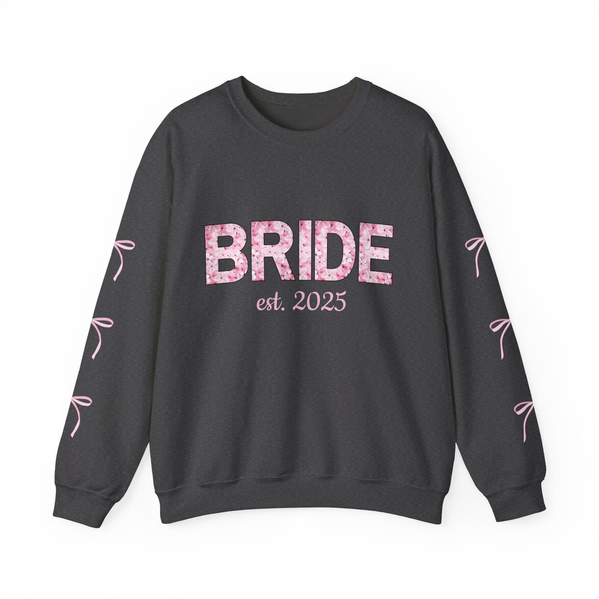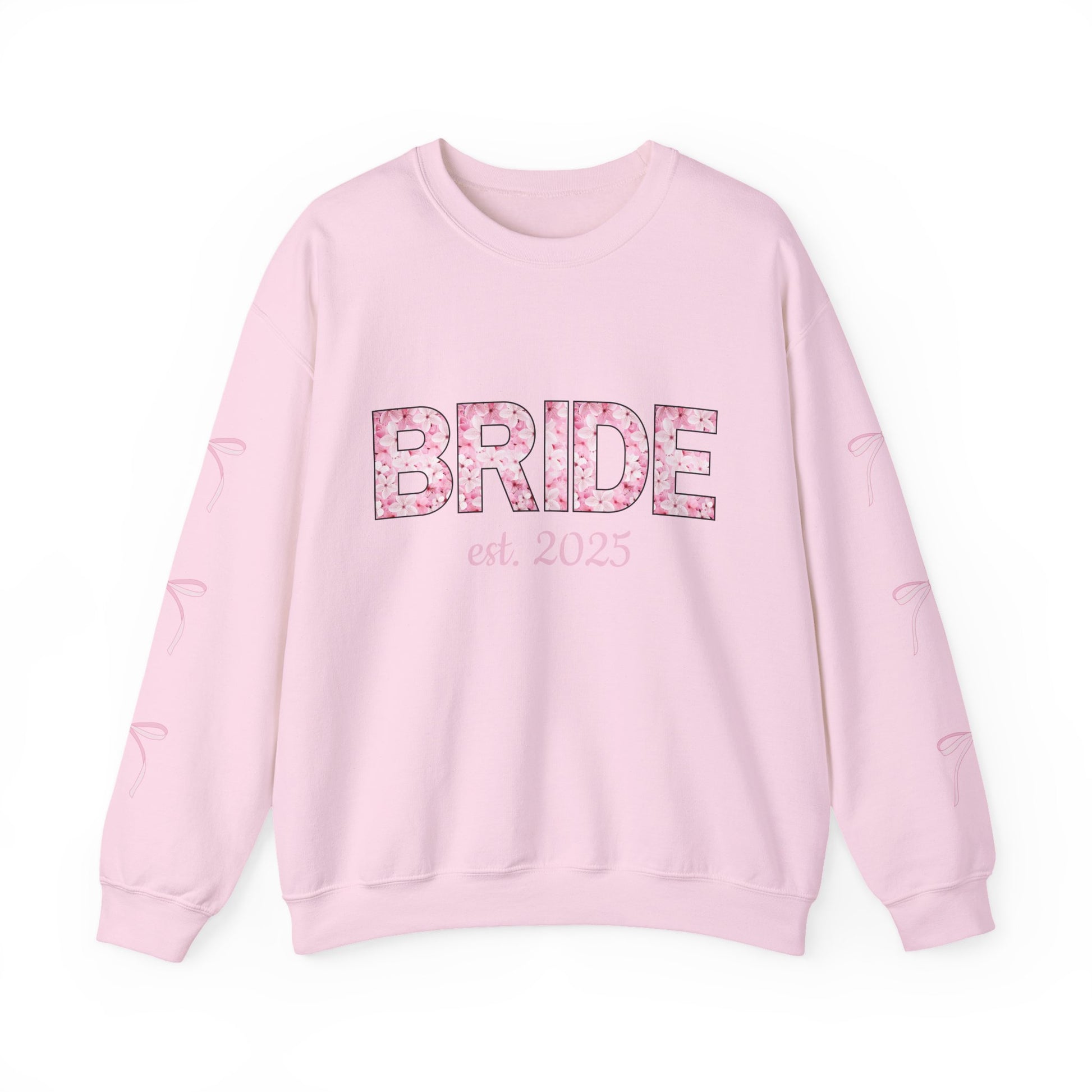 A floral bride sweatshirt customizable with your wedding date and future name, perfect for cozy comfort in colder months. Ideal for brides-to-be looking for a personal touch to their wedding festivities.