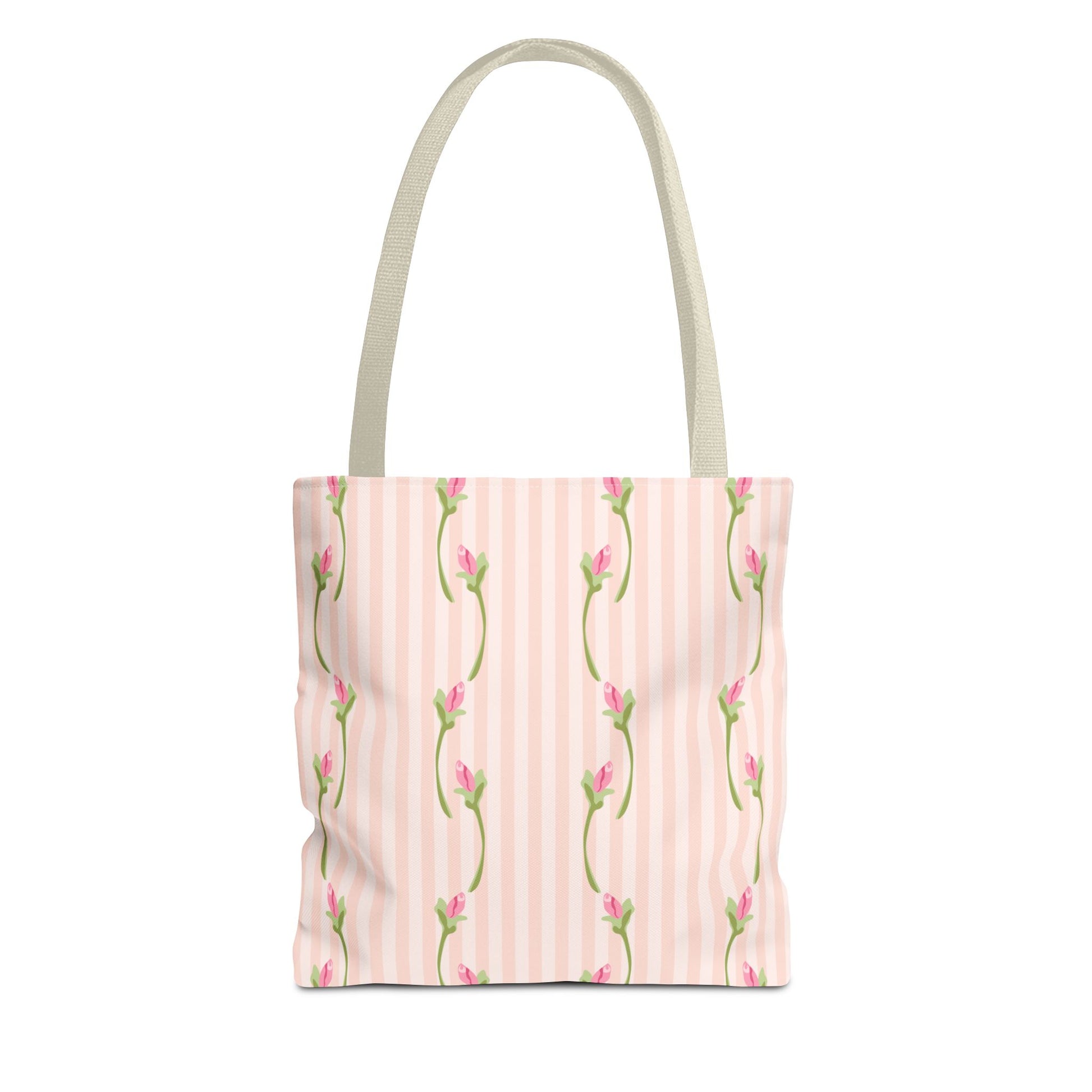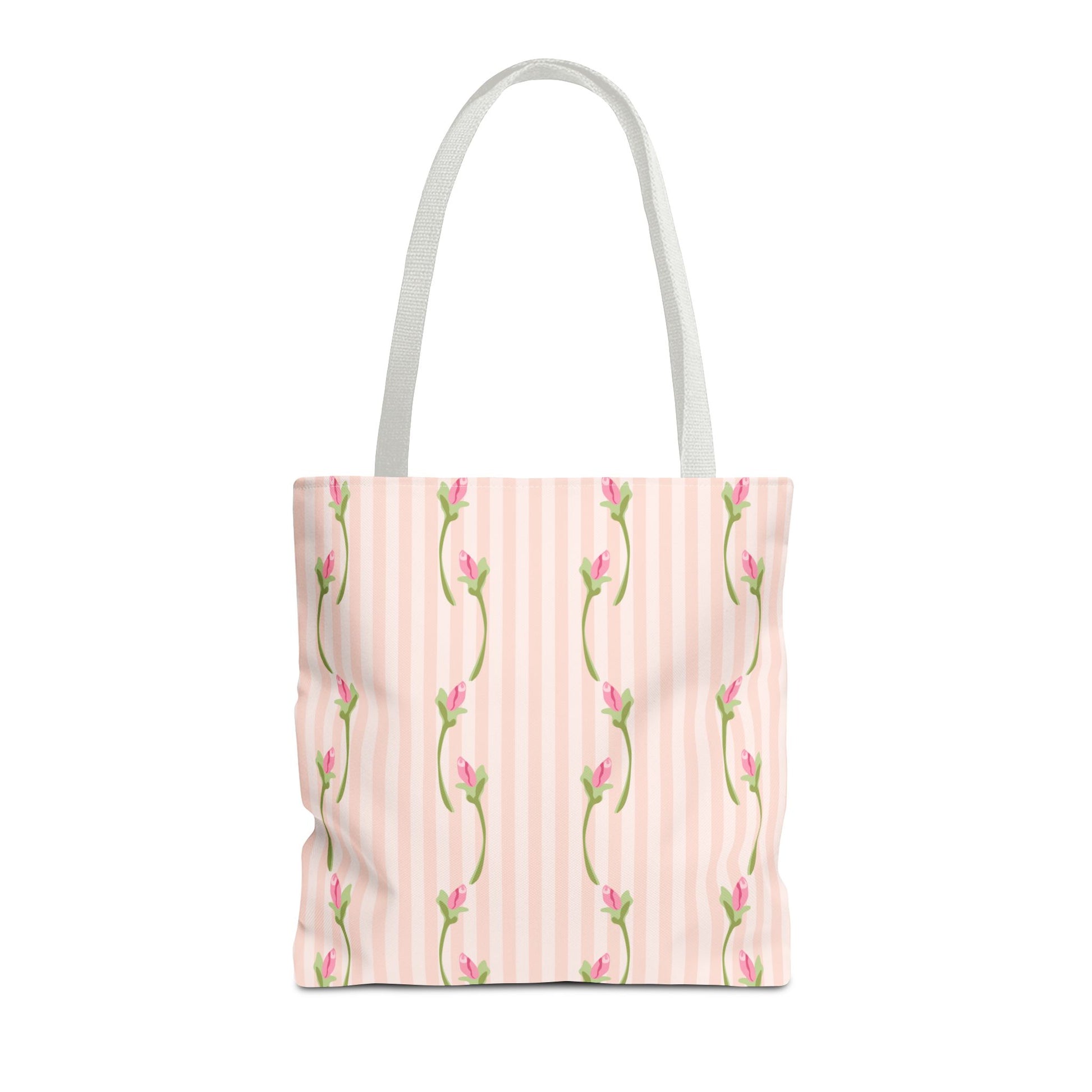 Introducing the perfect blend of style and utility, this Tote Bag is designed for those who appreciate fashion and functionality. With its cheerful floral design against a soft striped background, it brings a touch of spring to any outfit. Ideal for weekend outings, grocery runs, or even as a chic accessory for work, this tote strikes the perfect balance between everyday use and a statement piece. It's perfect for eco-conscious shoppers, busy professionals, and anyone who loves to add a splash of color to their day. Great for Mother's Day, birthdays, or just because – this tote is a delightful gift for anyone embracing a vibrant lifestyle. Product features - 100% polyester body for strength and durability - Reinforced stitching on the handles for added sturdiness - Spacious boxed corners for extra storage room - Available in three sizes to meet various needs - Five color handle options to suit personal style Care instructions - Remove all items from the bag before cleaning. Suggested to pretreat visible stains with stain remover. Mix warm water with laundry detergent and clean the bag with terry washcloth or a soft bristle brush. Let the bag air dry.