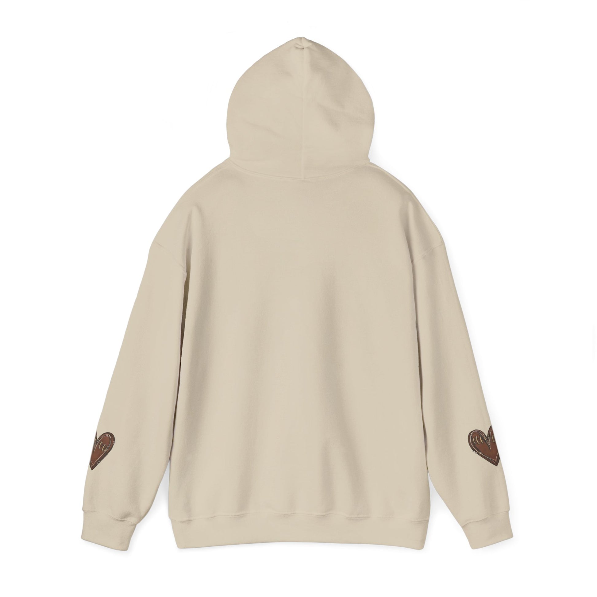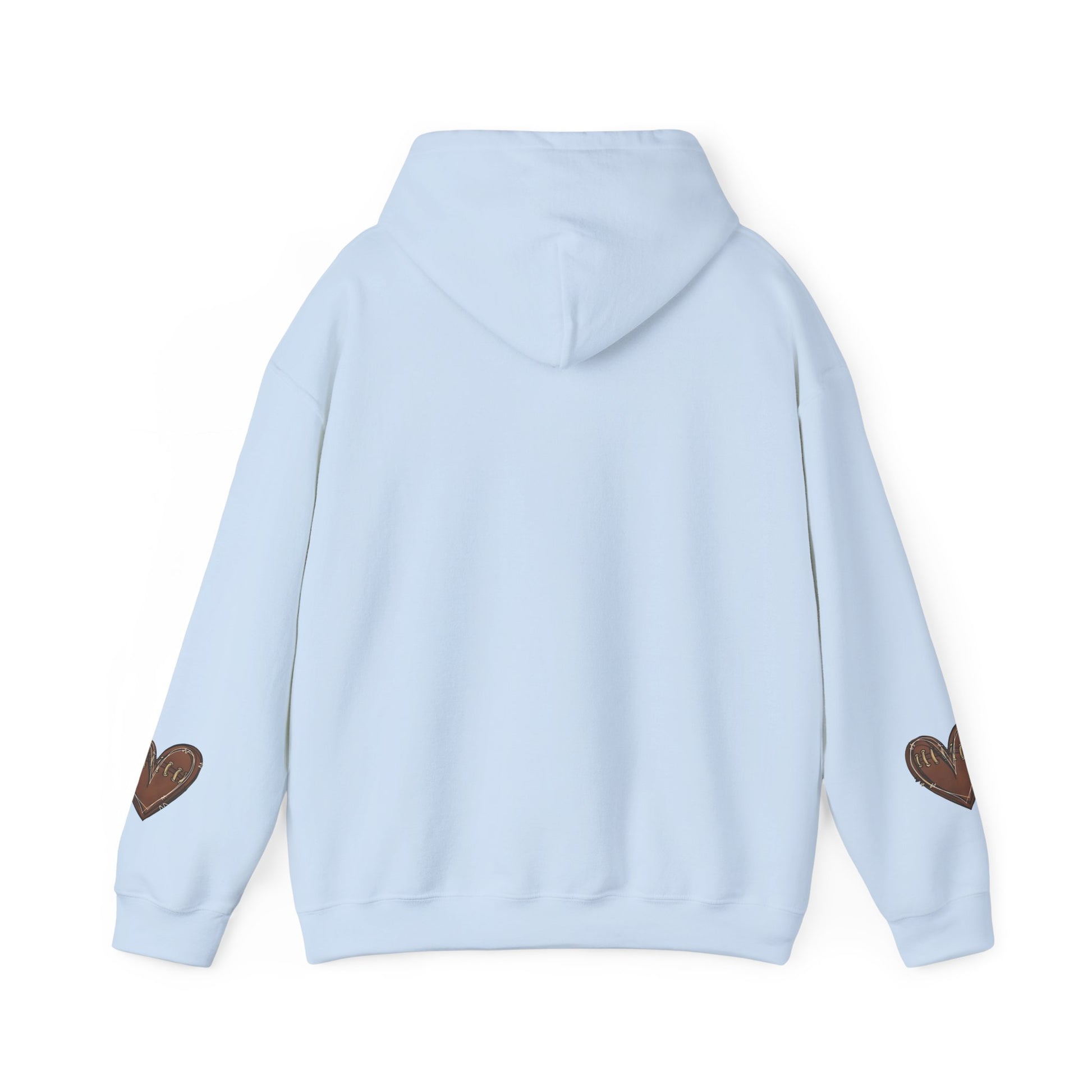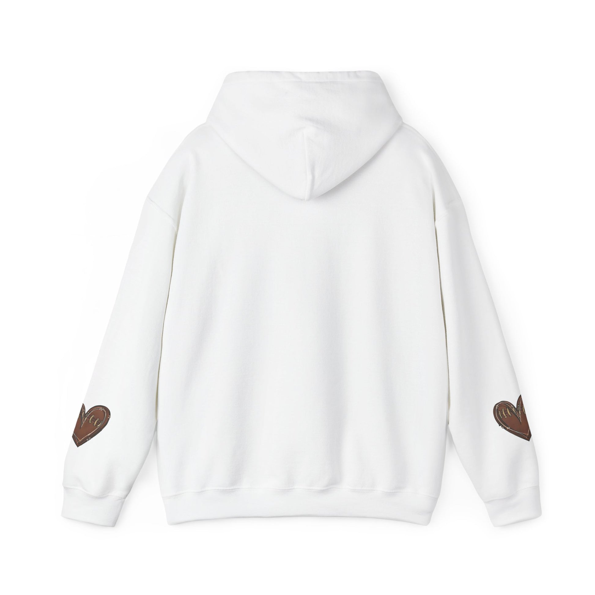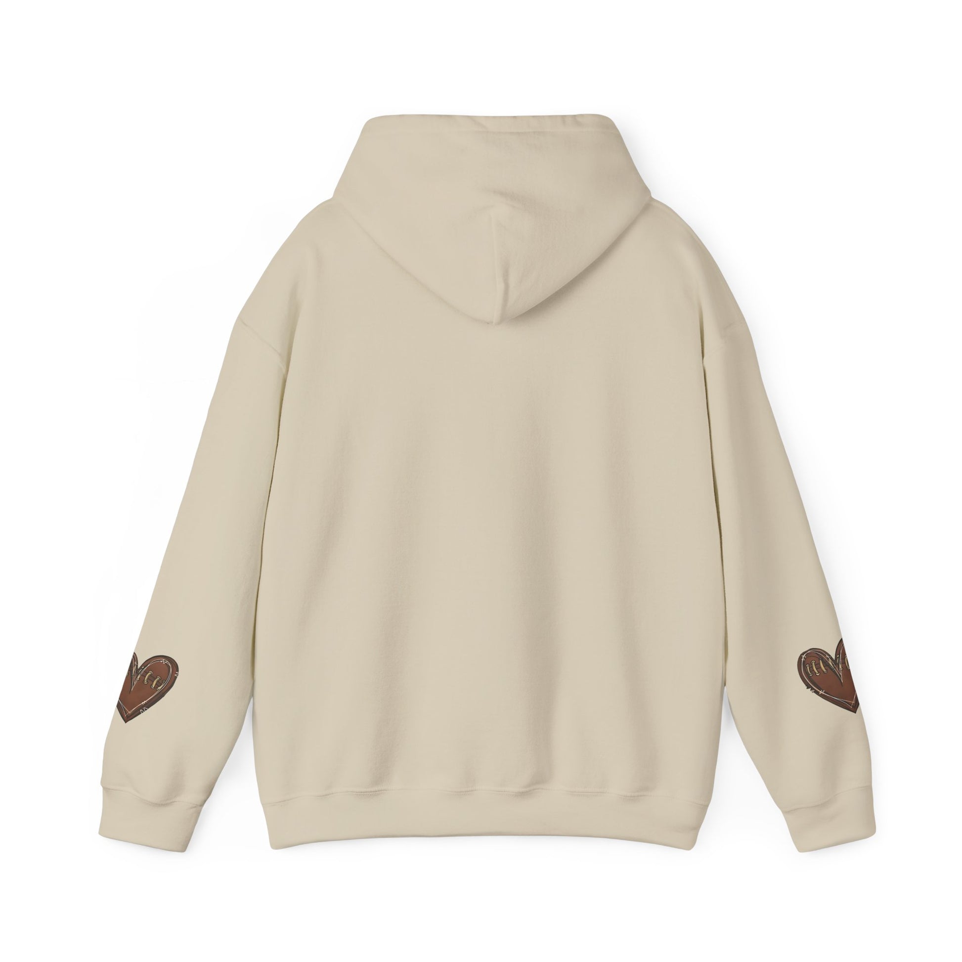 A game day hoodie with customizable back and football heart sleeves, perfect for football fans looking for a cozy and stylish way to support their favorite team. This hoodie is ideal for fall season games or watching football at home.
