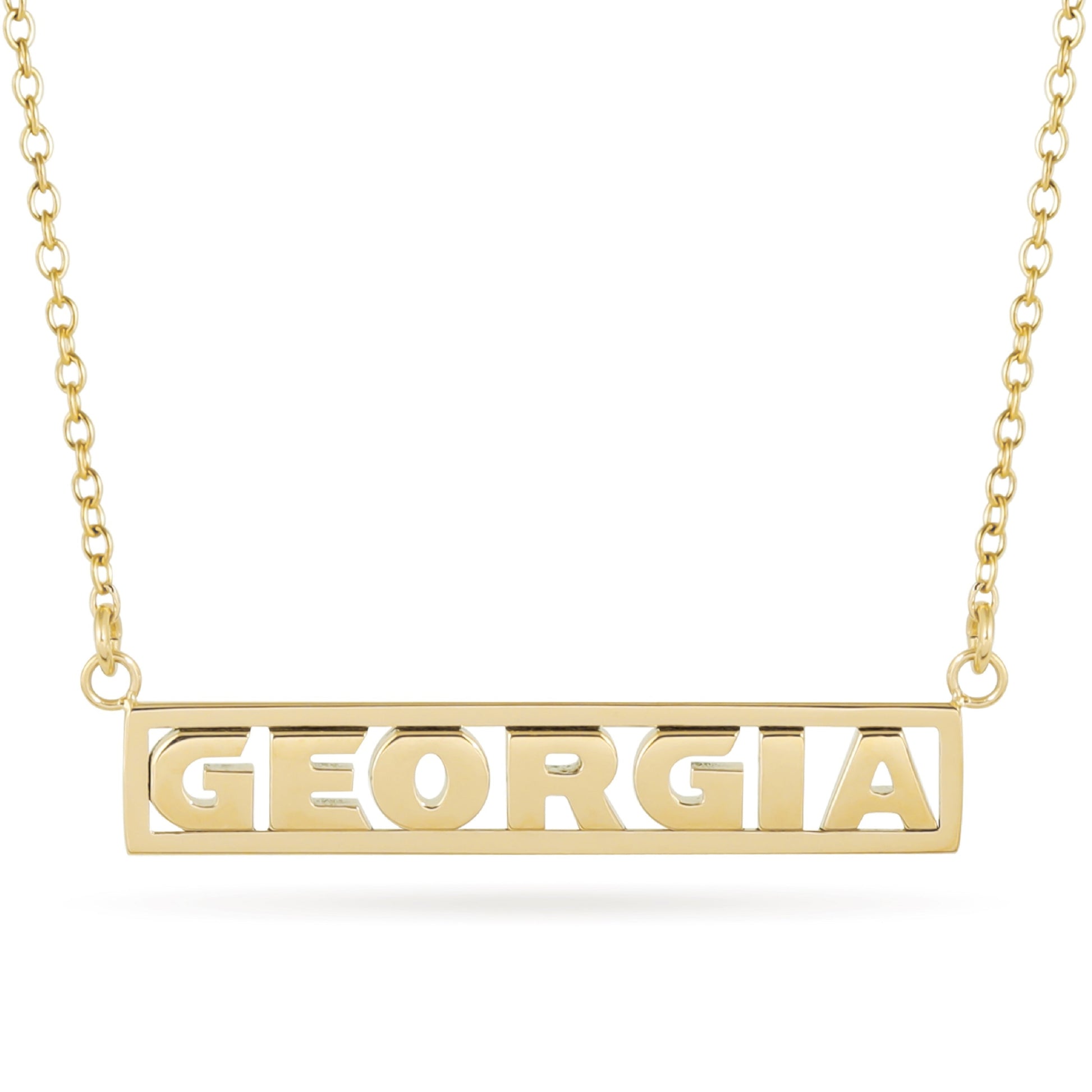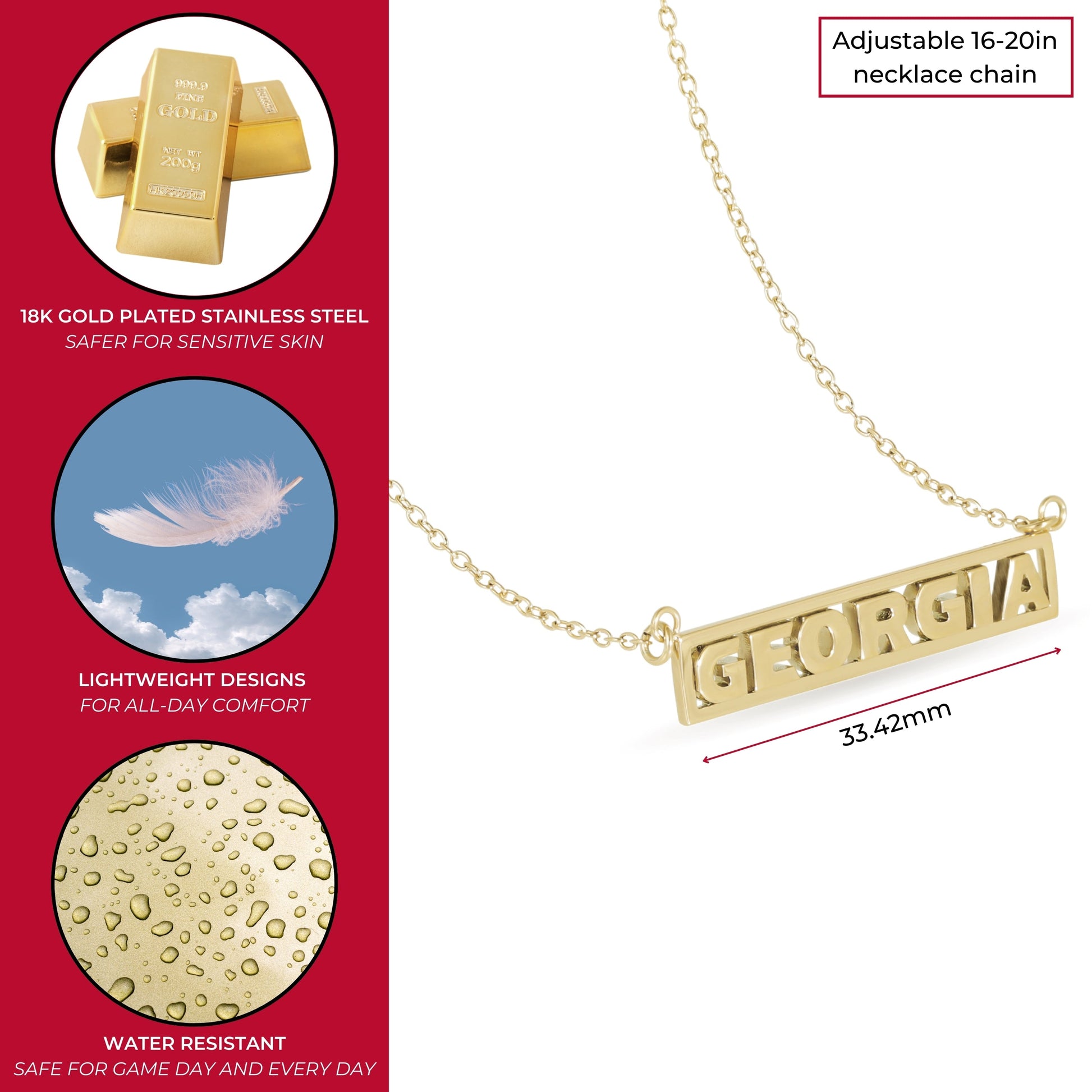 - YOUR PERFECT FIT: This gold Georgia necklace is adjustable in size, with a chain that adjusts between 16-20 inches. Add this classic Georgia necklace to show off your beloved Georgia Bulldogs school and team. The GEORGIA lettering measures 6.30mm tall by 33.42mm wide.