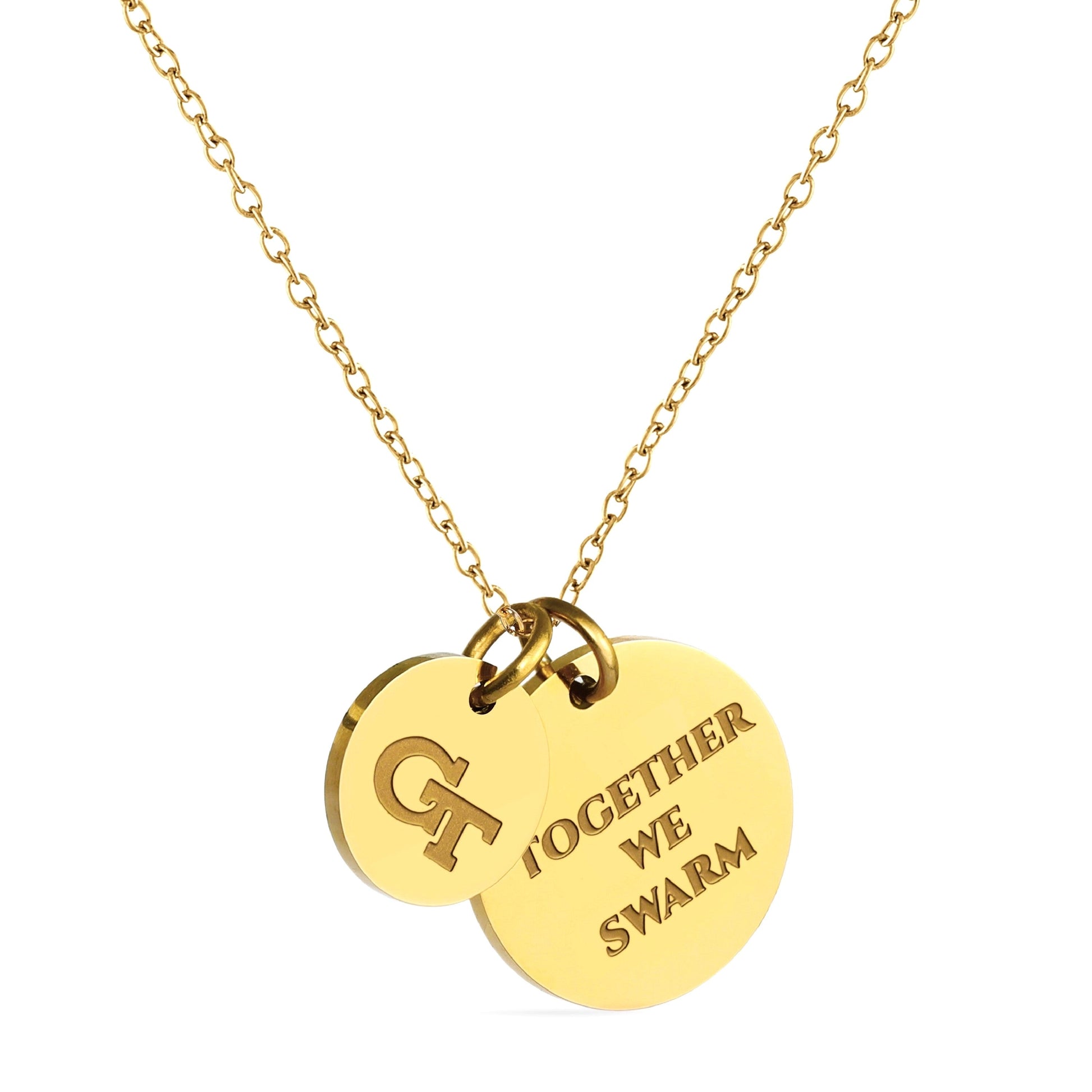 Proudly display your Georgia Tech Yellow Jackets pride with this officially licensed Georgia Tech necklace, featuring two gold-plated pendants engraved with the iconic Block GT and the inspiring mantra, 'Together We Swarm This pendant necklace, made from surgical-grade stainless steel and coated in 18K gold, offers both durability and elegance. Its adjustable length (16-20 inches) makes it perfect for everyday wear or Georgia Tech game day. Whether you're attending a game or gifting it for a special occasion, this necklace is ideal for Georgia Tech fans, students, and alumni. It makes a thoughtful present for birthdays, Mother’s Day, graduations, Christmas, any other celebration. Packaged simply yet beautifully, this necklace arrives ready for gifting, ensuring it will delight any Georgia Tech fan