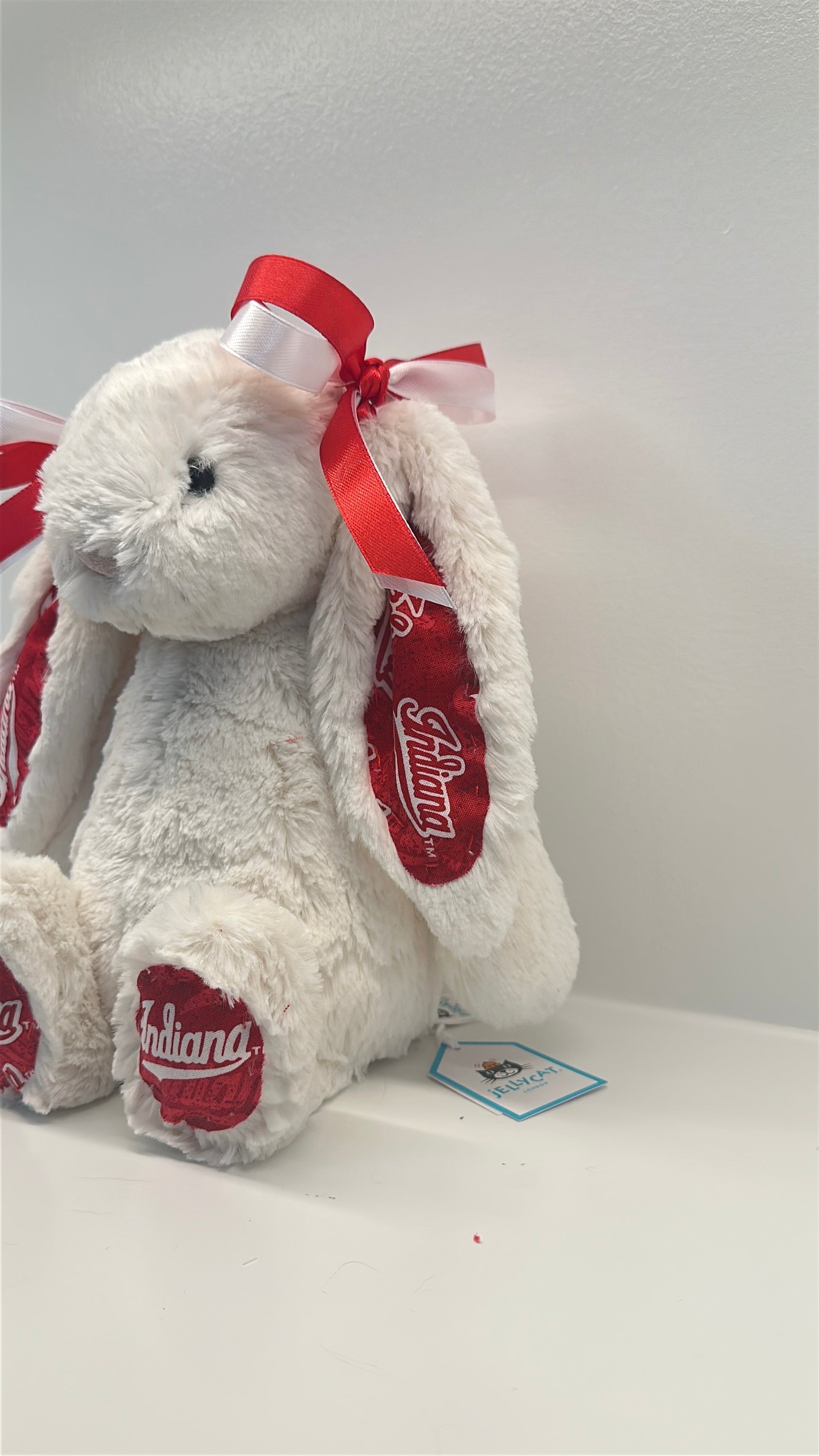 Snuggle up with this Custom College Jellycat Bashful Bunny. Each plush is adorned with custom fabric for Indiana University, featuring coordinated ears, feet, and matching bows that bring your university’s colors and spirit to life. This adorable plush makes the perfect gift for newly accepted students, homesick college kids, devoted fans, alumni, and anyone who wants a cozy reminder of campus life.