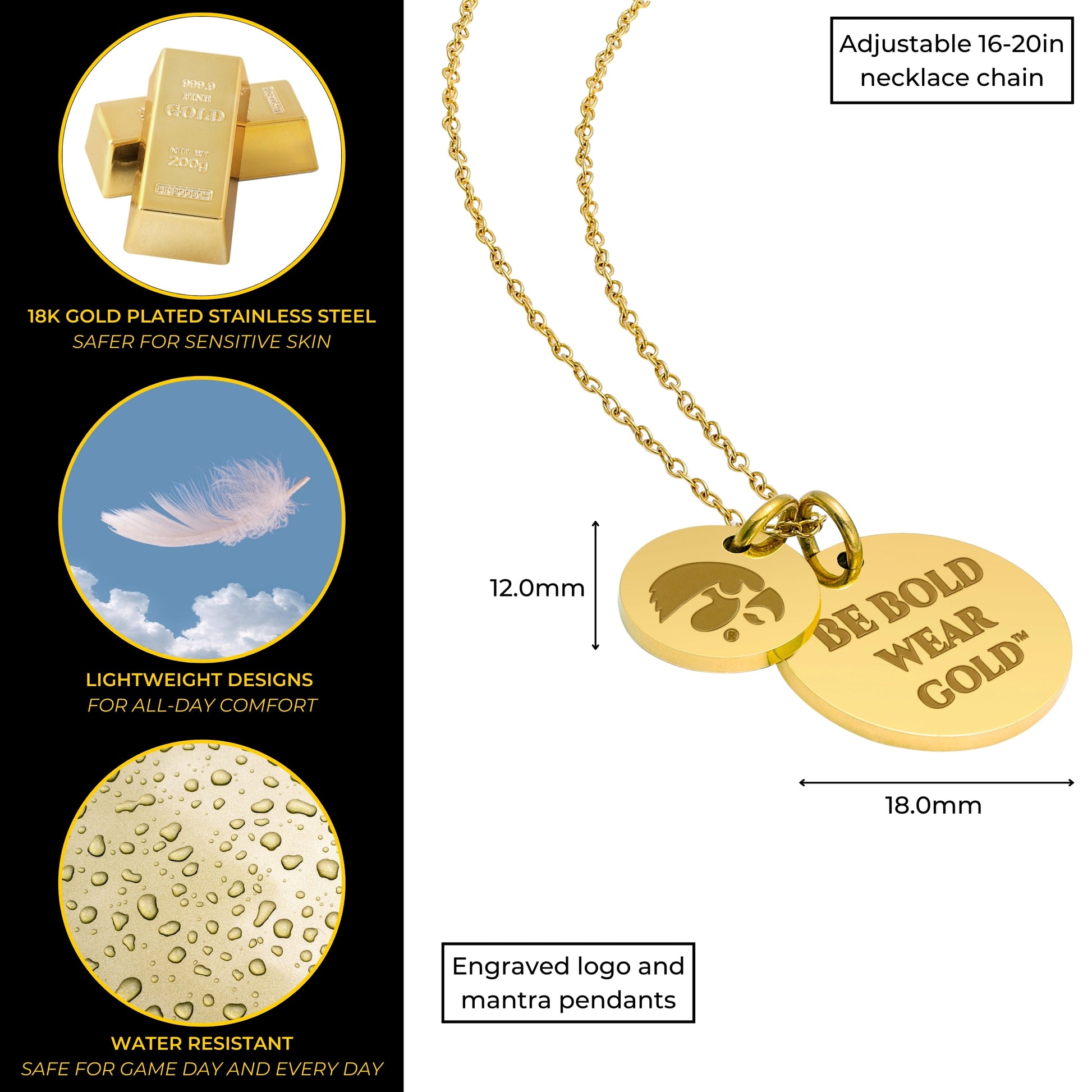 Proudly display your Iowa Hawkeyes pride with this officially licensed Iowa necklace, featuring two gold-plated pendants engraved with the iconic Tigerhawk and the inspiring mantra, 'Be Bold Wear Gold This pendant necklace, made from surgical-grade stainless steel and coated in 18K gold, offers both durability and elegance. Its adjustable length (16-20 inches) makes it perfect for everyday wear or Iowa game day. Whether you're attending a game or gifting it for a special occasion, this necklace is ideal for Iowa fans, students, and alumni. It makes a thoughtful present for birthdays, Mother’s Day, graduations, Christmas, any other celebration. Packaged simply yet beautifully, this necklace arrives ready for gifting, ensuring it will delight any Iowa fan
