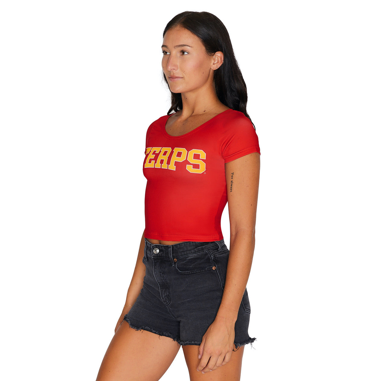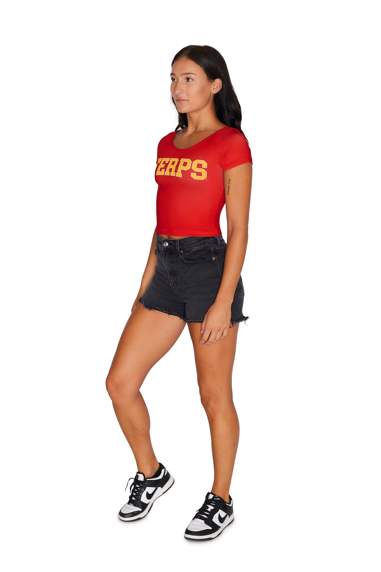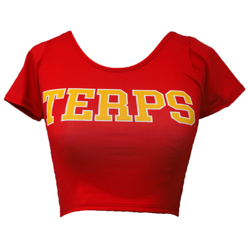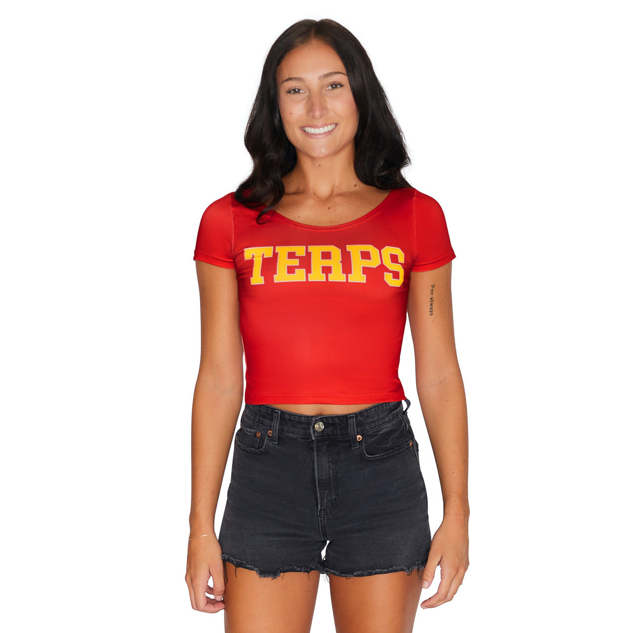 This super flattering University of Maryland Cropped and Fitted Tee is perfect for college game day paired with our Black Biker Shorts, our Maryland Plaid Skirt, or our Black Tailgate Skirt! Our UMD Terps Red Babydoll Tee's stretchy fabric makes it the perfect option for all body types. Stretchy and soft, you'll want to rock this top every day! Go Terps!