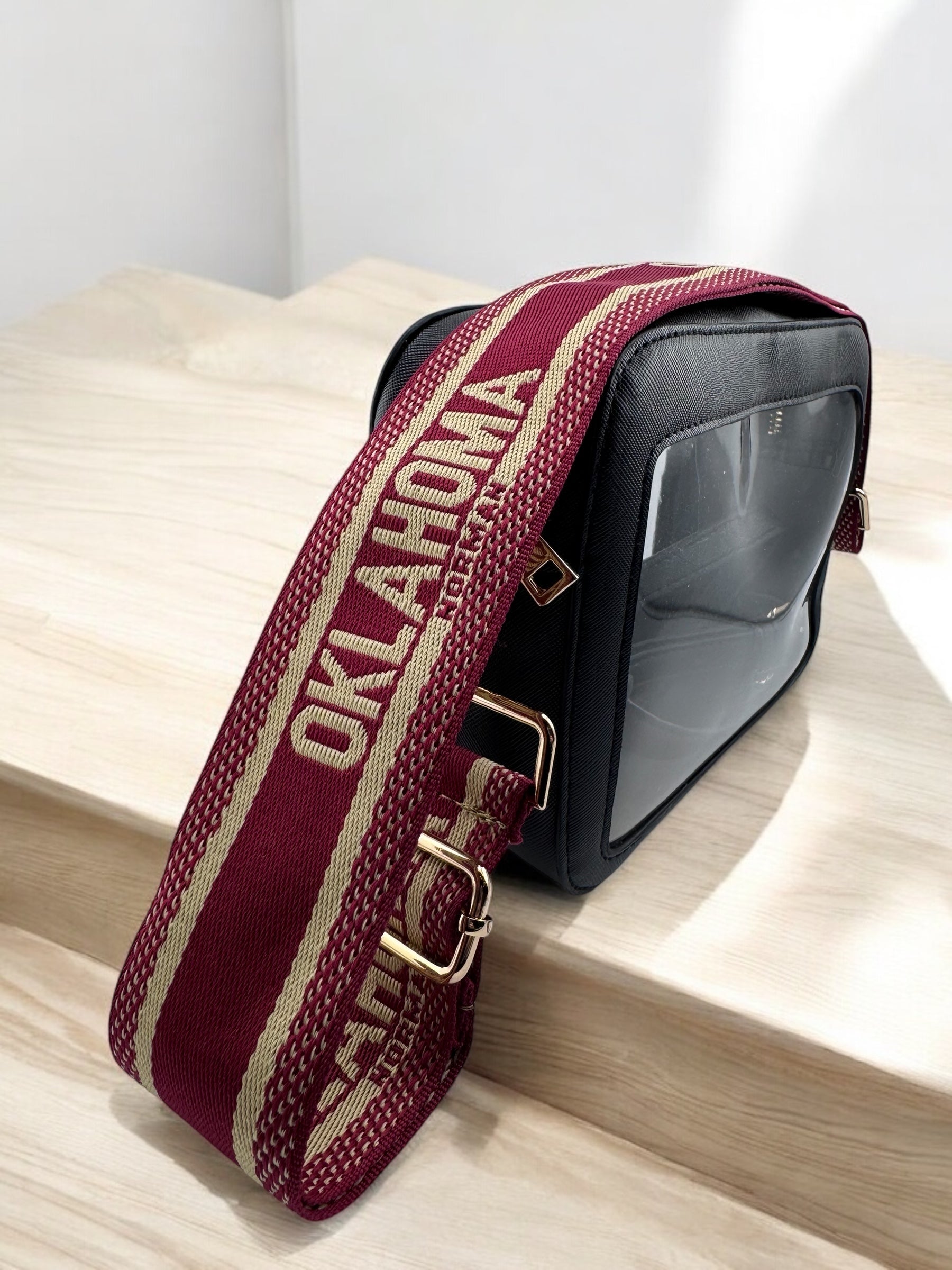 This Sporty Bag is the perfect way to show off your Gameday spirit. Available in Black and White saffiano vegan leather with Gold hardware. The Michelle bag comes with an adjustable nylon cross body strap. Measurements are 8 x 6 x 2 with a zipper enclosure. Pair with our exclusively designed for a Luxe Gameday look