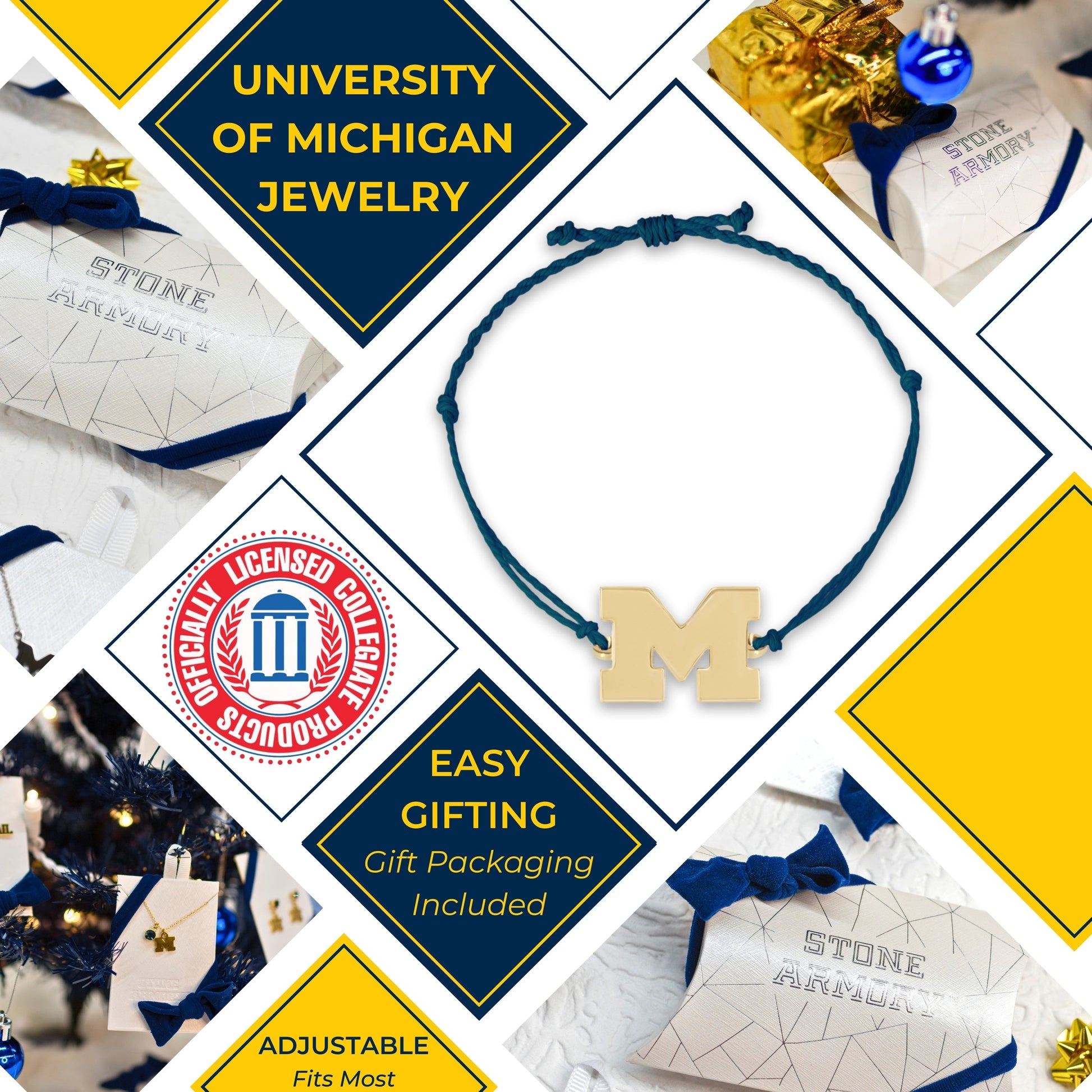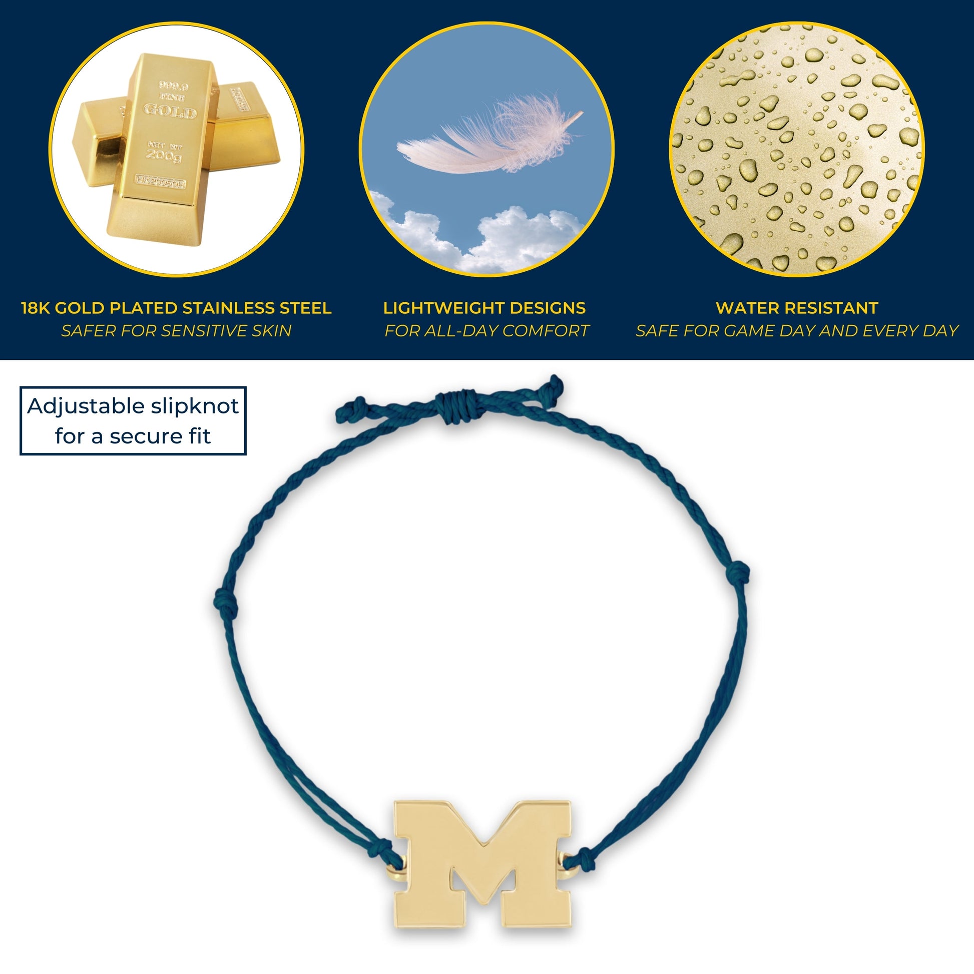 Elevate your style with our University of Michigan bracelet, exquisitely crafted with 18K gold plated stainless steel with a waxed cord band and meticulously designed to offer Michigan Wolverines elegance and durability. This stunning Michigan bracelet is the perfect accessory for any occasion, blending timeless style with modern sophistication. Our Wolverines Jewelry offers an adjustable design, ensuring a perfect fit for everyone and allowing you to choose a snug or loose fit according to your preference. This Michigan bracelet is also great for stacking and layering! Made from high-quality 18K gold plated stainless steel and waxed cord, this bracelet is safe for sensitive skin, offering visual luxury without any irritation. Each Wolverines bracelet is designed to maintain its shine and color with long-lasting beauty and durability. The sleek and elegant design makes it a versatile piece that complements any outfit and especially Michigan Wolverines Apparel; from casual to formal wear to Michigan Wolverines Football Gamedays, showcase your Michigan Wolverines pride. Featuring a secure bolo-style closure, you can wear your bracelet with confidence, knowing it will stay in place all day long. This adjustable cord bracelet captures the spirit and tradition of University of Michigan with the iconic Block M. Ready to gift, our UM jewelry comes in beautiful, elegant packaging with a bow, making perfect Wolverines Gifts for women, Michigan Birthday Gifts, Graduation Gifts, Michigan Alumni Gifts, back-to-school, or anyone that is an University of Michigan fan. Enjoy the ease of maintaining your bracelet with simple cleaning, ensuring it remains radiant and beautiful for years to come. With its classic design, this Michigan bracelet transcends trends, offering a timeless piece that you'll cherish forever. Go Blue!