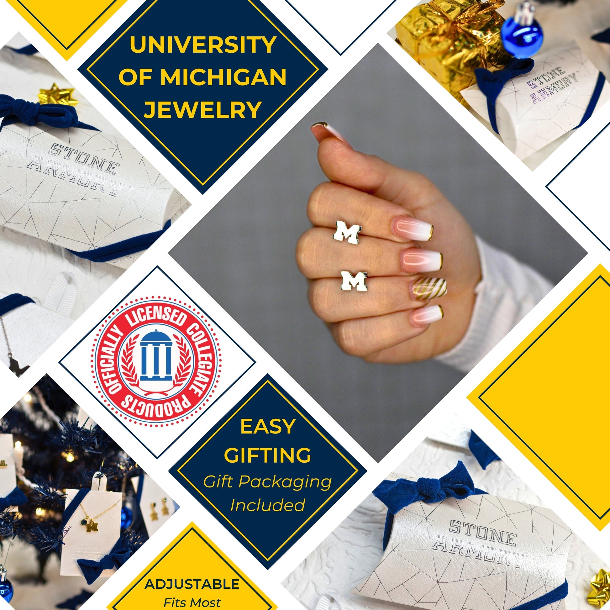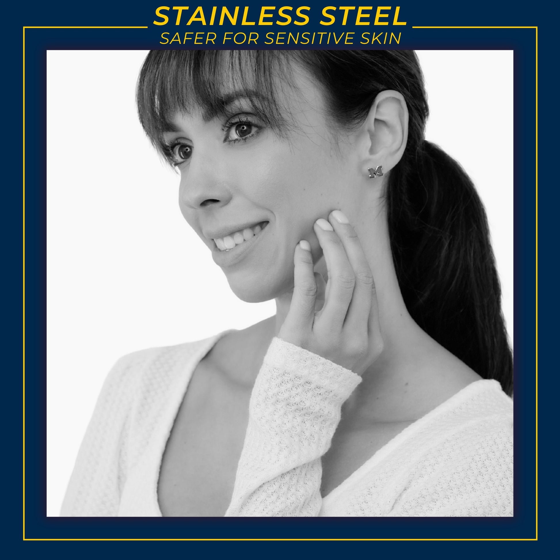 The stainless steel Michigan Block M stud earrings are here! Gear up for the game with our beautifully designed Michigan Wolverines earrings. Wear them to your next tailgate or around town to show off your University of Michigan pride! These stainless steel UM earrings would also make the perfect Michigan gift for your favorite Michigan Wolverines fan. Our UM jewelry is made of stainless steel and carefully designed, making these NCAA Michigan stud earrings the perfect gift to celebrate Michigan graduation, birthdays, Mother's Day, first day of school, the first game, or for everyday fan wear.