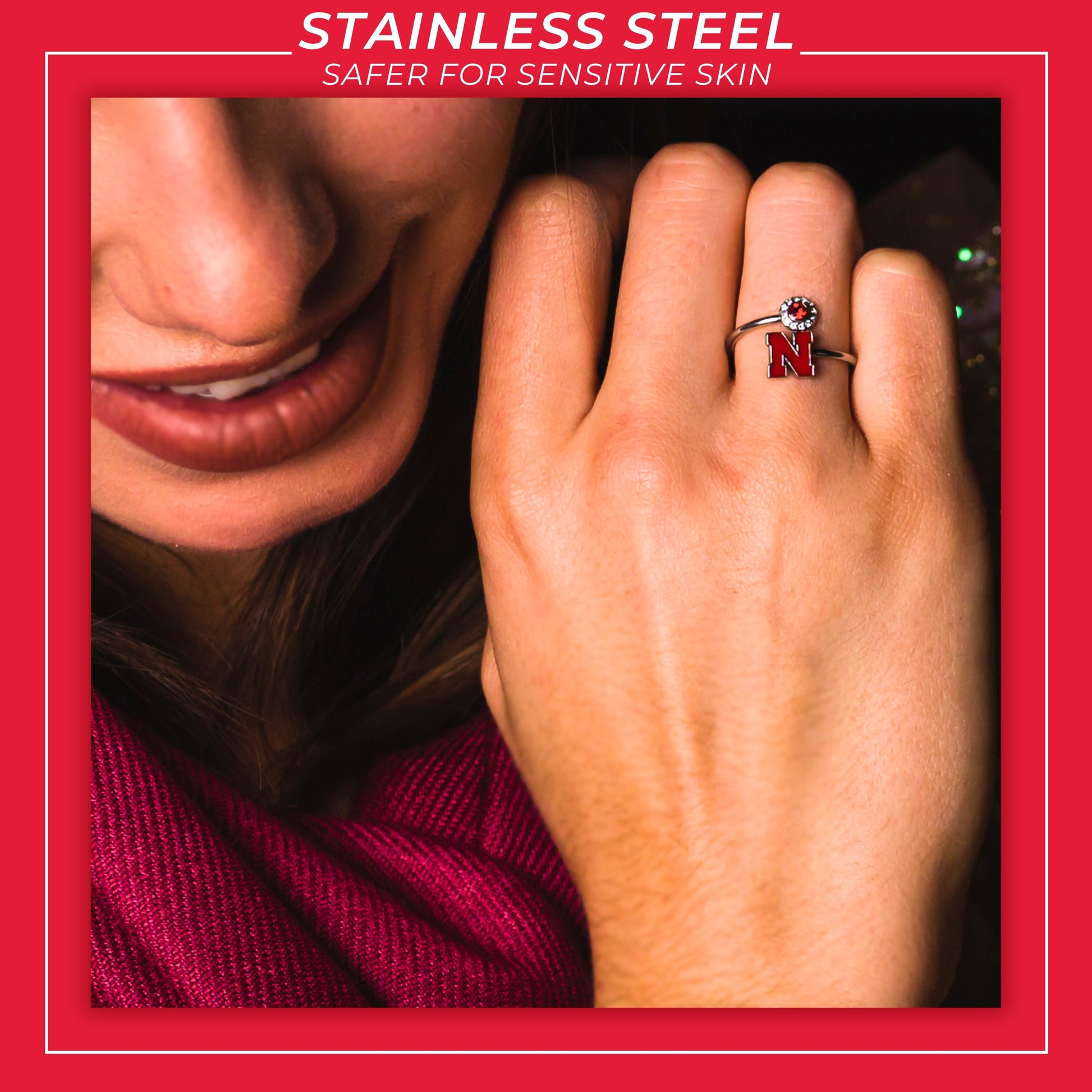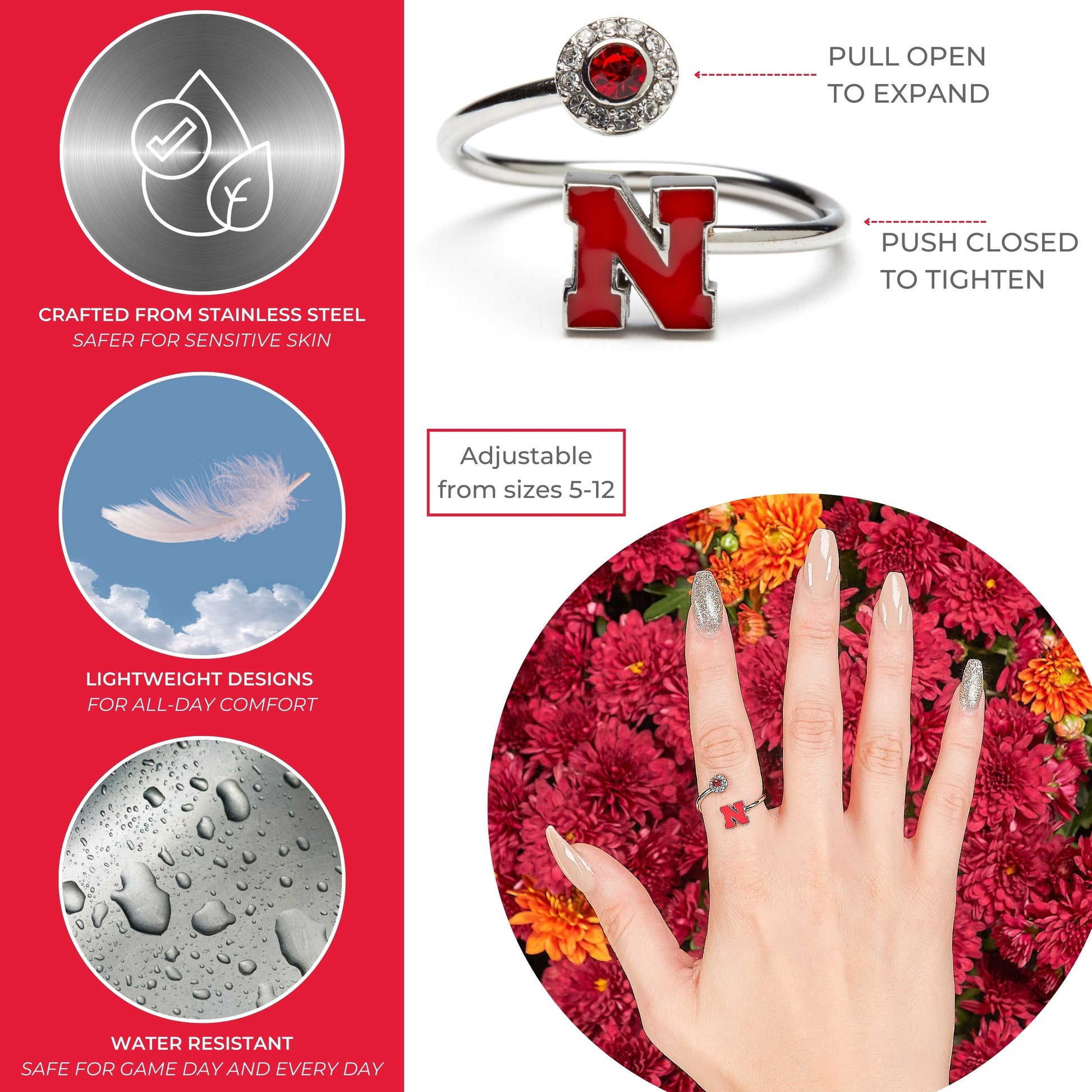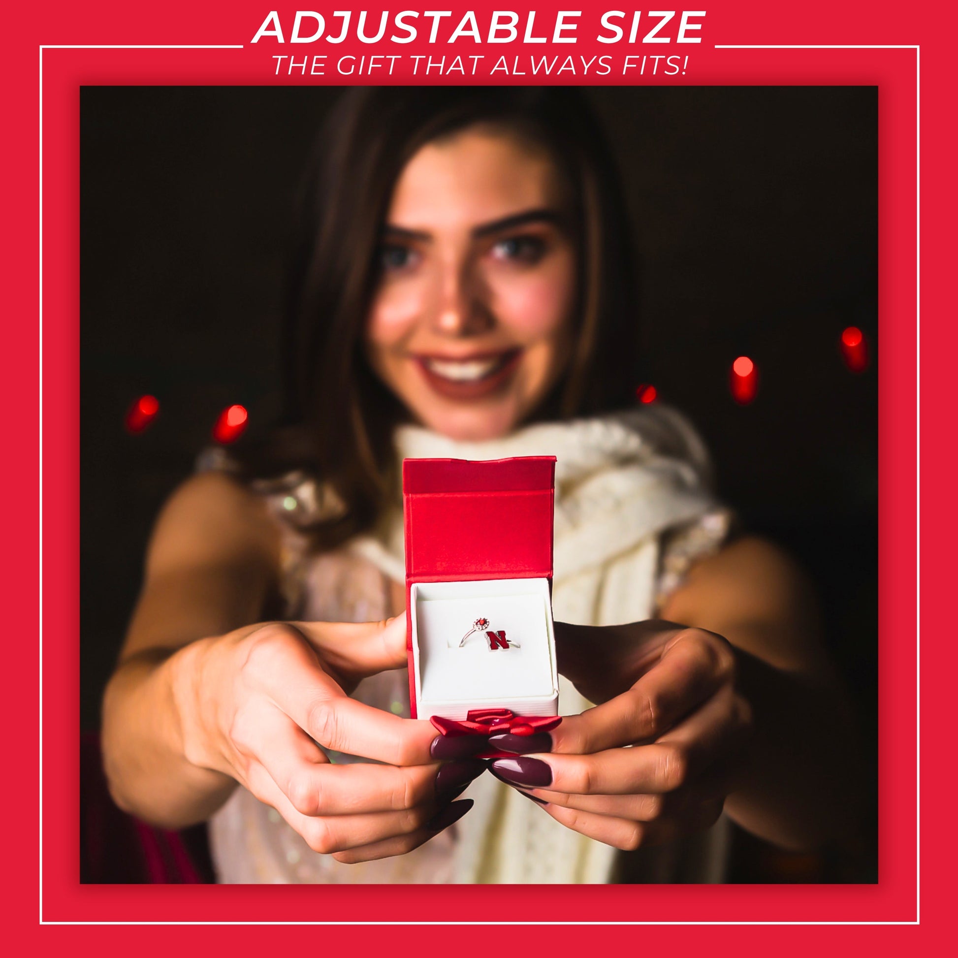 - ❤️THE PERFECT University of Nebraska GIFT: This UN Cornhuskers ring is adjustable in size and will fit most, making it the perfect womens gift for yourself, Nebraska fans, graduates, students, moms, sisters, daughters and Nebraska alumni. Great gift for Mother's Day, Christmas, birthdays and graduation. Go Big Red!