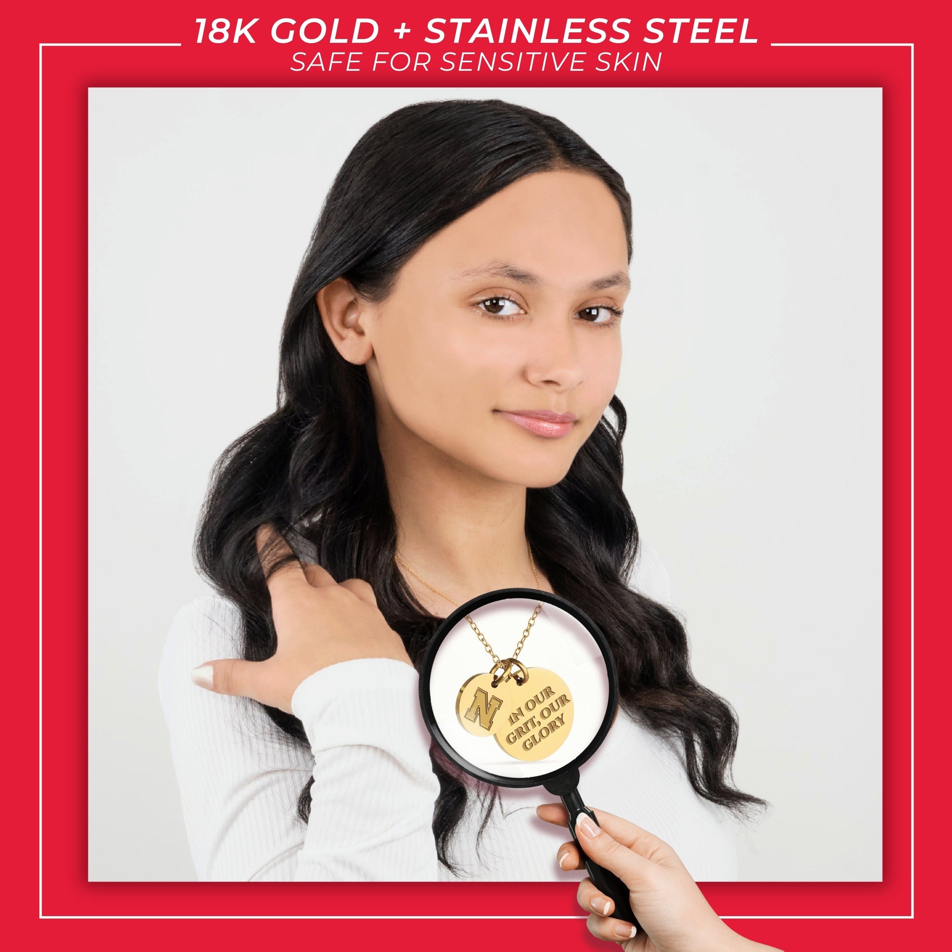 Proudly display your Nebraska Cornhuskers pride with this officially licensed Nebraska necklace, featuring two gold-plated pendants engraved with the iconic Nebraska N and the inspiring mantra, 'In Our Grit, Our Glory This pendant necklace, made from surgical-grade stainless steel and coated in 18K gold, offers both durability and elegance. Its adjustable length (16-20 inches) makes it perfect for everyday wear or Nebraska game day. Whether you're attending a game or gifting it for a special occasion, this necklace is ideal for Nebraska fans, students, and alumni. It makes a thoughtful present for birthdays, Mother’s Day, graduations, Christmas, any other celebration. Packaged simply yet beautifully, this necklace arrives ready for gifting, ensuring it will delight any Nebraska fan