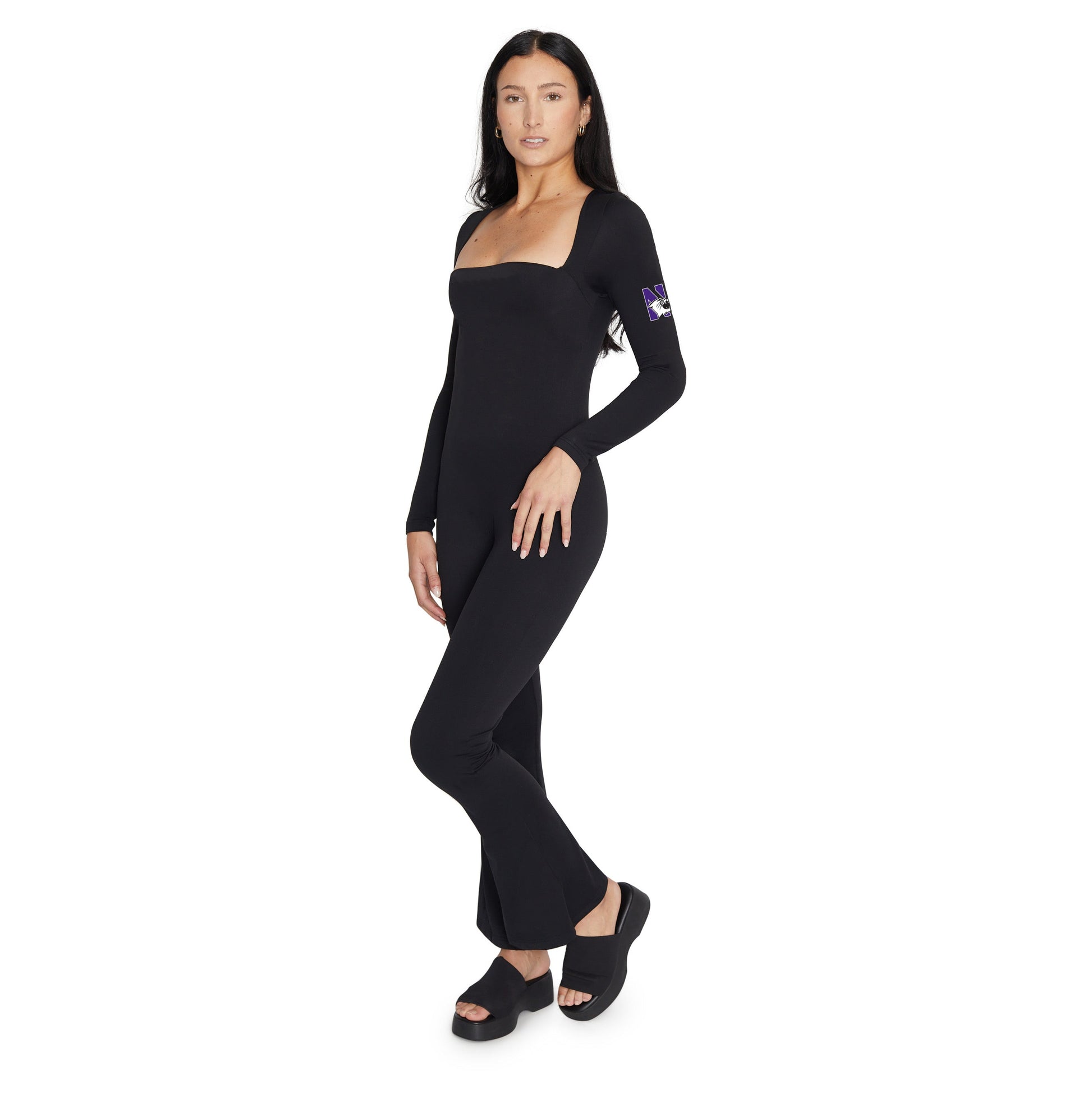 NEW & LIMITED QUANTITIES IN STOCK. The hottest new catsuit is here - super soft, stretchy and cute. With a square neckline and flare bottoms - this will be your most flattering outfit! Our full body catsuit with soft coverage from our softest fabric with light all-over compression for the most energizing, yet comfortable and figure-flattering fit. This one of a kind outfit is perfect for game days, work outs and lounging. Mix and match endless ways - with our denim jacket, under a pair of jeans for a bodysuit look on colder days, or rock this jumpsuit on its own for a game winning look.