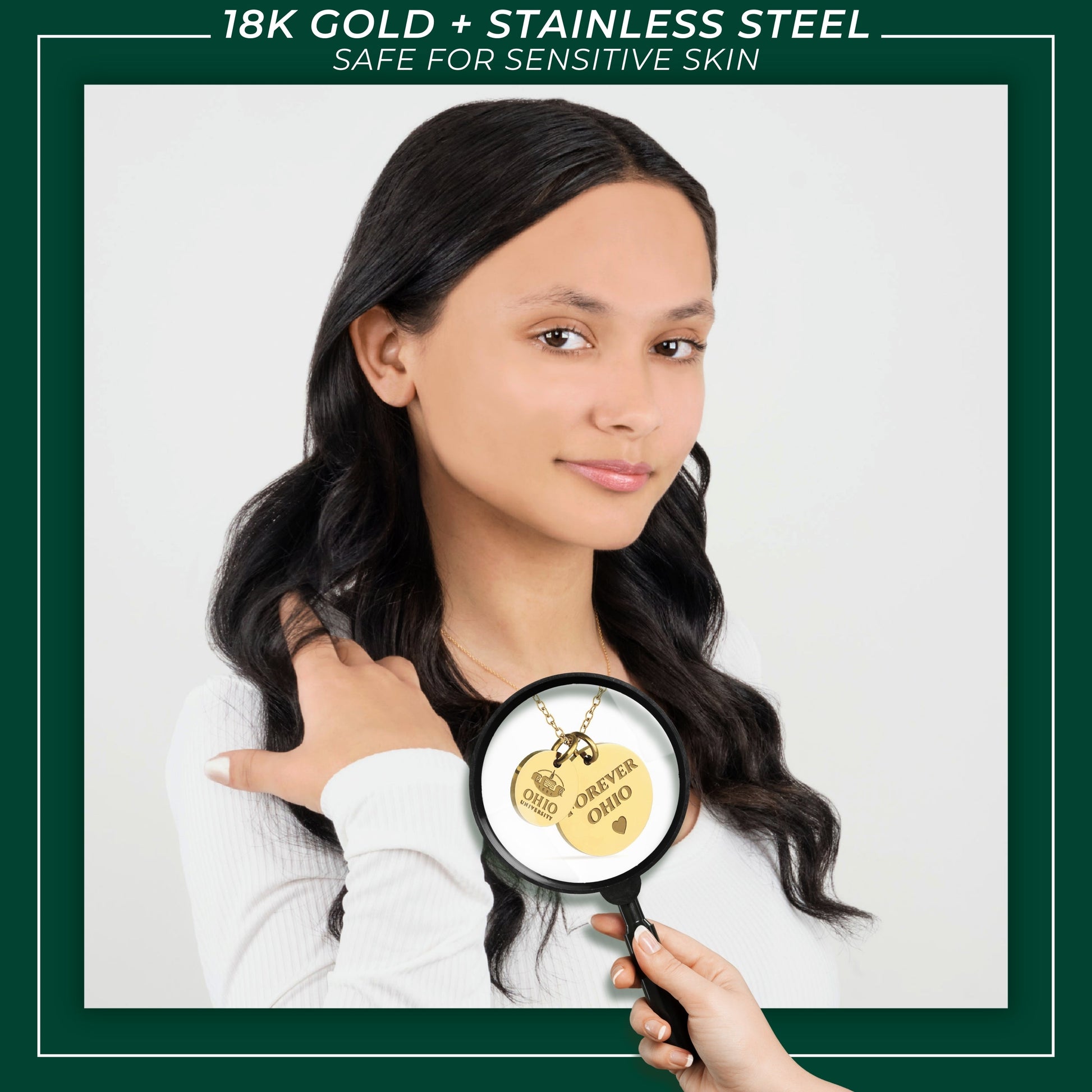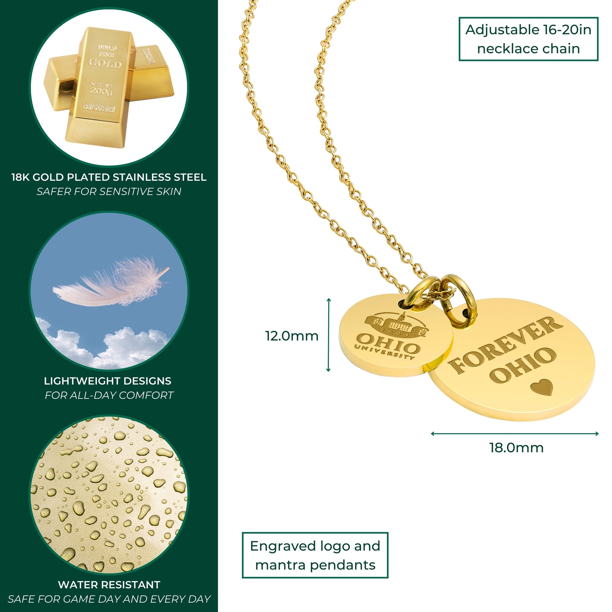 Proudly display your Ohio Bobcats pride with this officially licensed Ohio necklace, featuring two gold-plated pendants engraved with the iconic Ohio University woodcut logo and the inspiring mantra, 'Forever Ohio This pendant necklace, made from surgical-grade stainless steel and coated in 18K gold, offers both durability and elegance. Its adjustable length (16-20 inches) makes it perfect for everyday wear or Ohio game day. Whether you're attending a game or gifting it for a special occasion, this necklace is ideal for Ohio fans, students, and alumni. It makes a thoughtful present for birthdays, Mother’s Day, graduations, Christmas, any other celebration. Packaged simply yet beautifully, this necklace arrives ready for gifting, ensuring it will delight any Ohio fan