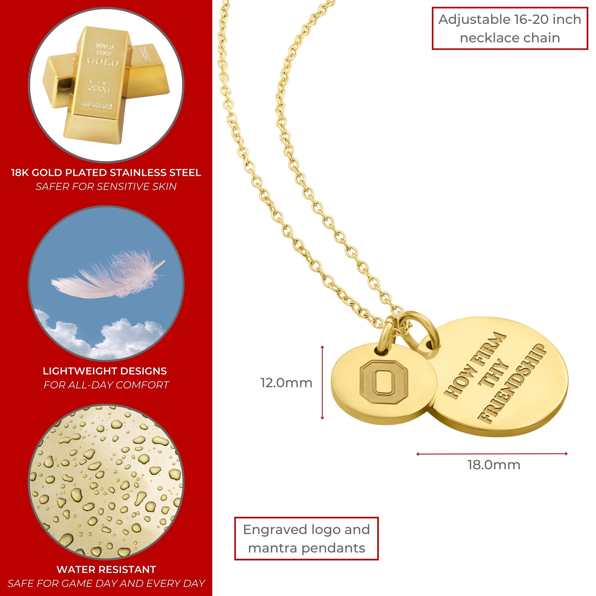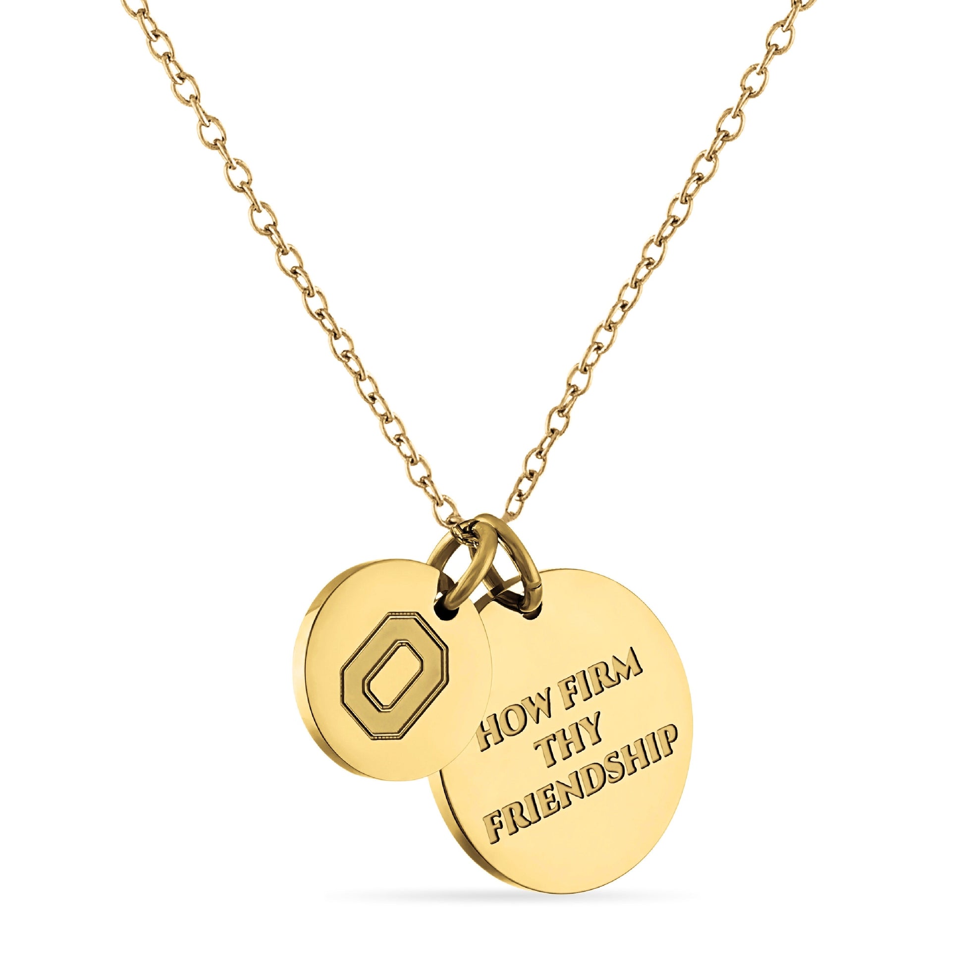 Proudly display your Ohio State Buckeyes pride with this officially licensed Ohio State necklace, featuring two gold-plated pendants engraved with the iconic Block O and the inspiring mantra, 'How Firm Thy Friendship This pendant necklace, made from surgical-grade stainless steel and coated in 18K gold, offers both durability and elegance. Its adjustable length (16-20 inches) makes it perfect for everyday wear or Ohio State game day. Whether you're attending a game or gifting it for a special occasion, this necklace is ideal for Ohio State fans, students, and alumni. It makes a thoughtful present for birthdays, Mother’s Day, graduations, Christmas, any other celebration. Packaged simply yet beautifully, this necklace arrives ready for gifting, ensuring it will delight any Ohio State fan
