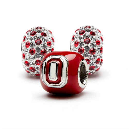 This scarlet Ohio State University charm bead is double sided with a Block O on one side and silver Buckeye Leaf on the other side. This set includes two scarlet crystal beads. Makes the perfect OSU graduation or Christmas gift.