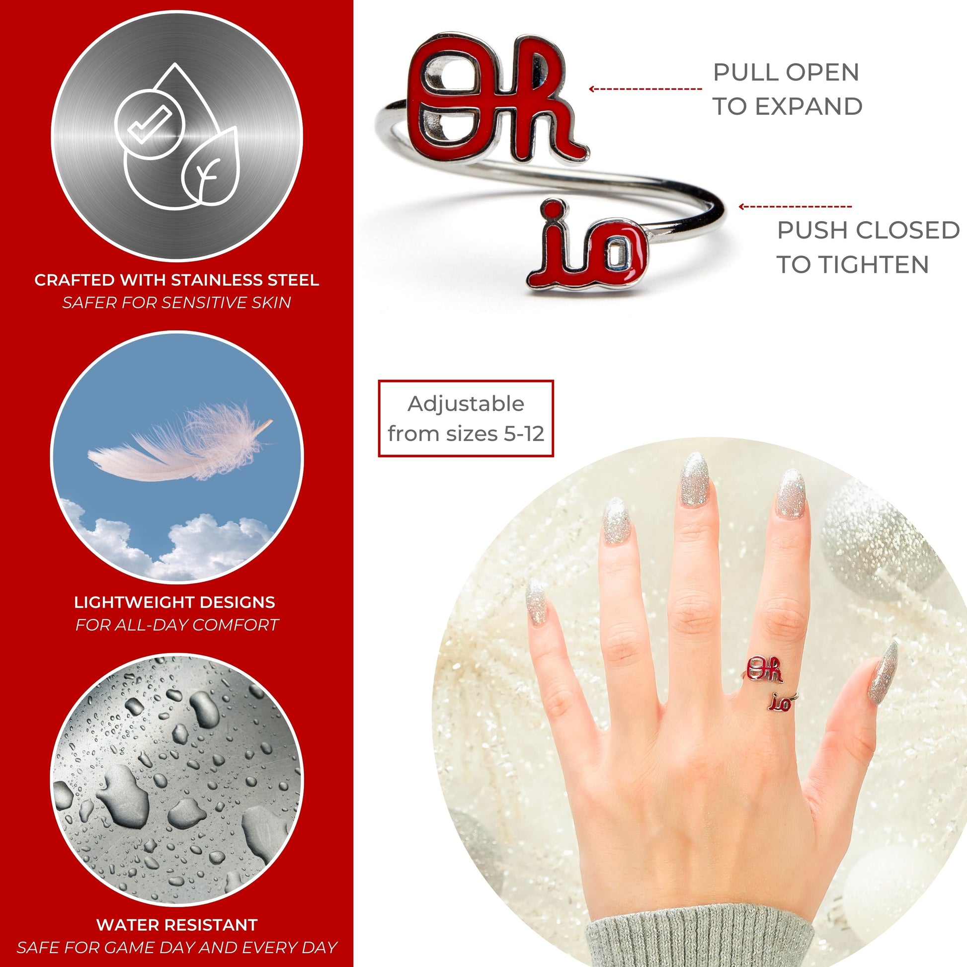 - ❤️YOUR PERFECT FIT: This stainless steel Ohio State ring is adjustable in size, fitting ring sizes 5-12. Add this sparkling classic Ohio State class ring to show off your beloved Ohio State Buckeyes school and team.