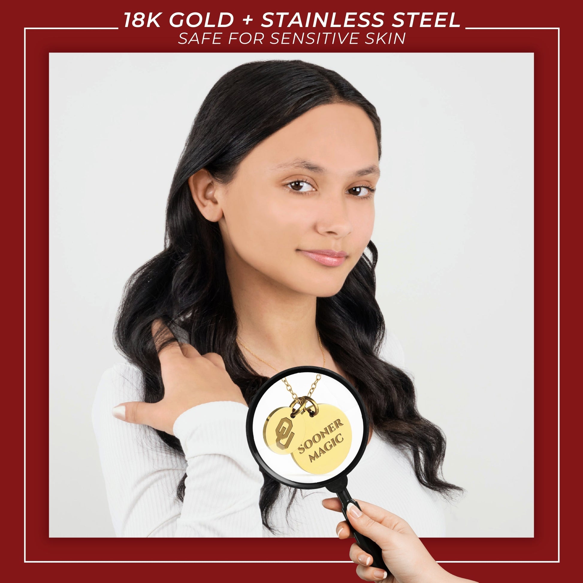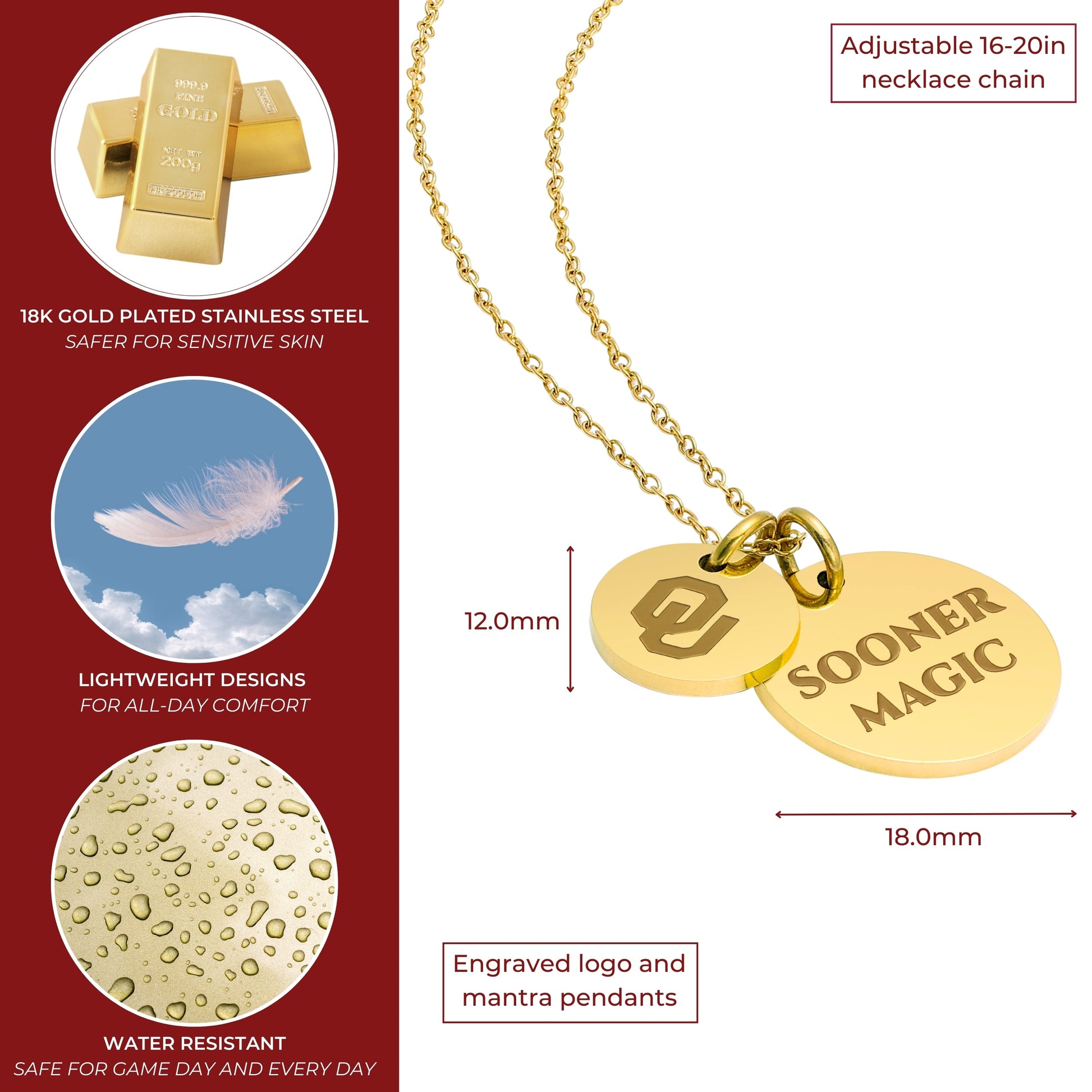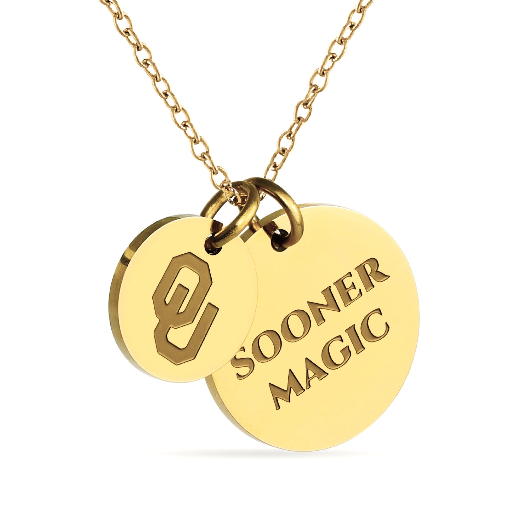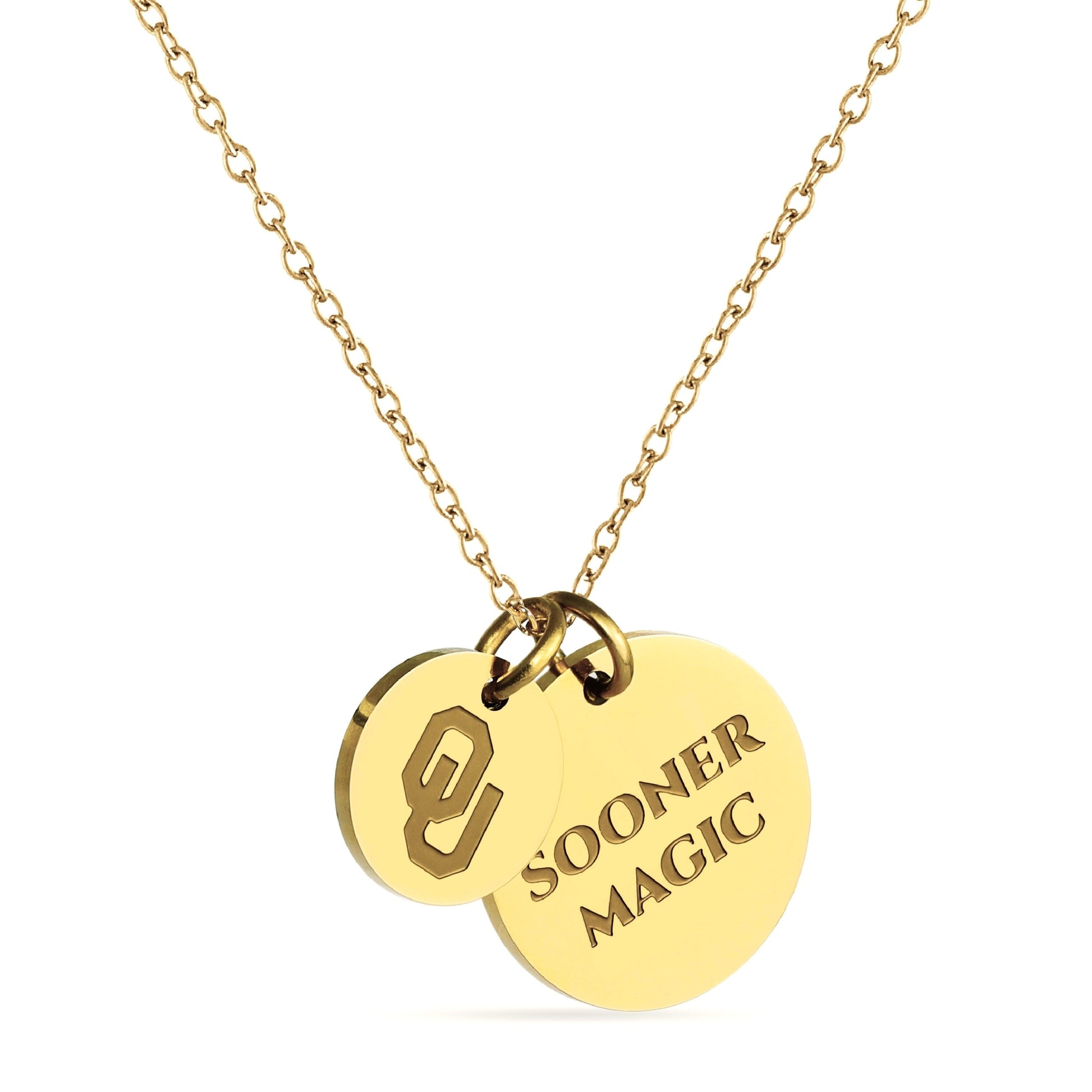 Proudly display your Oklahoma Sooners pride with this officially licensed Oklahoma necklace, featuring two gold-plated pendants engraved with the iconic Block OU and the inspiring mantra, 'Sooner Magic This pendant necklace, made from surgical-grade stainless steel and coated in 18K gold, offers both durability and elegance. Its adjustable length (16-20 inches) makes it perfect for everyday wear or Oklahoma game day. Whether you're attending a game or gifting it for a special occasion, this necklace is ideal for Oklahoma fans, students, and alumni. It makes a thoughtful present for birthdays, Mother’s Day, graduations, Christmas, any other celebration. Packaged simply yet beautifully, this necklace arrives ready for gifting, ensuring it will delight any Oklahoma fan