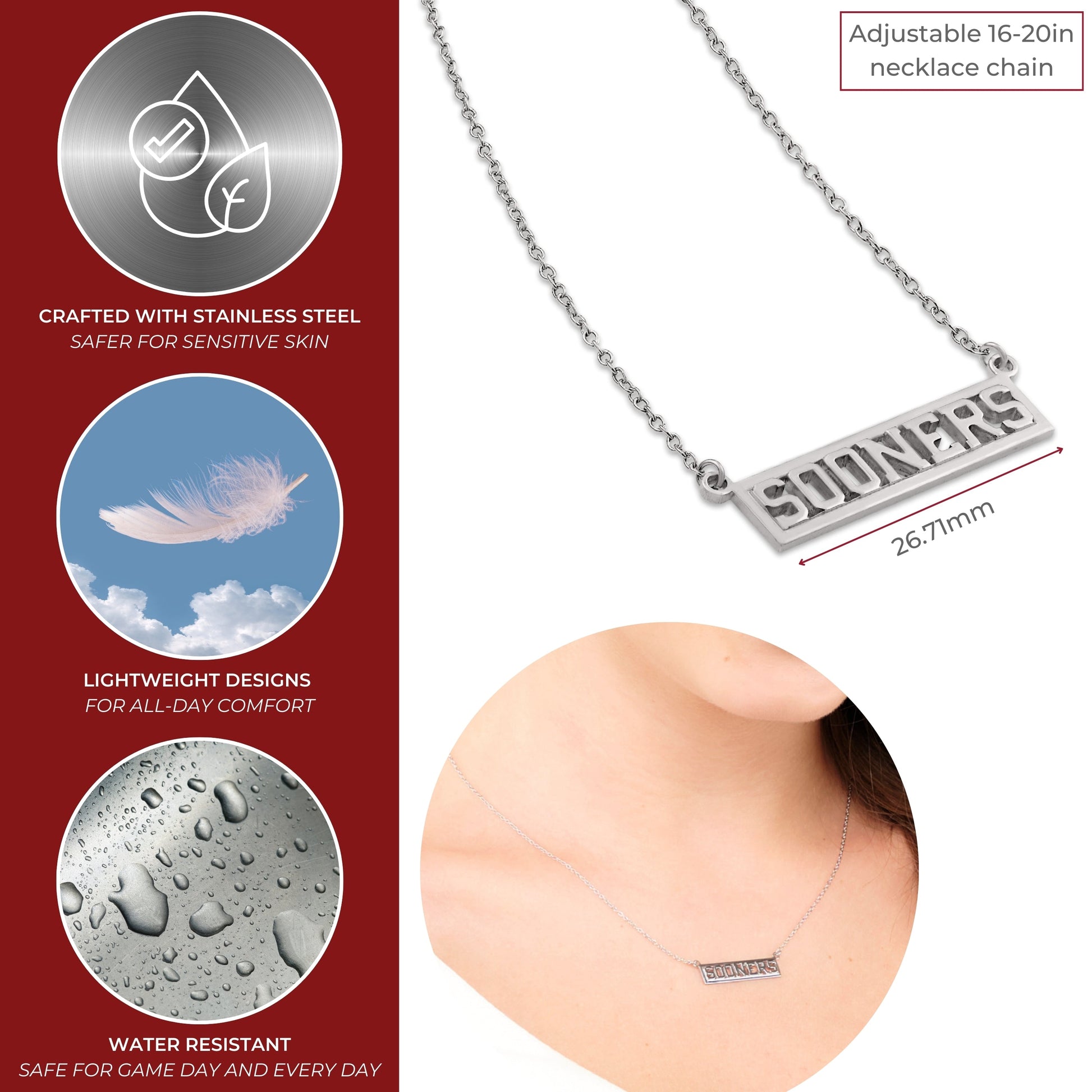 - YOUR PERFECT FIT: This stainless steel Oklahoma necklace is adjustable in size, with a chain that adjusts between 16-20 inches. Add this classic Oklahoma necklace to show off your beloved Oklahoma Sooners school and team. The SOONERS lettering measures 6.50mm tall by 26.71mm wide.