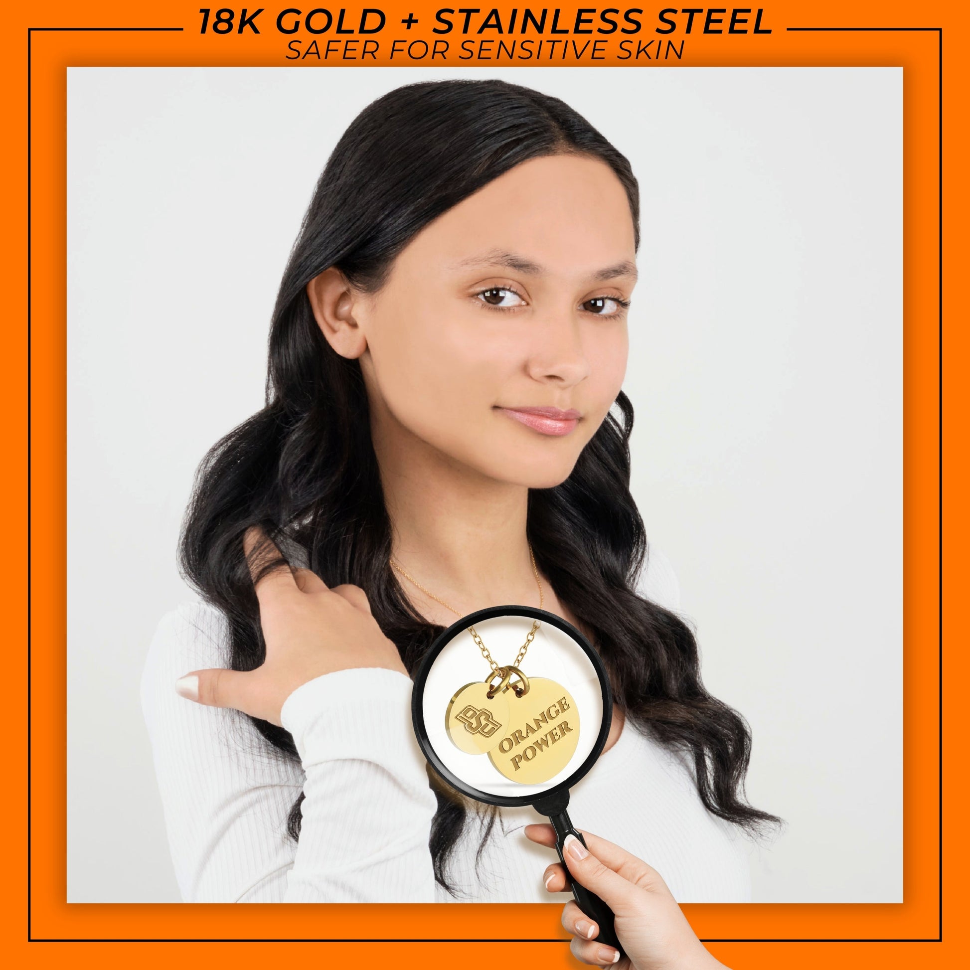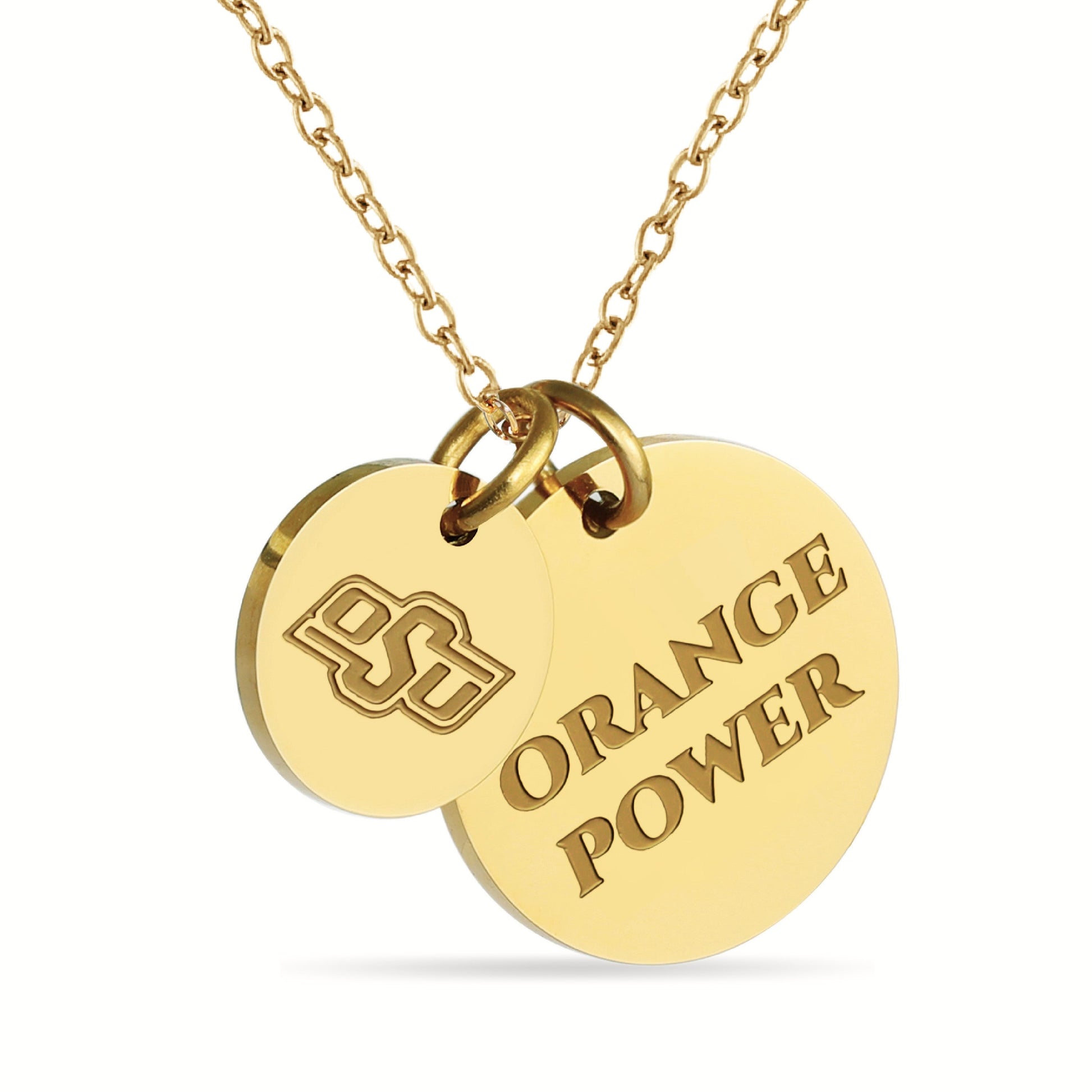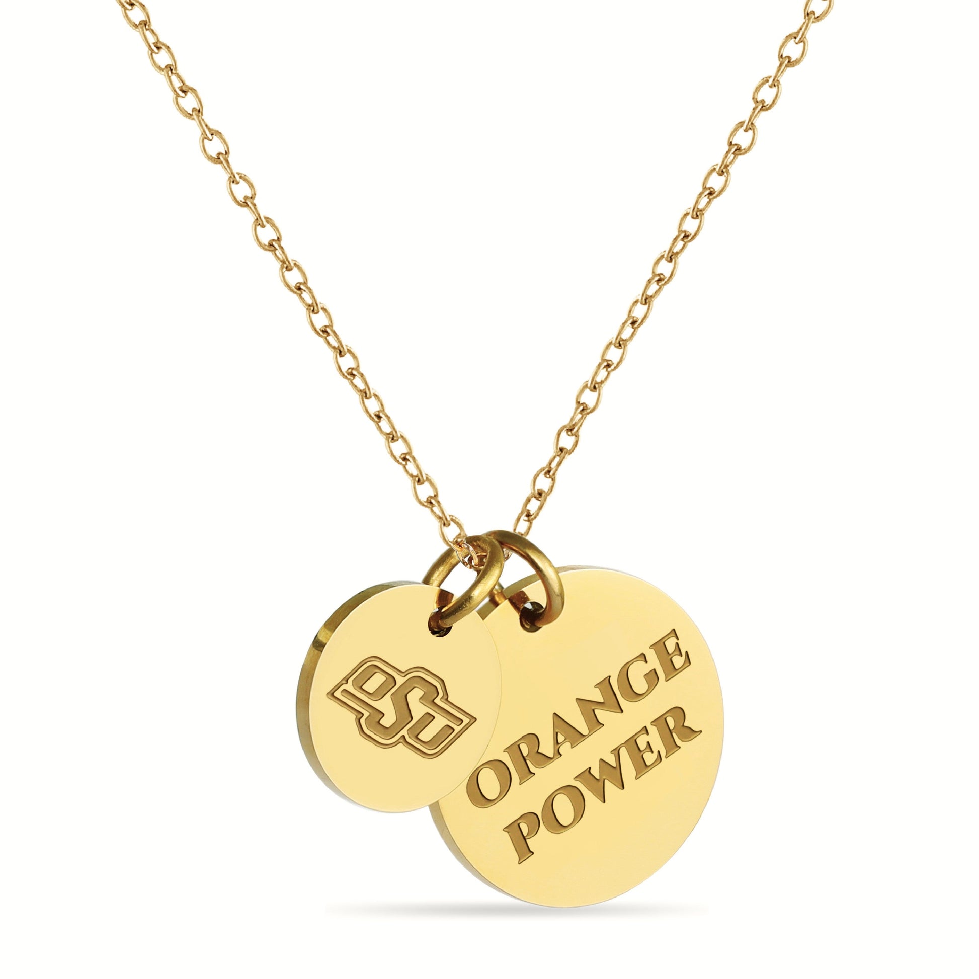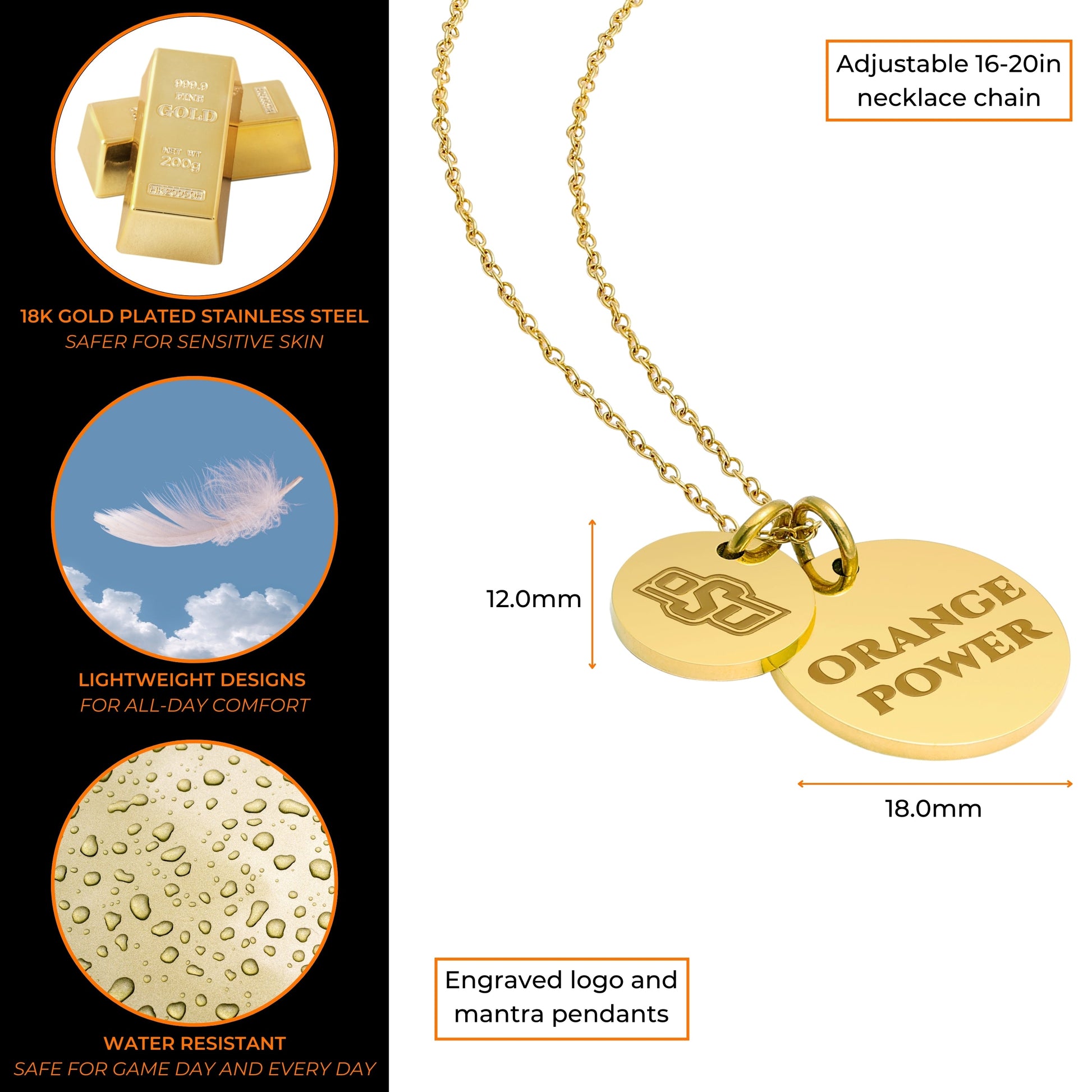 Proudly display your Oklahoma State Cowboys pride with this officially licensed Oklahoma State necklace, featuring two gold-plated pendants engraved with the iconic Block OSU and the inspiring mantra, 'Orange Power This pendant necklace, made from surgical-grade stainless steel and coated in 18K gold, offers both durability and elegance. Its adjustable length (16-20 inches) makes it perfect for everyday wear or Oklahoma State game day. Whether you're attending a game or gifting it for a special occasion, this necklace is ideal for Oklahoma State fans, students, and alumni. It makes a thoughtful present for birthdays, Mother’s Day, graduations, Christmas, any other celebration. Packaged simply yet beautifully, this necklace arrives ready for gifting, ensuring it will delight any Oklahoma State fan