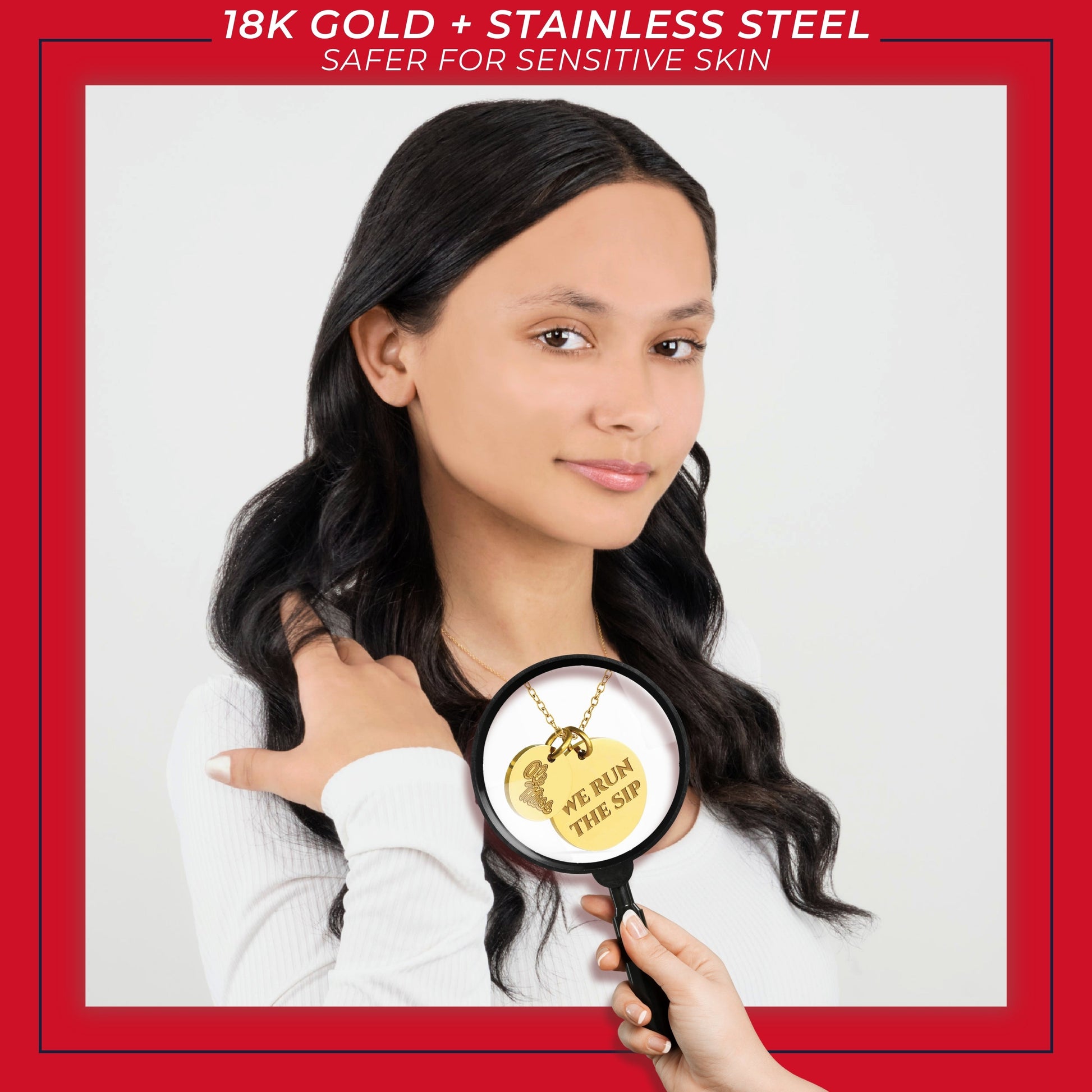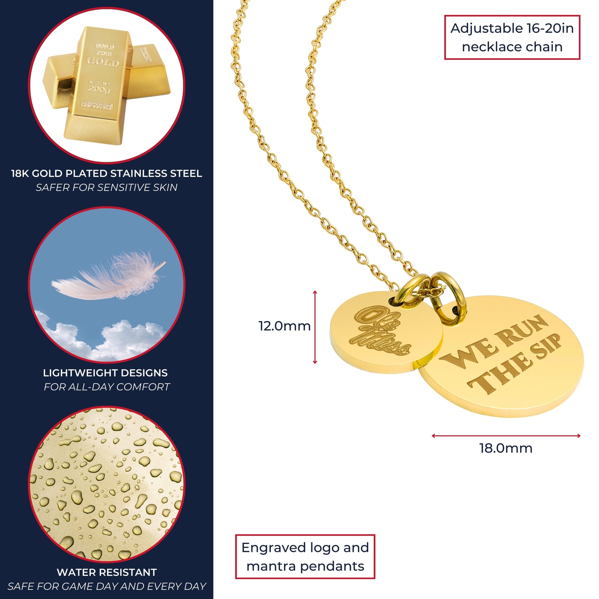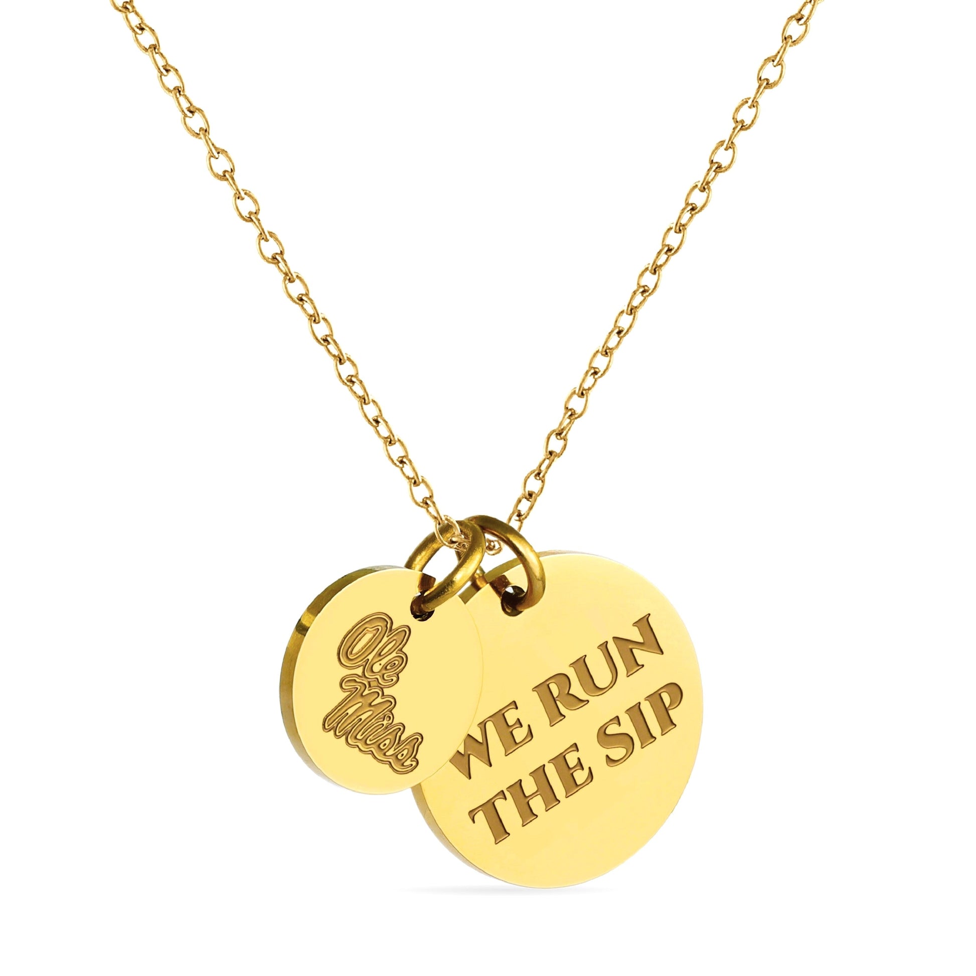 Proudly display your Ole Miss Rebels pride with this officially licensed Ole Miss necklace, featuring two gold-plated pendants engraved with the iconic script Ole Miss and the inspiring mantra, 'We Run the Sip This pendant necklace, made from surgical-grade stainless steel and coated in 18K gold, offers both durability and elegance. Its adjustable length (16-20 inches) makes it perfect for everyday wear or Ole Miss game day. Whether you're attending a game or gifting it for a special occasion, this necklace is ideal for Ole Miss fans, students, and alumni. It makes a thoughtful present for birthdays, Mother’s Day, graduations, Christmas, any other celebration. Packaged simply yet beautifully, this necklace arrives ready for gifting, ensuring it will delight any Ole Miss fan