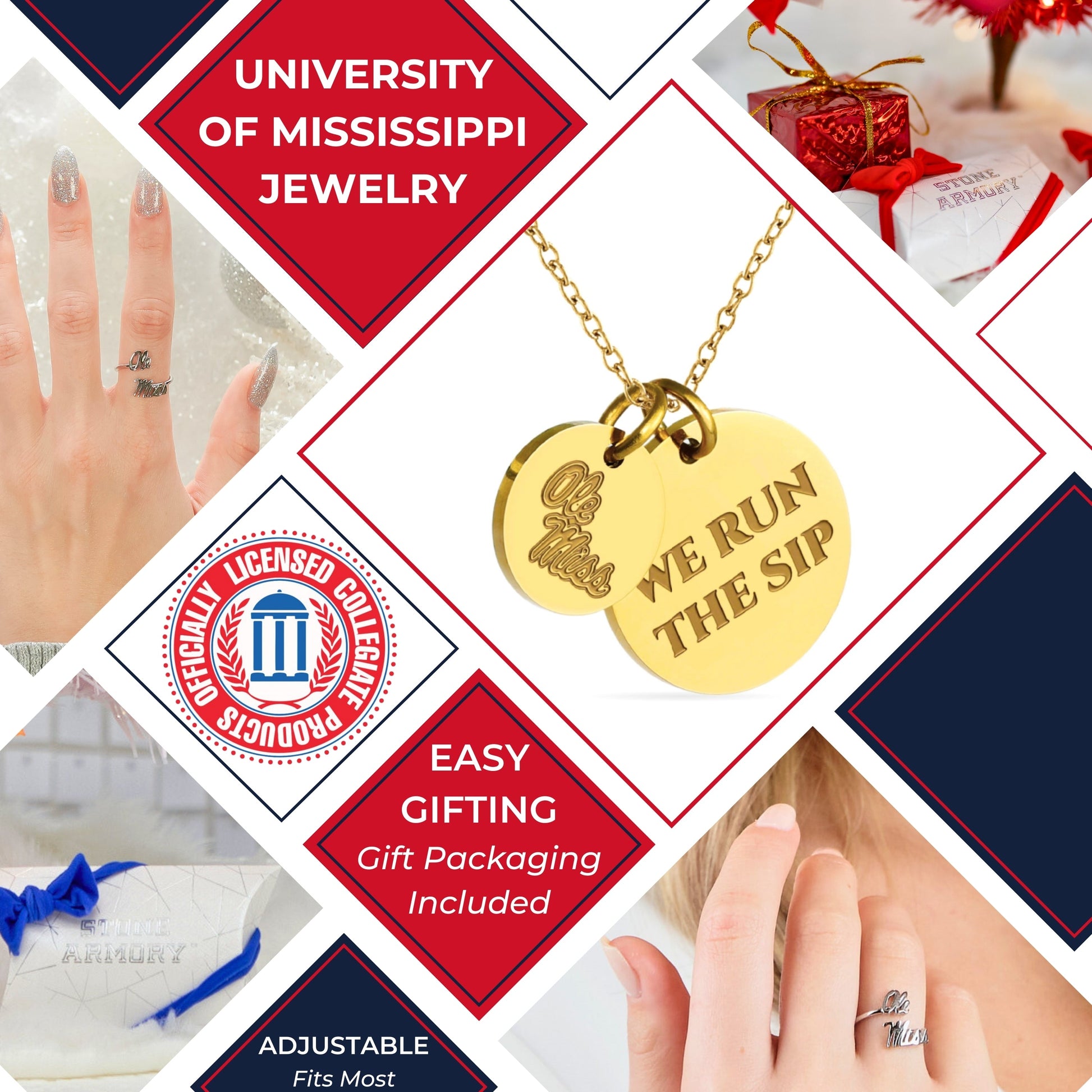 - Express Your Ole Miss Rebels Spirit Every Day: This officially licensed Stone Armory University of Mississippi necklace features 18K gold-plated pendants engraved with the iconic script Ole Miss and the mantra 'We Run the Sip.' Designed for both casual and game-day wear, this adjustable necklace (16-20 inches) makes the perfect gift for Ole Miss fans, students, and alumni