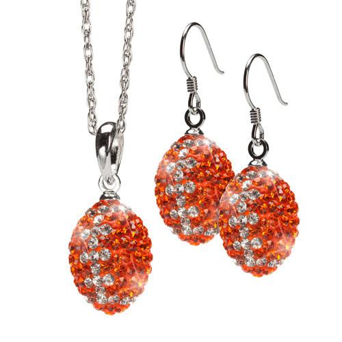 Add this two piece jewelry set to your football collection! Includes a pair of crystal football pendant earrings and a charm pendant with necklace chain. Made of Austrian crystal. Charm pendant can also be worn on most charm bracelets including Pandora, Chamilia and Stone Armory.