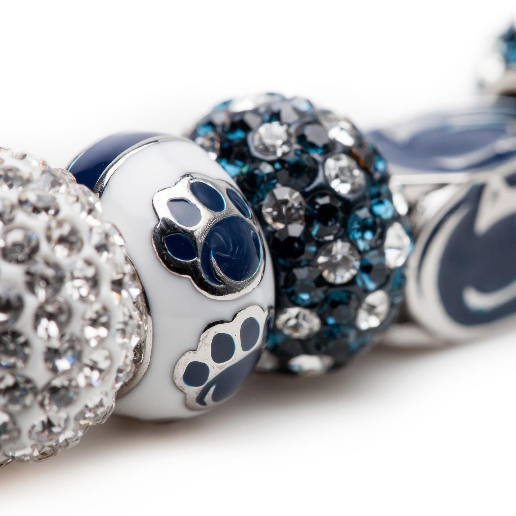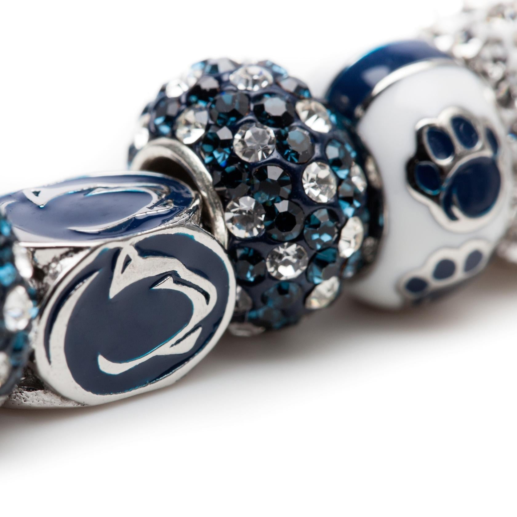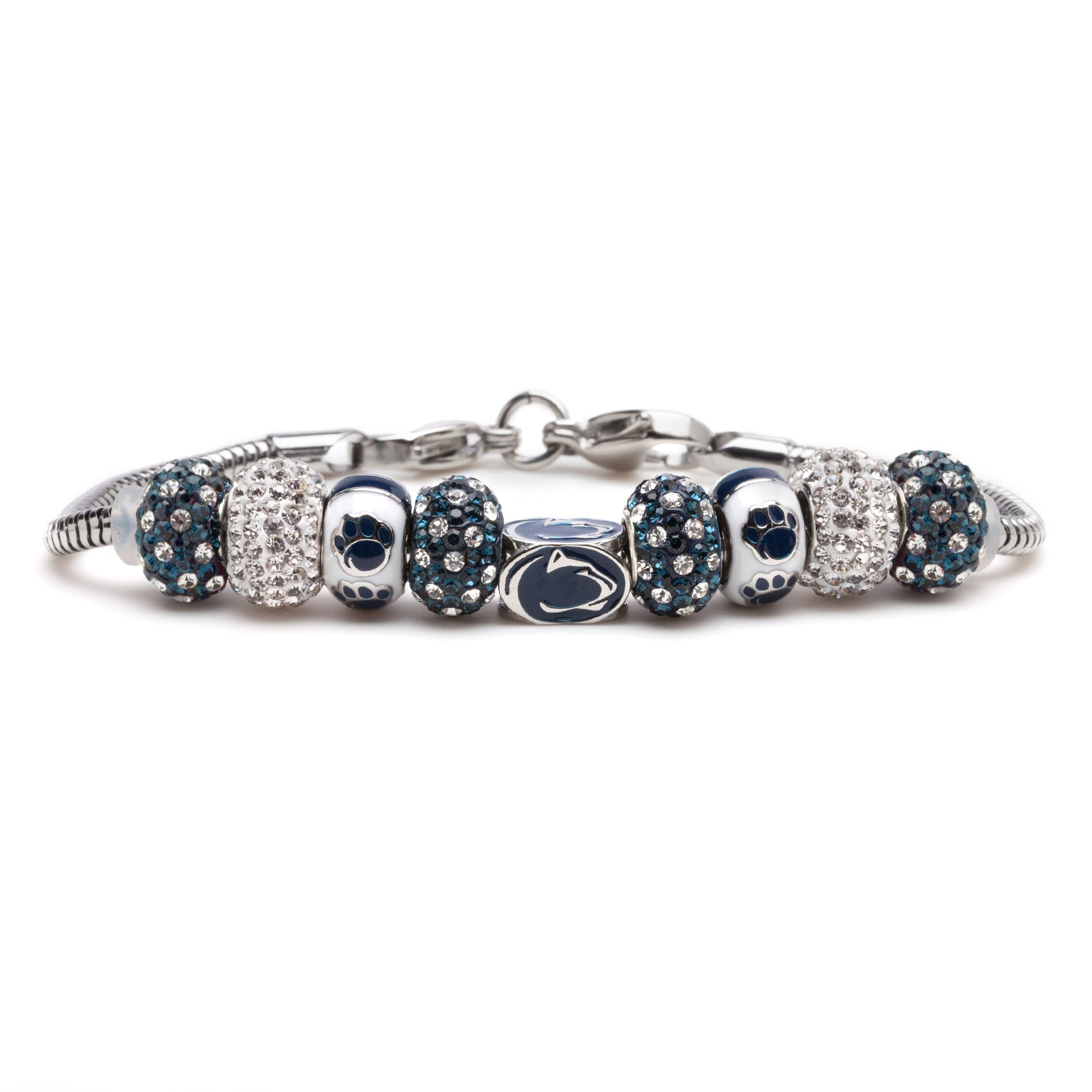Gear up for the game! This Penn State Nittany Lions bead charm bracelet includes 3 PSU bead charms, 6 austrian crystal charms in white and navy, and a bracelet chain. Penn State bead charms and bracelet chain are made of high quality stainless steel. Product lifetime guarantee. Officially licensed by Pennsylvania State University. Ships within 24-48 business hours. Free return shipping if necessary.