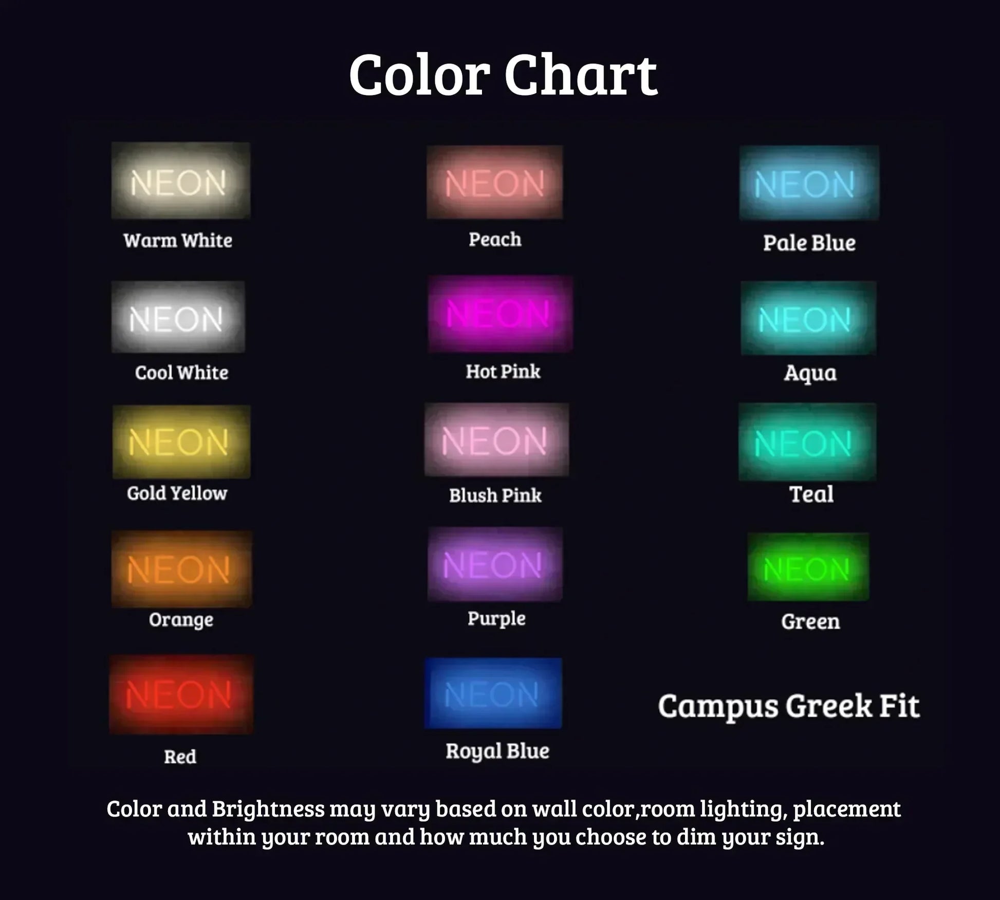 Color and Brightness may vary slightly based on wall color, room lighting, placement within your room and how much you choose to dim your sign. Sample sign shown is Teal. Mockup shown is for sample lifestyle image representation only.