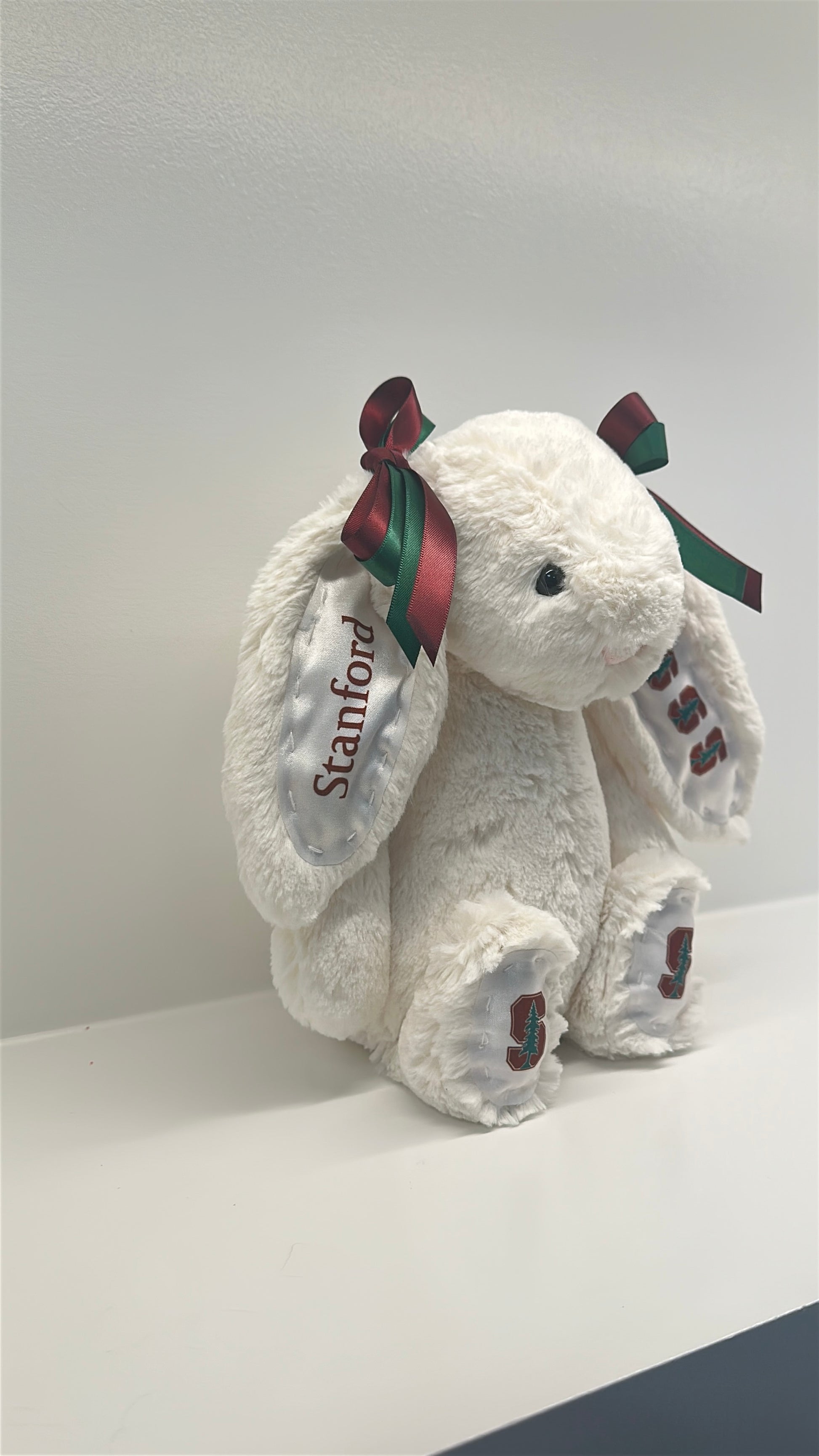 Snuggle up with this Custom College Jellycat Bashful Bunny. Each plush is adorned with custom fabric for Stanford University, featuring coordinated ears, feet, and matching bows that bring your university’s colors and spirit to life. This adorable plush makes the perfect gift for newly accepted students, homesick college kids, devoted fans, alumni, and anyone who wants a cozy reminder of campus life.