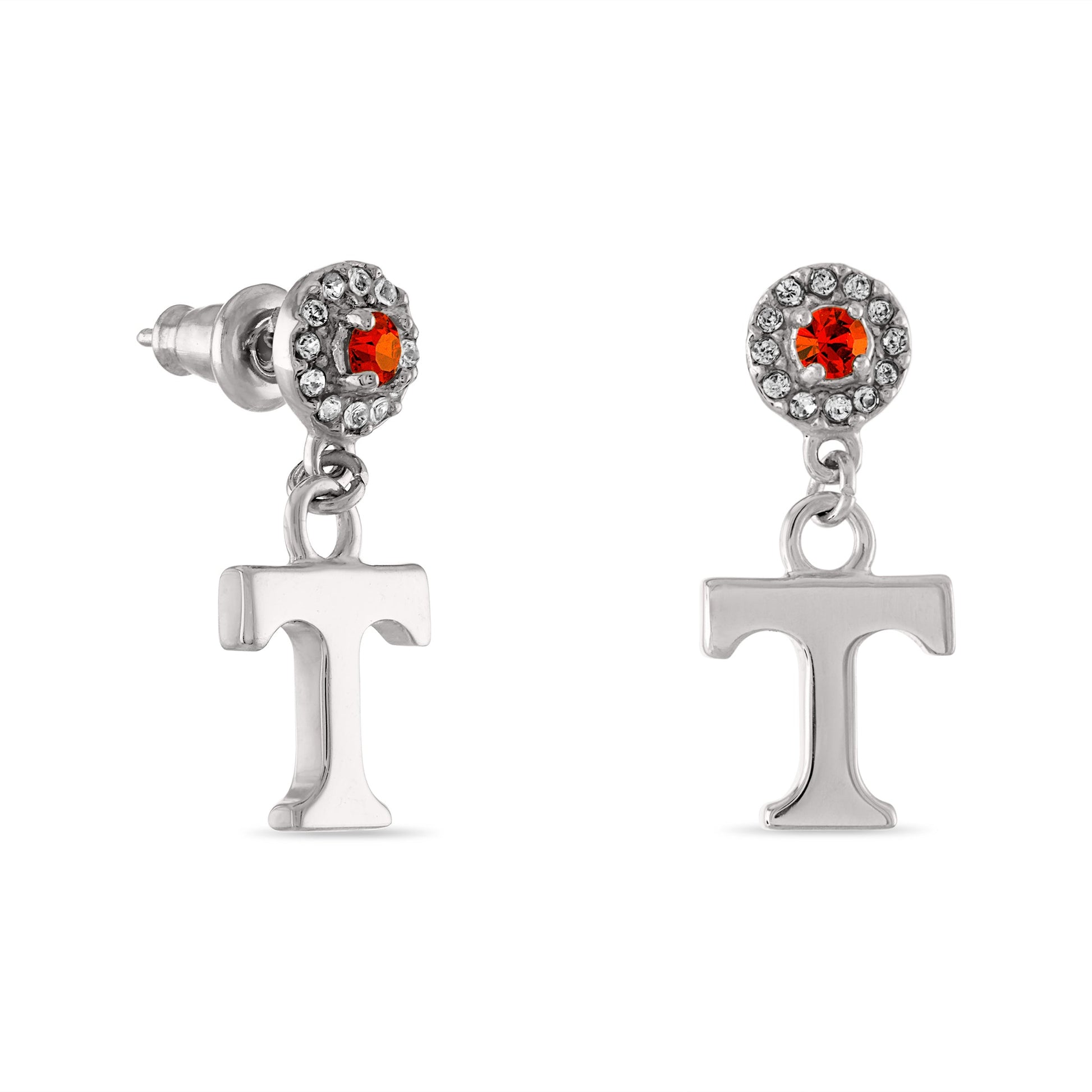 - Treasure Your Tennessee Vols Spirit - These Stone Armory University of Tennessee earrings are full of Volunteer pride! Featuring a stainless steel Power T pendant dangling from Tennessee orange and clear crystals, these classic Vols earrings are just as unique as you. Go Vols!