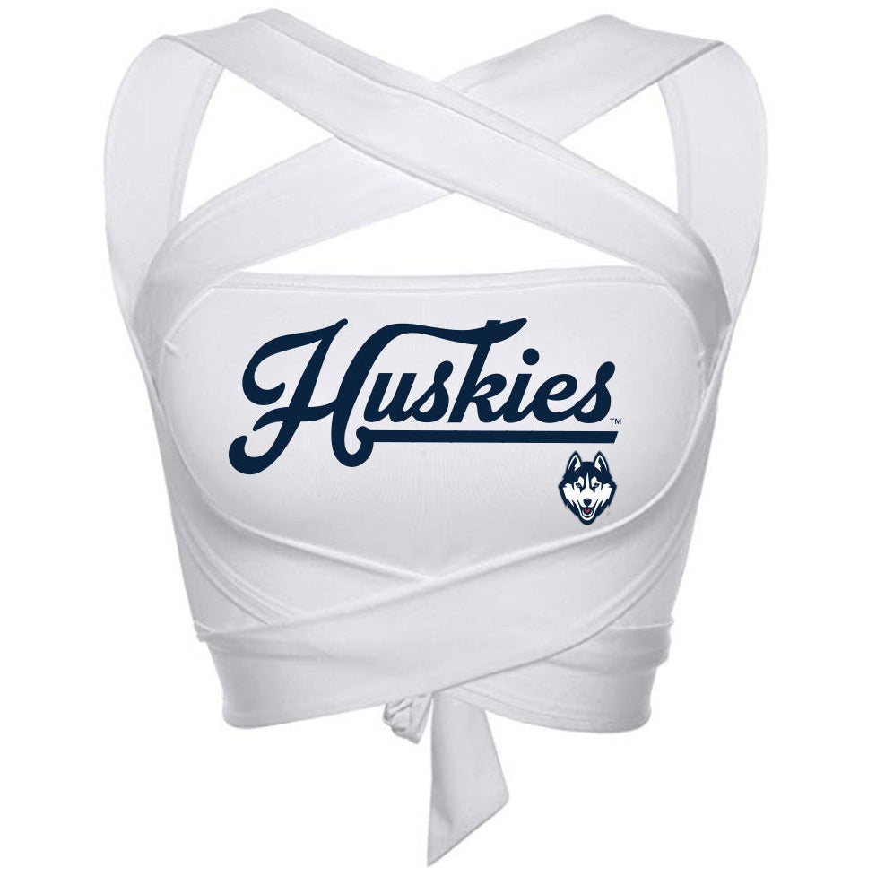 This super flattering UConn Multi Way Bandeau is perfect for college game day! Our UConn White Multi Way Bandeau has the most comfortable cotton fabric. Lightweight and Comfortable. Our 12 in 1 Top - adjustable straps make this top the perfect option and it can be worn multiple ways! Go Huskies!