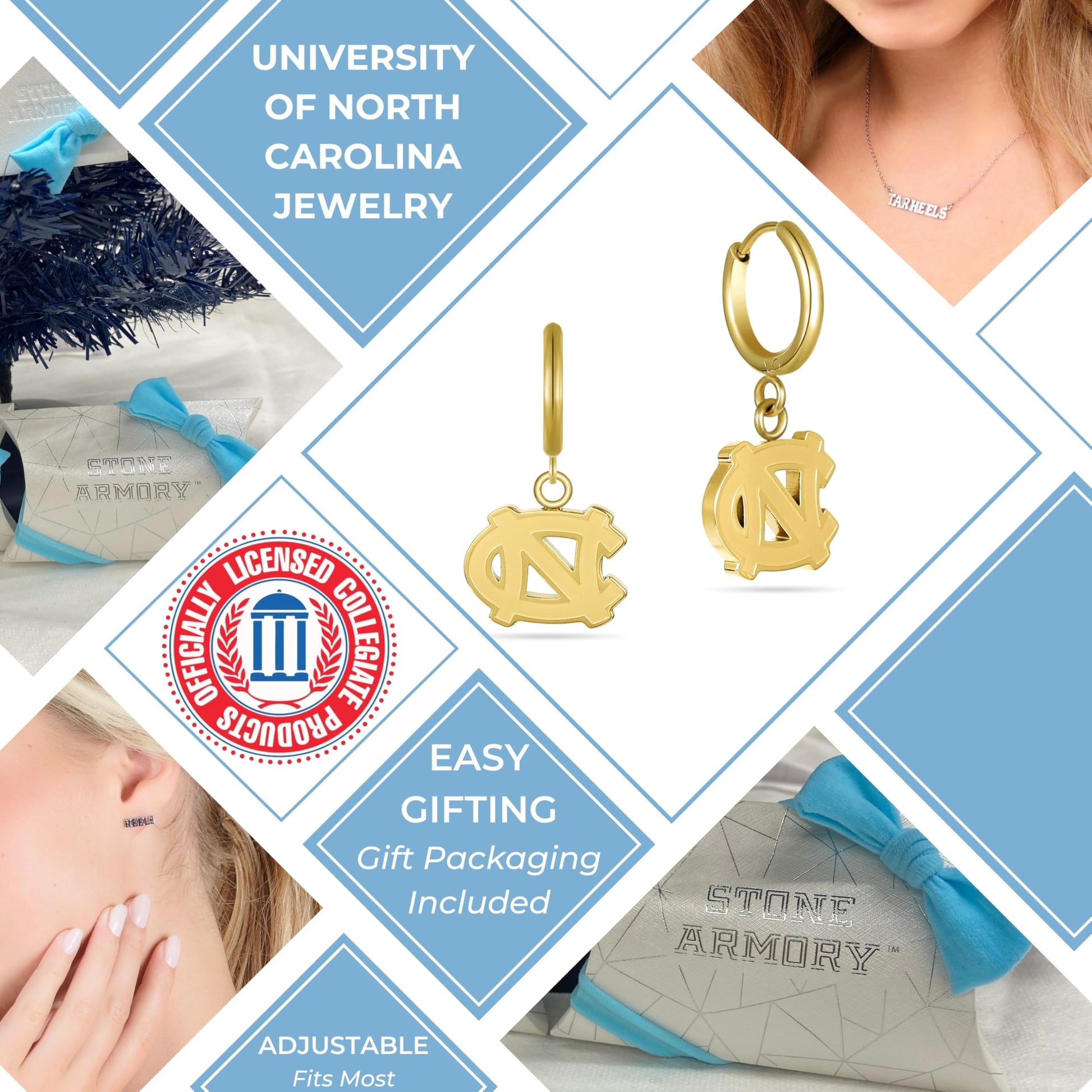 Stone Armory's North Carolina NC Huggie Hoop Earrings are Here Gear up for the game with these North Carolina Tar Heels huggie hoop earrings, featuring a NC design. Perfect for tailgates or casual outings, these earrings let you proudly display your University of North Carolina spirit wherever you go. Crafted from stainless steel, these lightweight earrings are designed for sensitive ears, providing all-day comfort. They make an ideal gift for women, students, graduates, and North Carolina fans. Celebrate North Carolina graduation, birthdays, Mother's Day, the first day of school, or wear them to the first game and beyond. Add these versatile earrings to your North Carolina fan wear collection for everyday style. Thank you for supporting our small business with this officially licensed North Carolina jewelry.